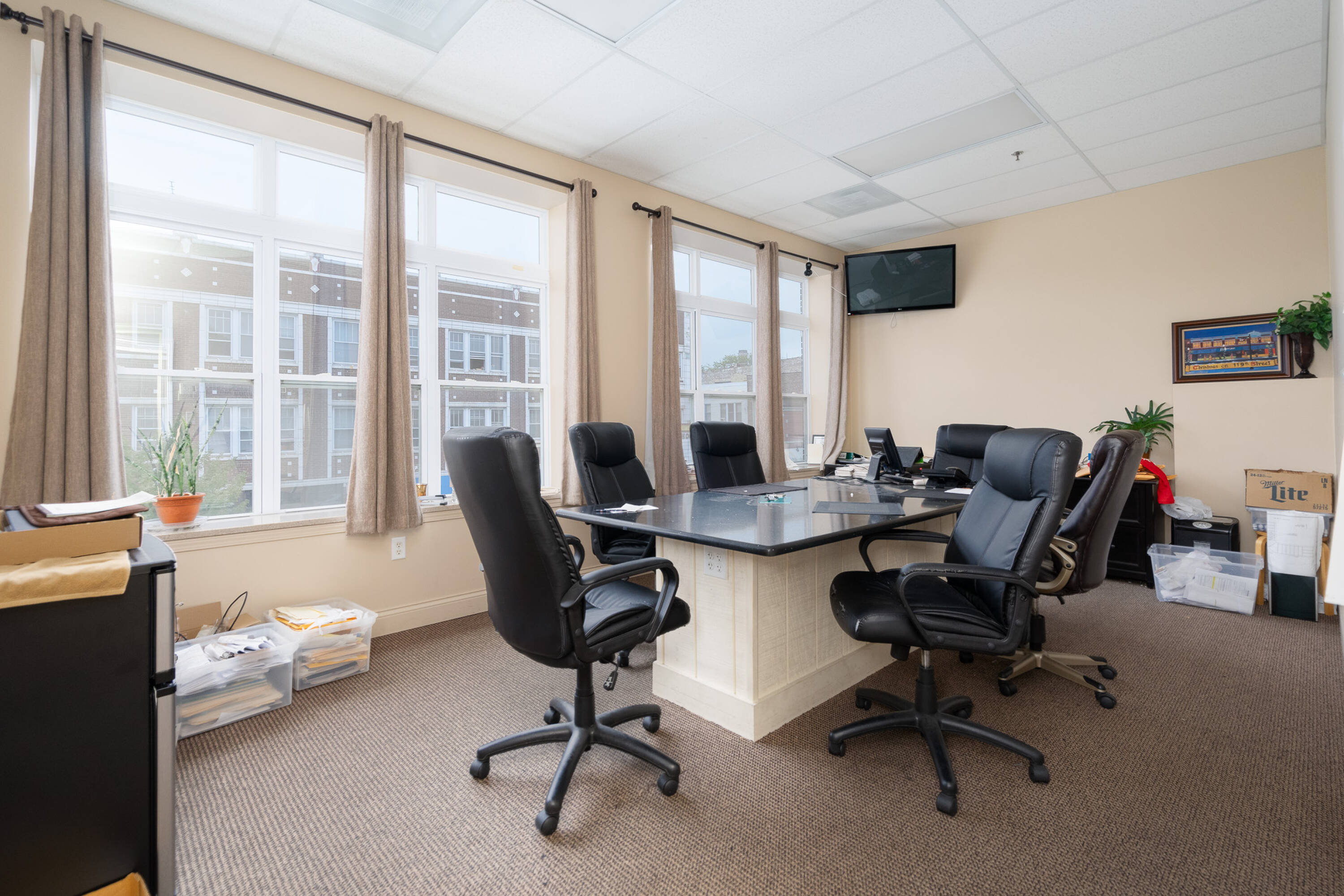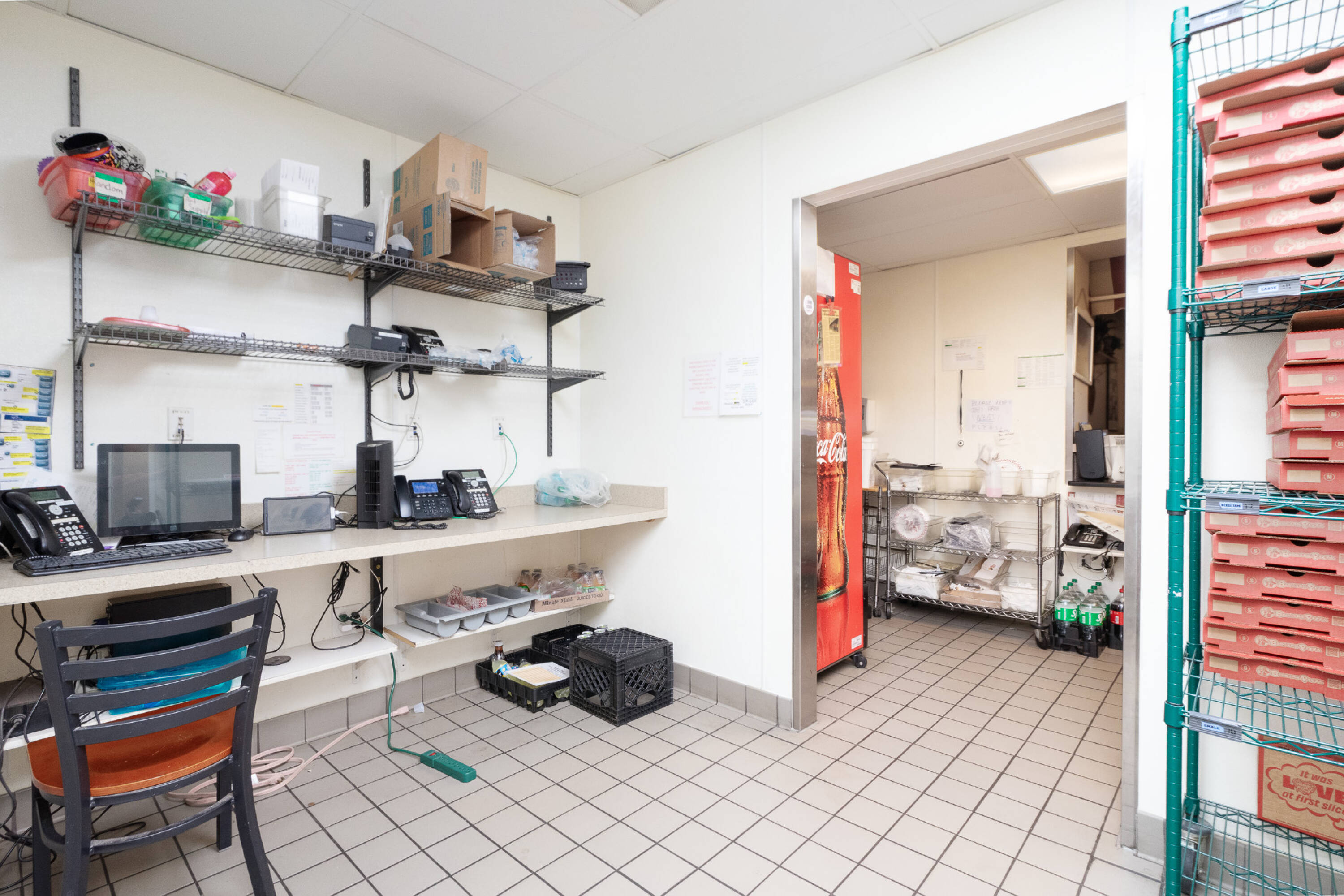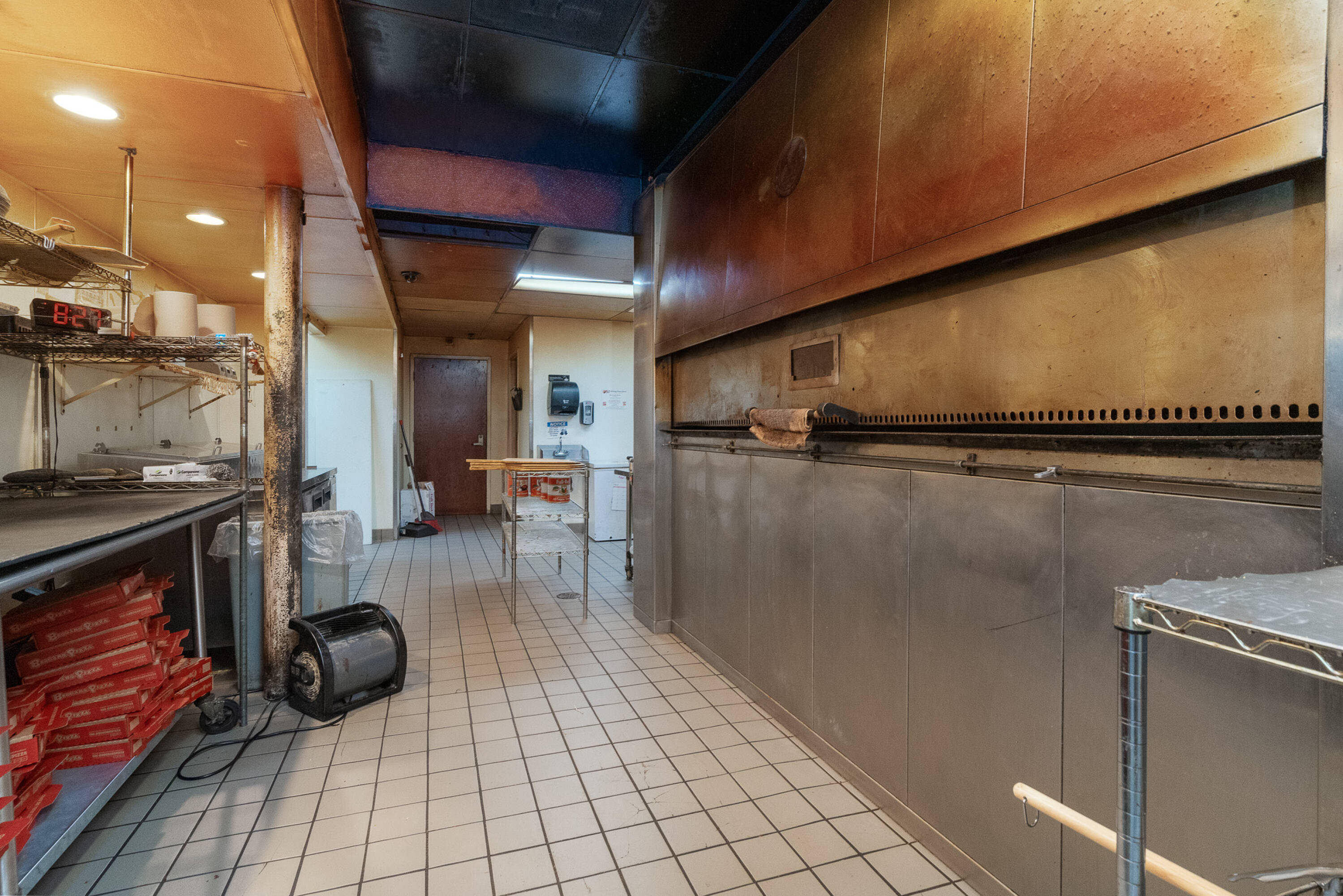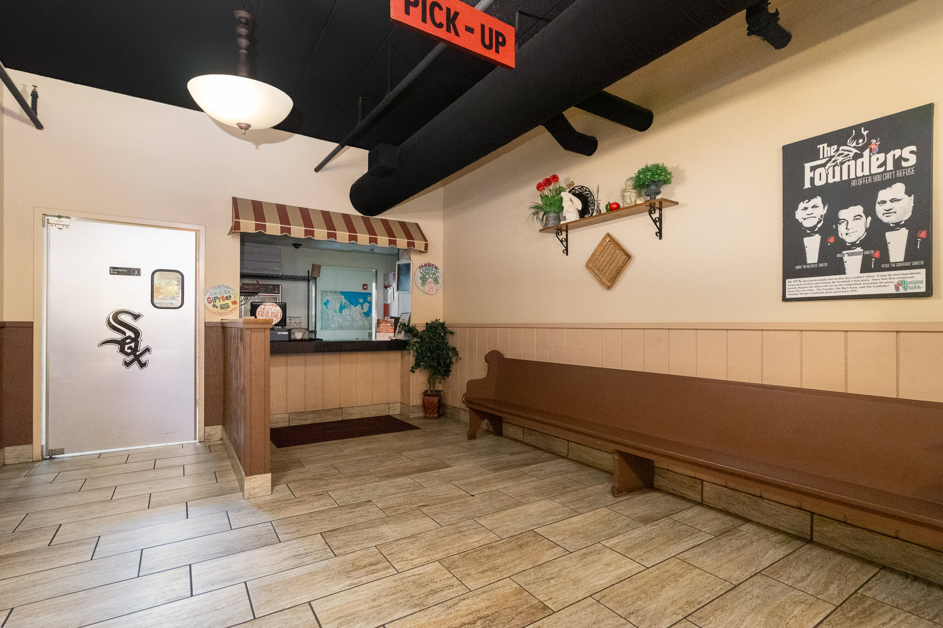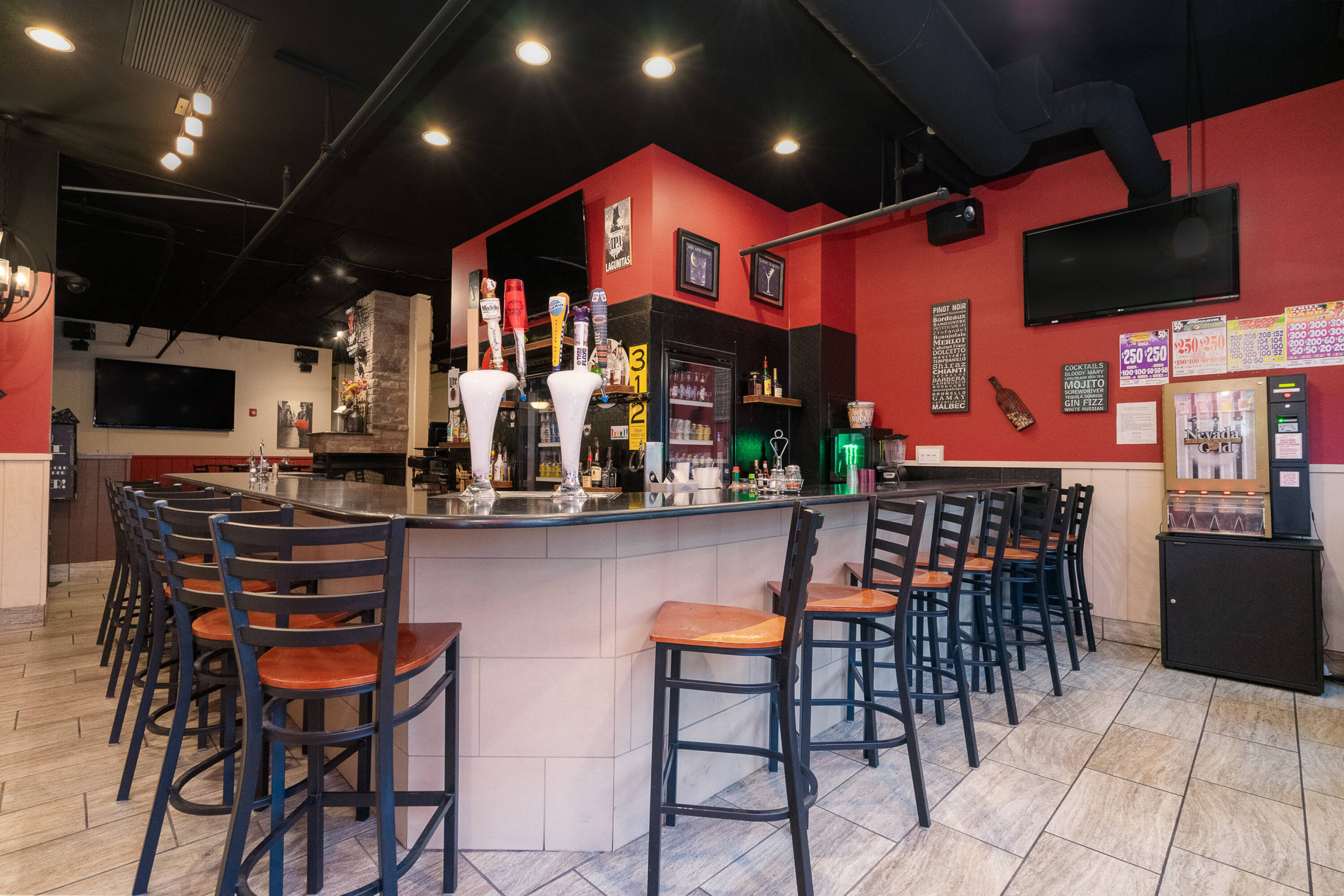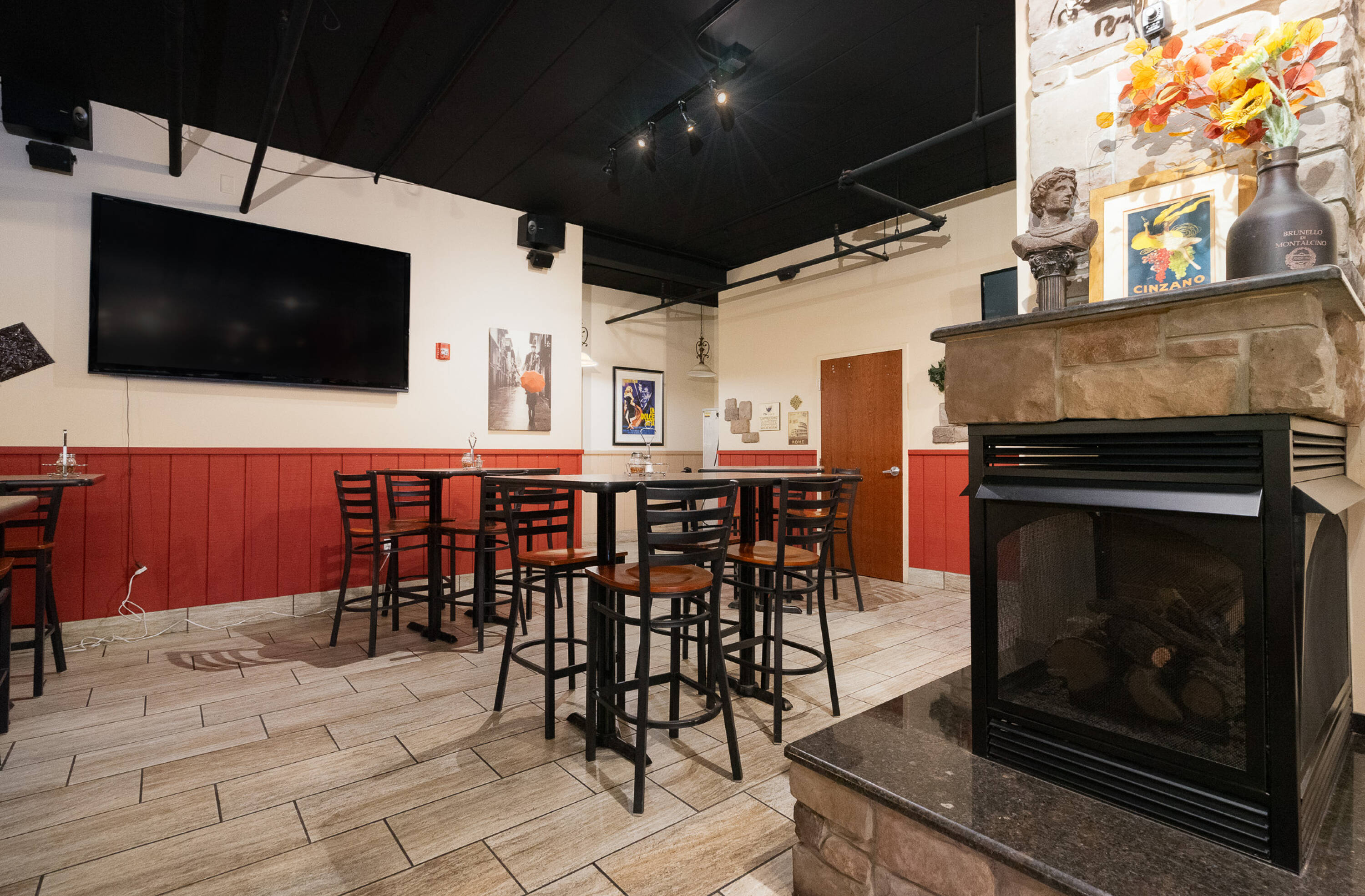 Spacious restaurant with party room, bar, and office space.