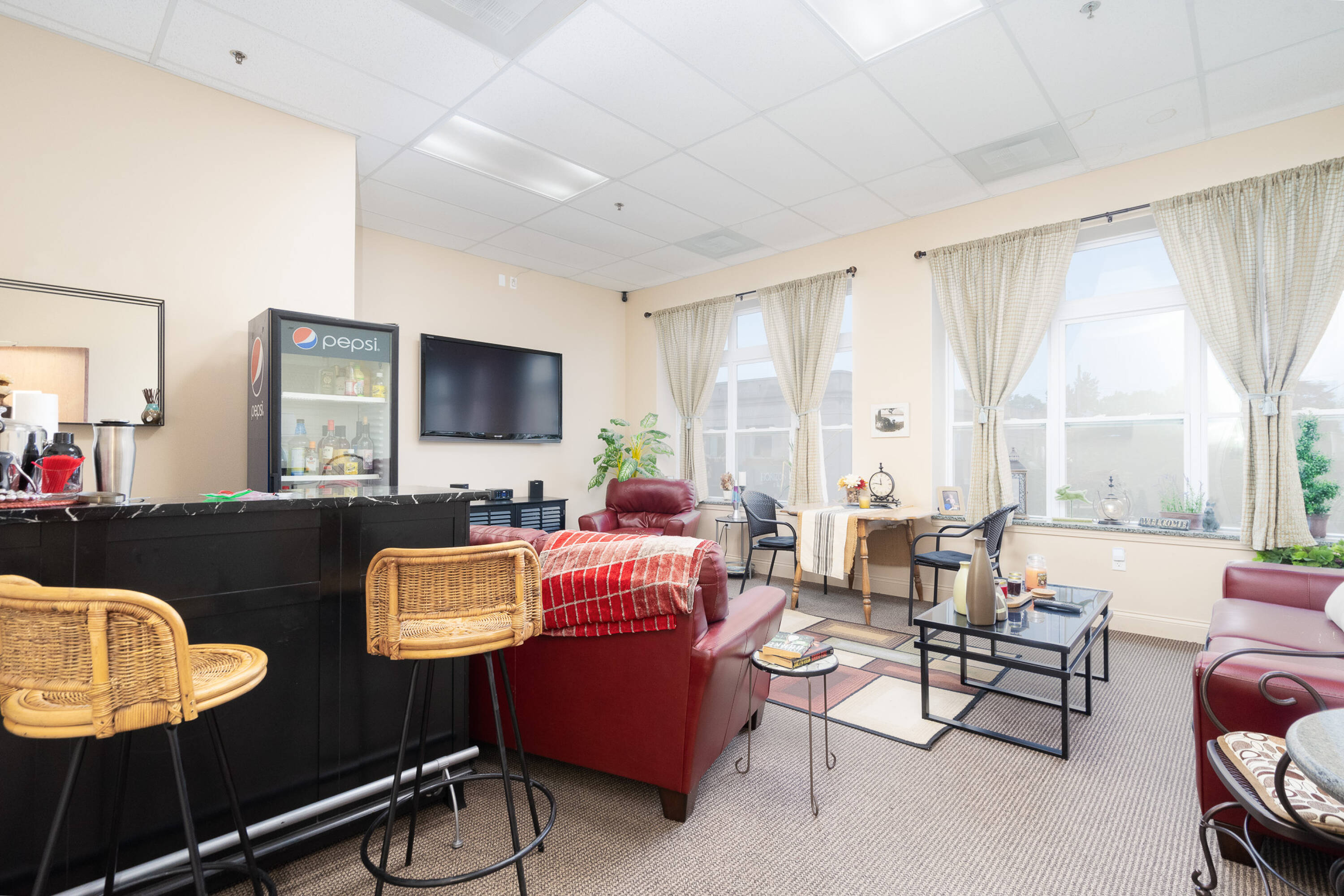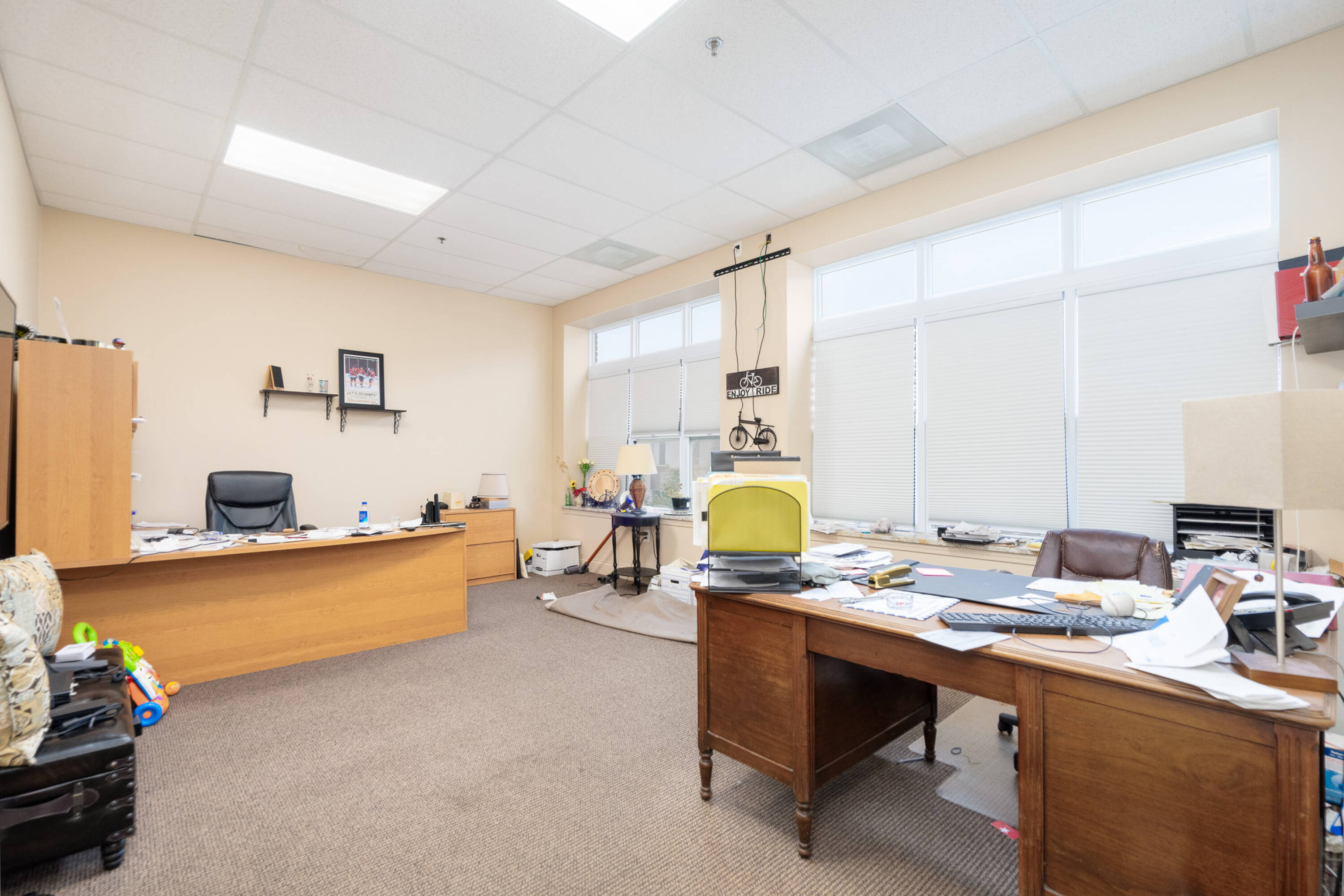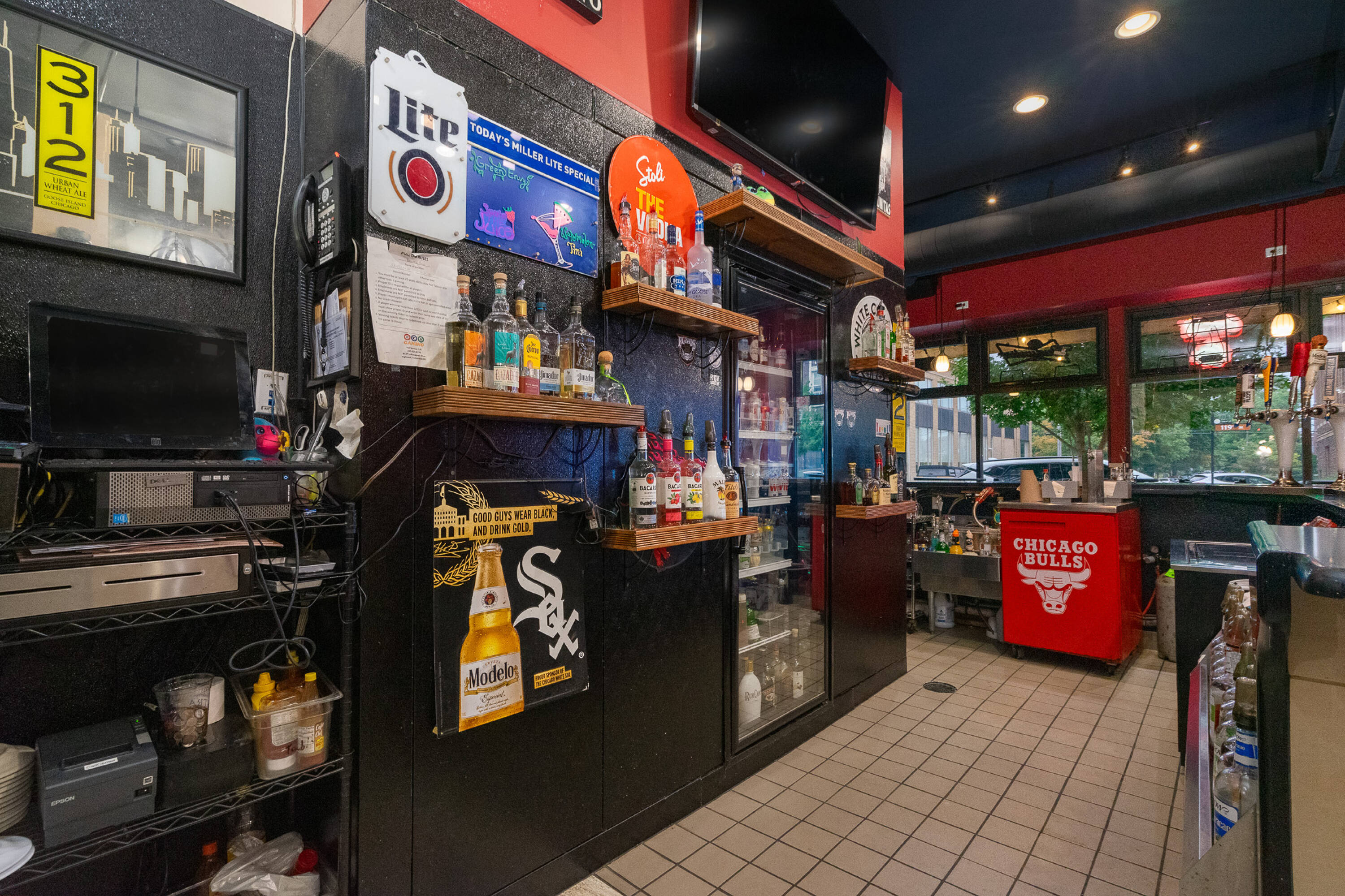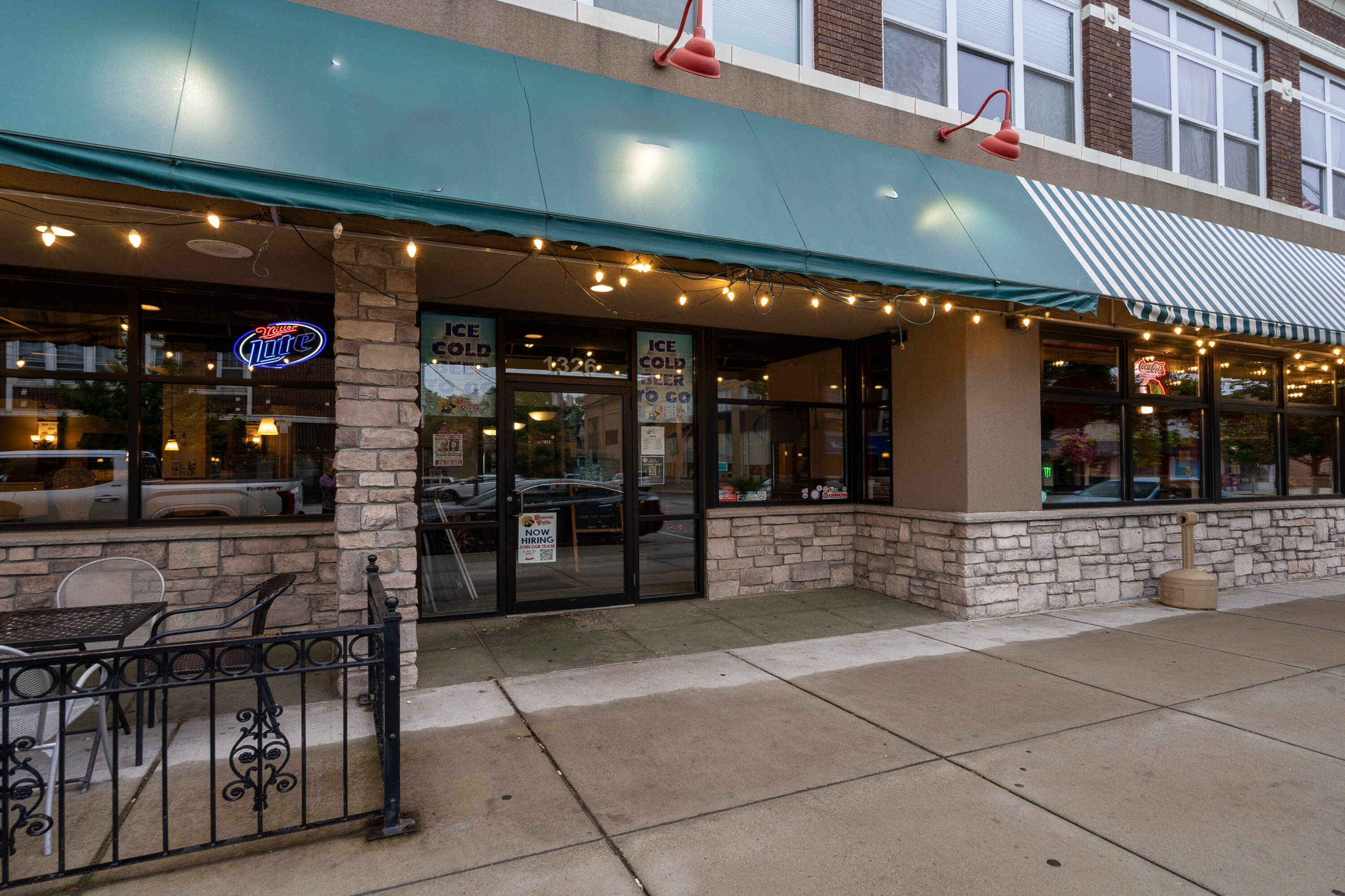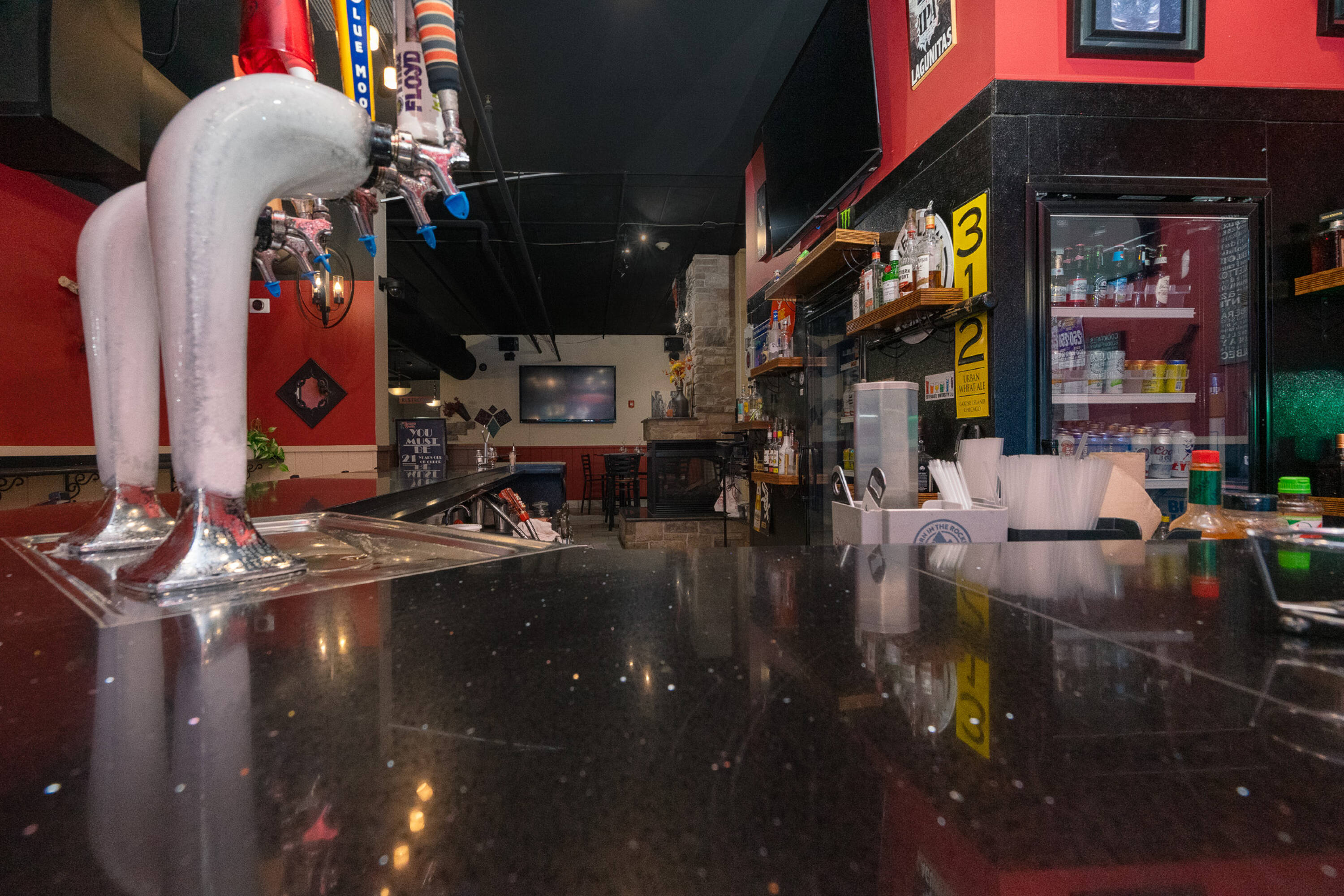 Spacious restaurant with party room, bar, and office space.