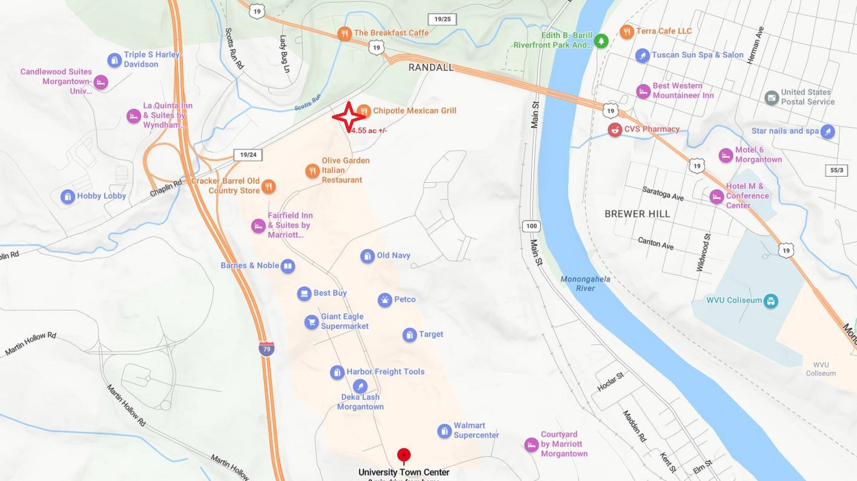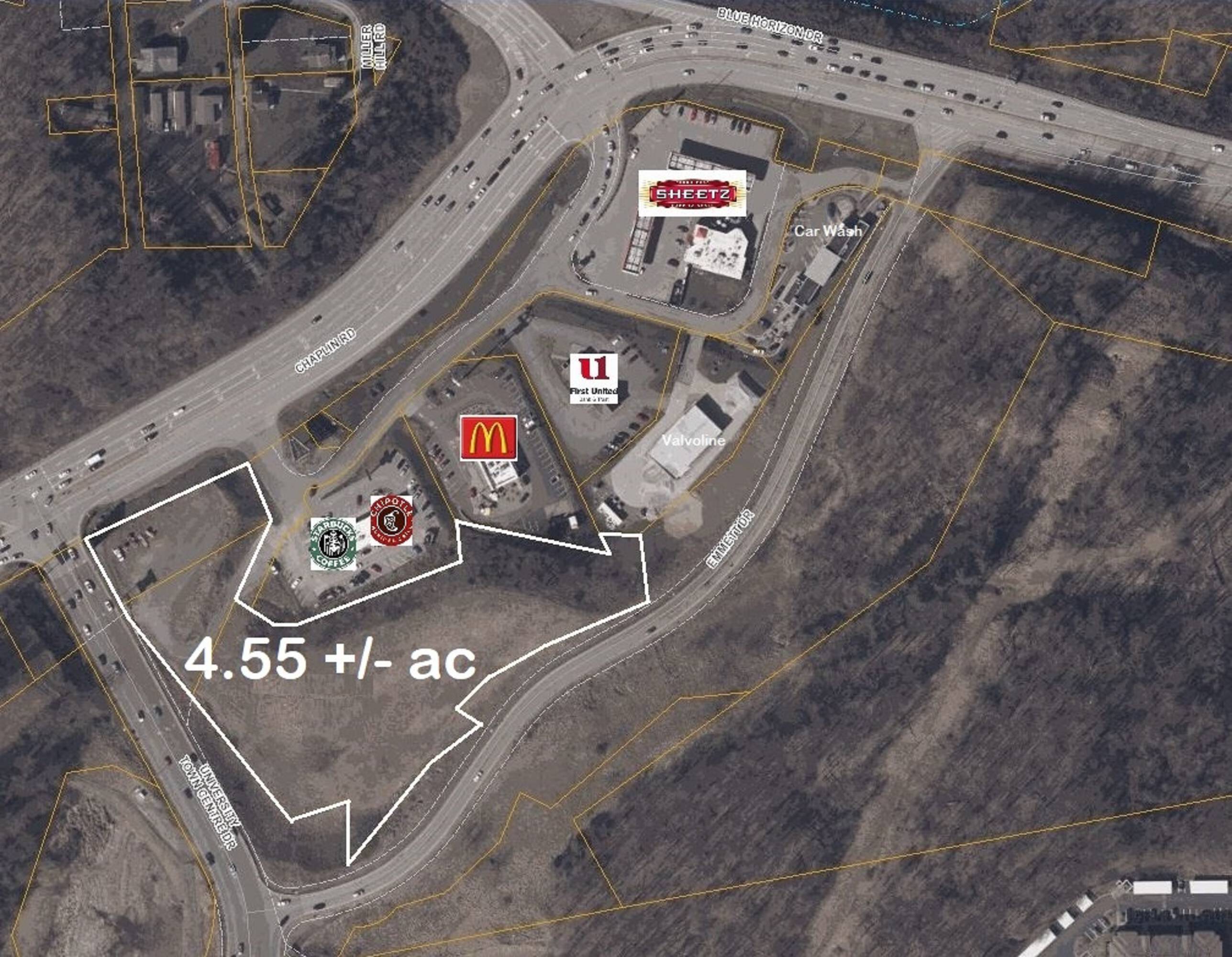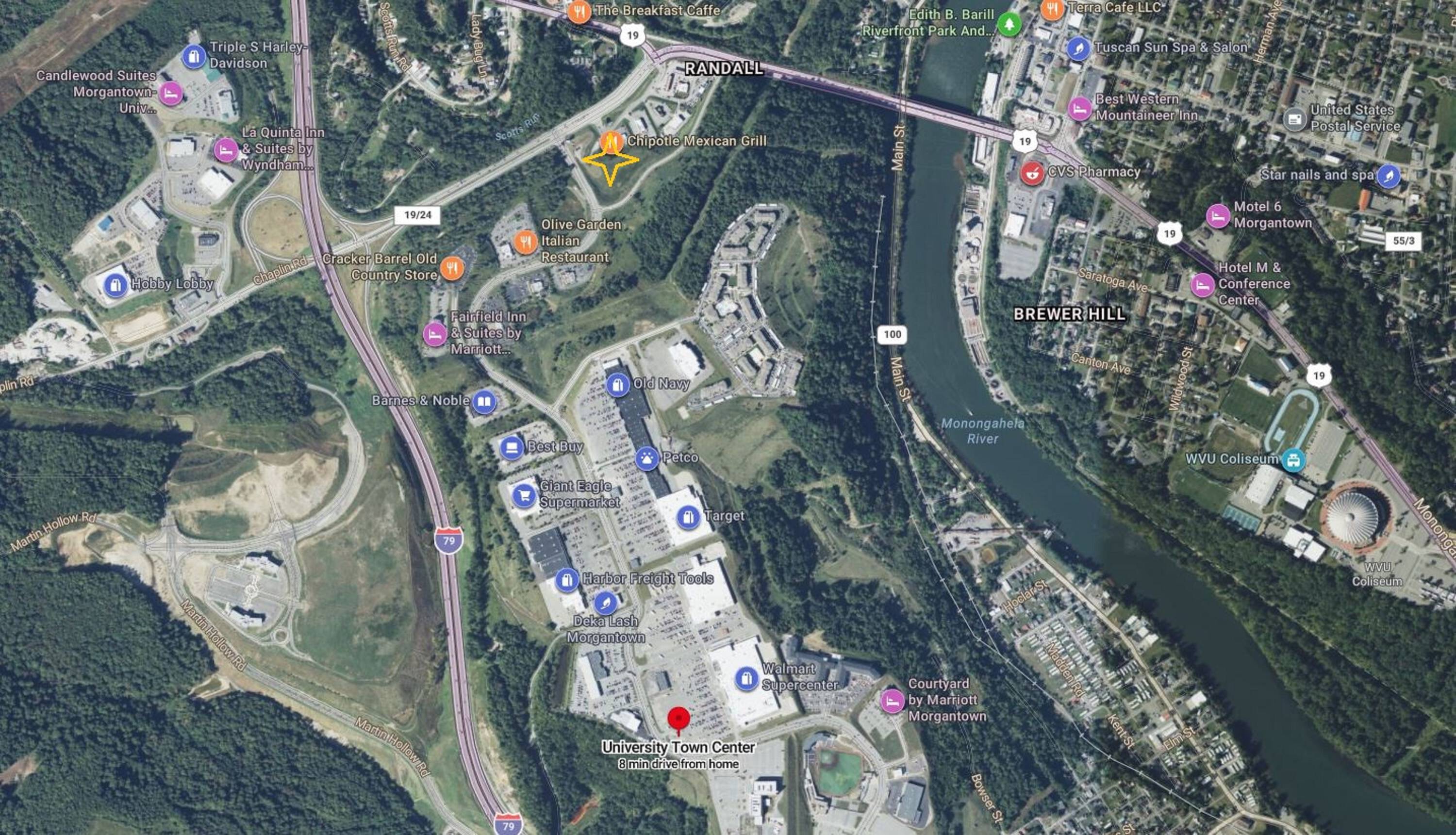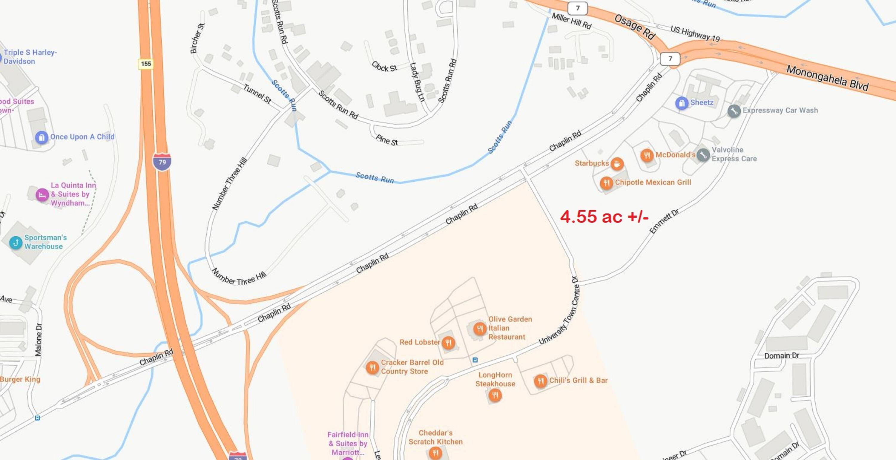 This 4.55+/- acre commercial site is available for development. The property is mostly level and has all utilities available. Located at the entrance to the University Town Center, the site experiences high traffic. Situated outside of city limits, the property is not subject to zoning regulations or B&O taxes. Potential uses include hotel, restaurant, retail, and fast food establishments. The property is located in an SBA HUB Zone and a West Virginia Tax Incentive Financing (TIF) District.