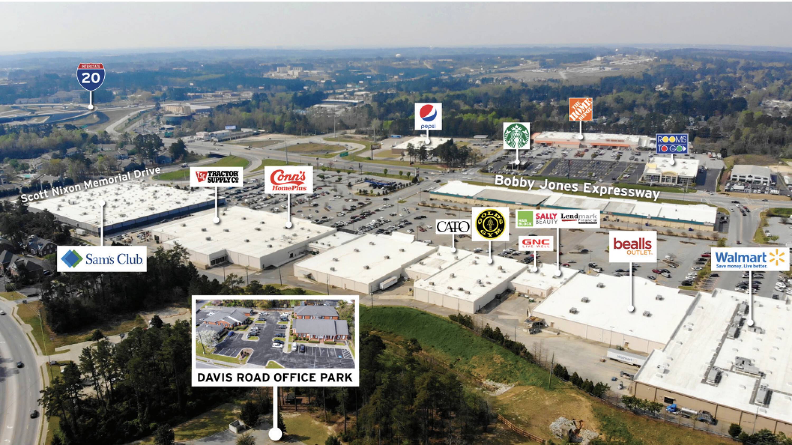 Modern business spaces near Interstate 20 and Washington Road.