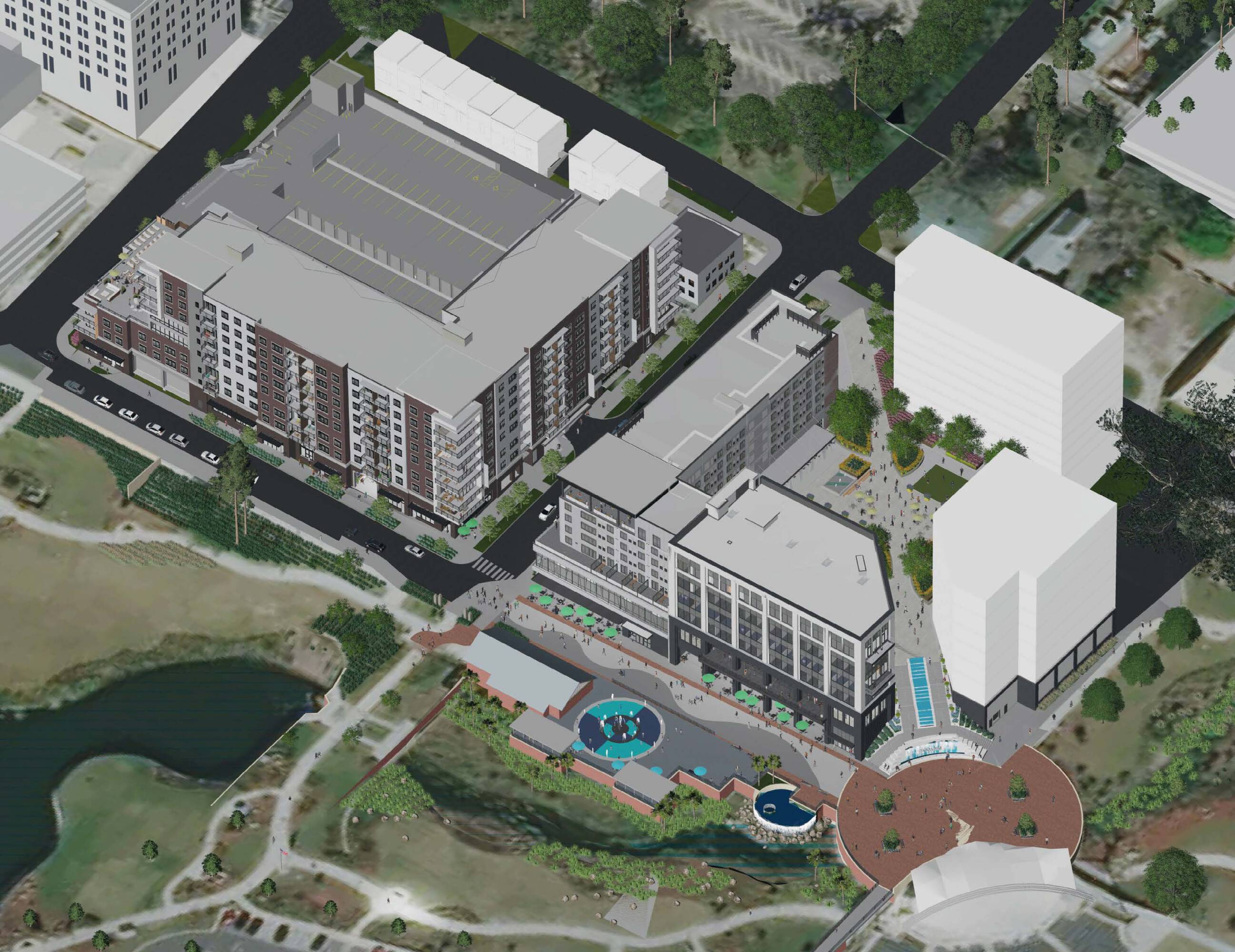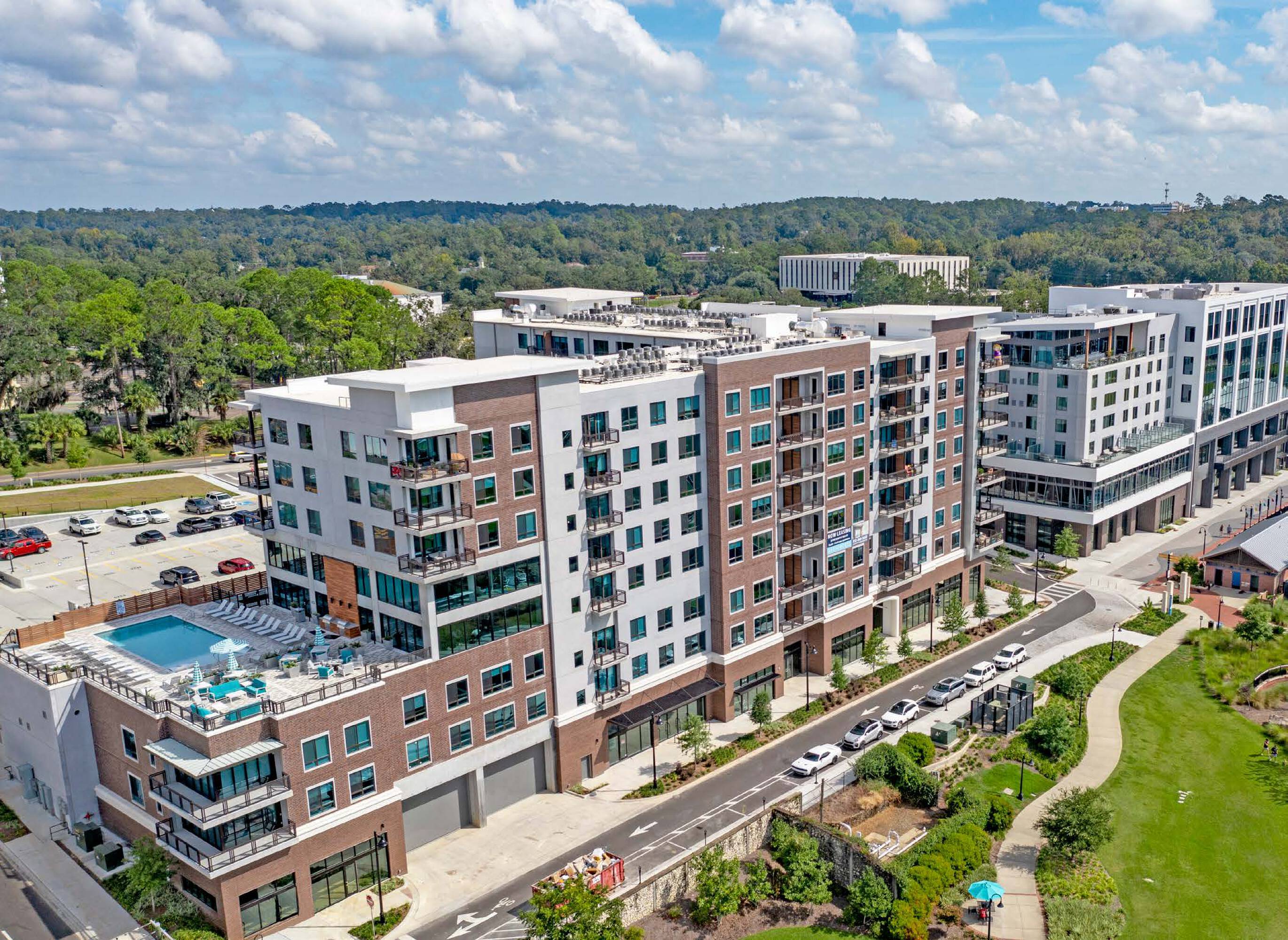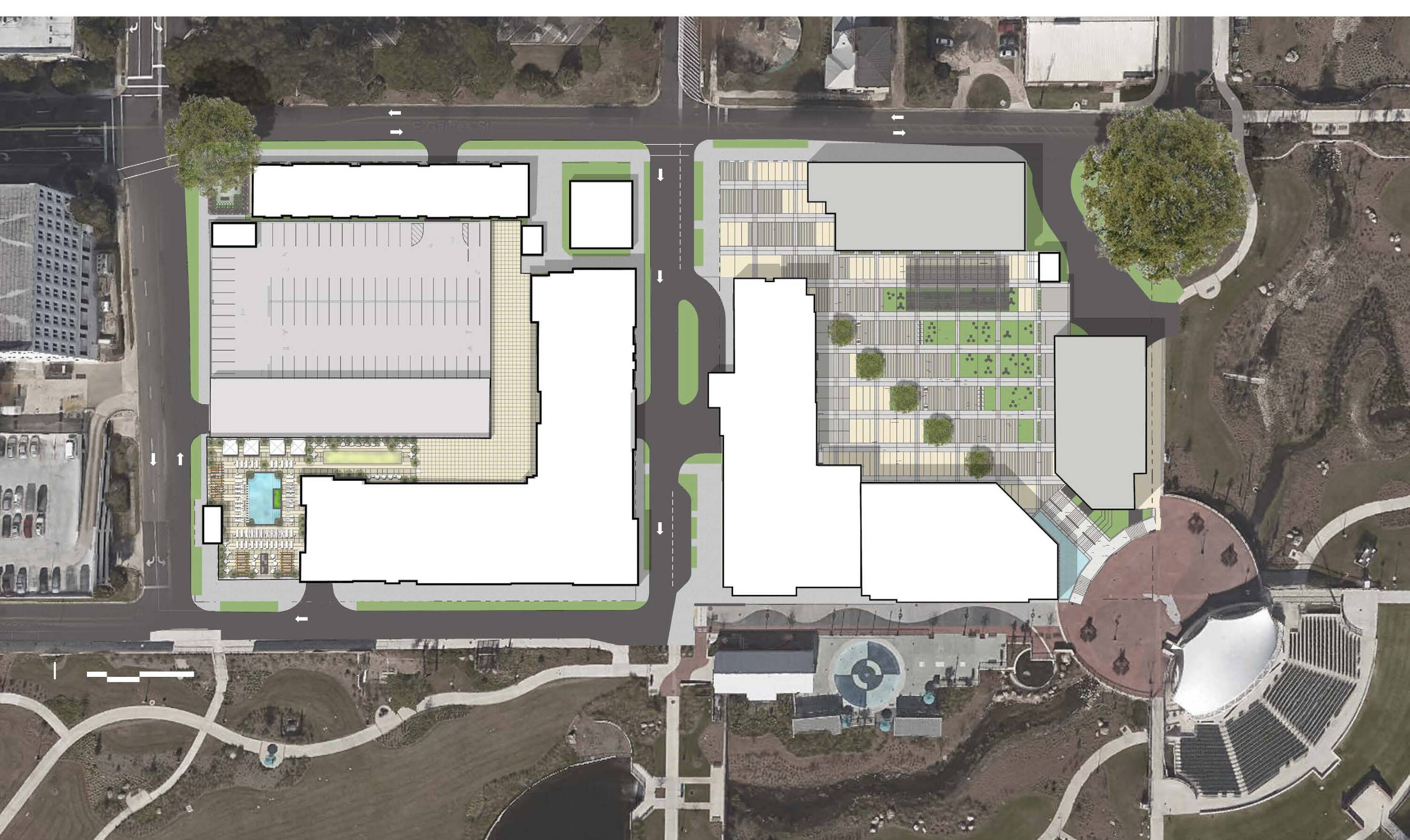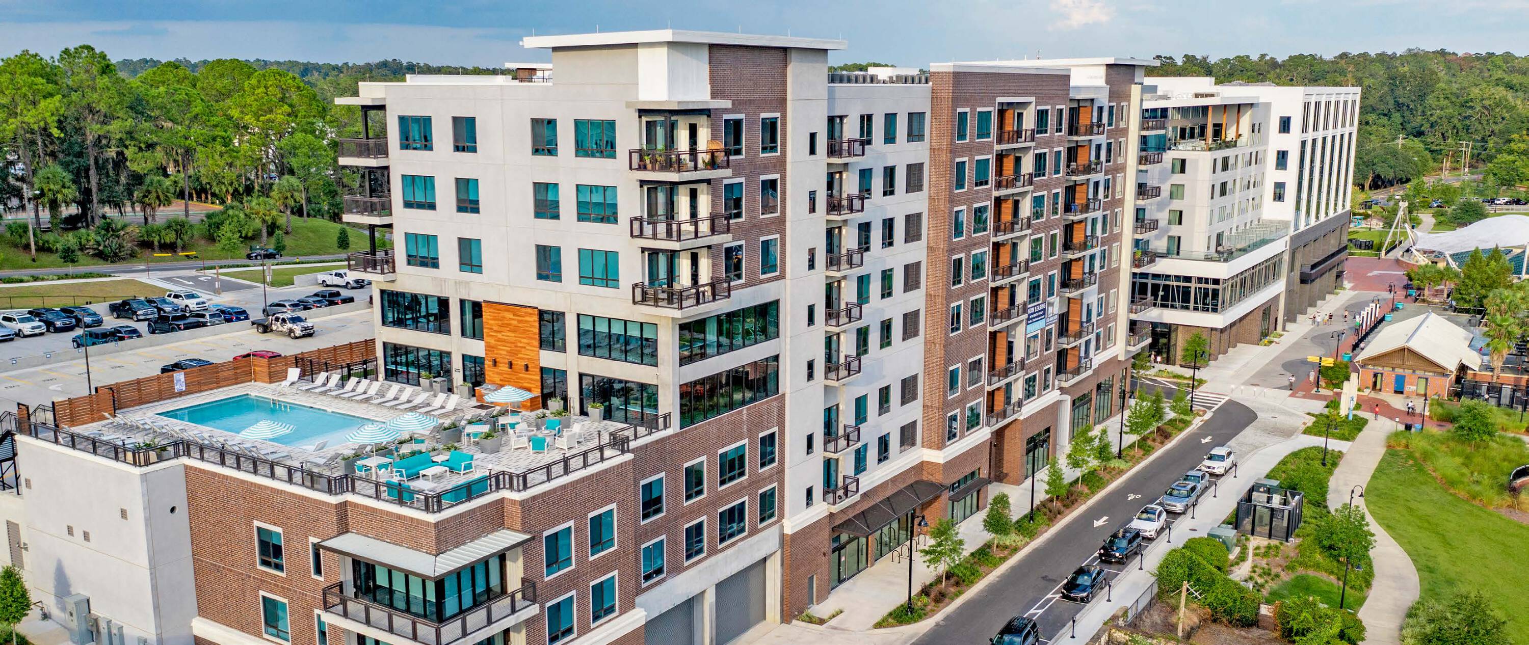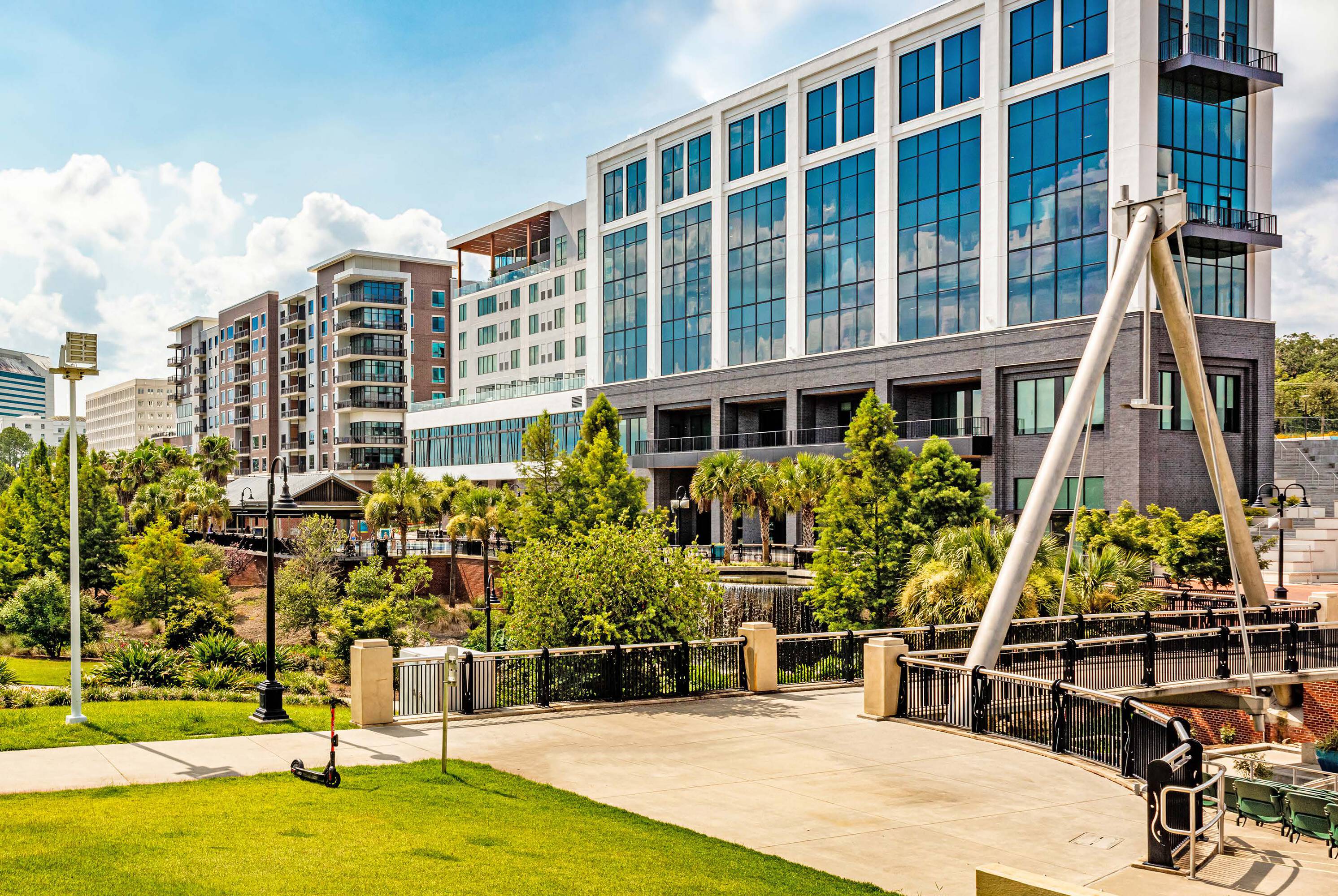 Dynamic development with retail, office, restaurants, and hotel spaces.