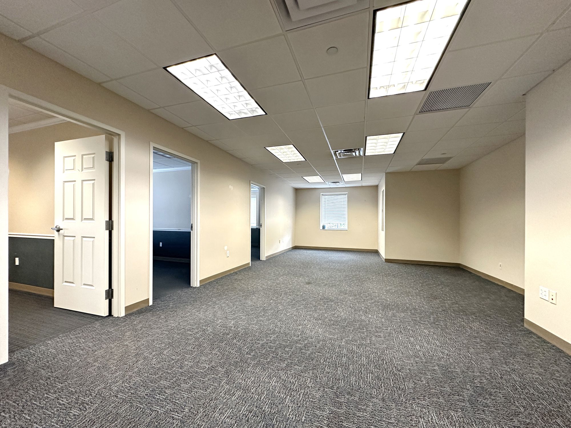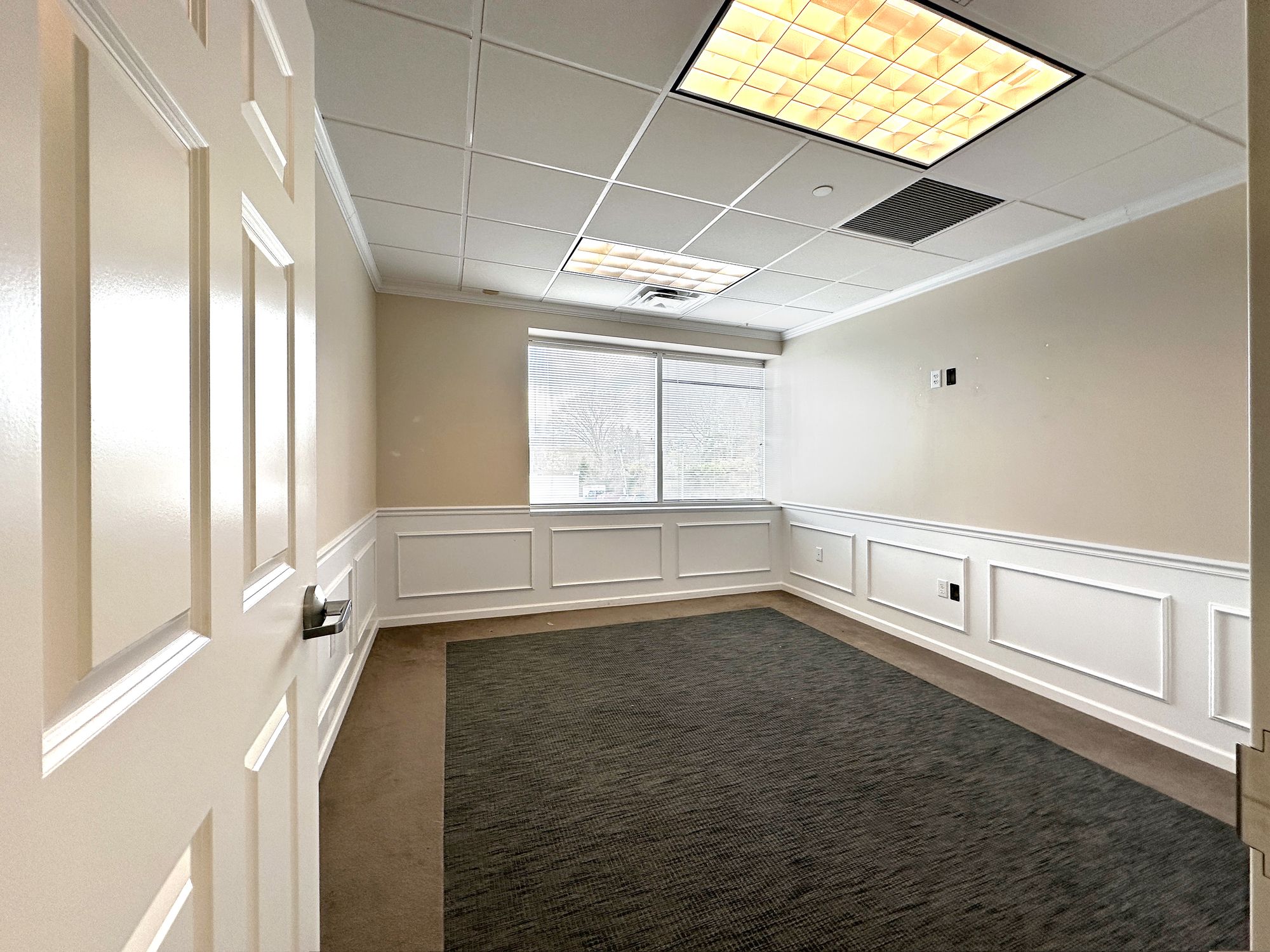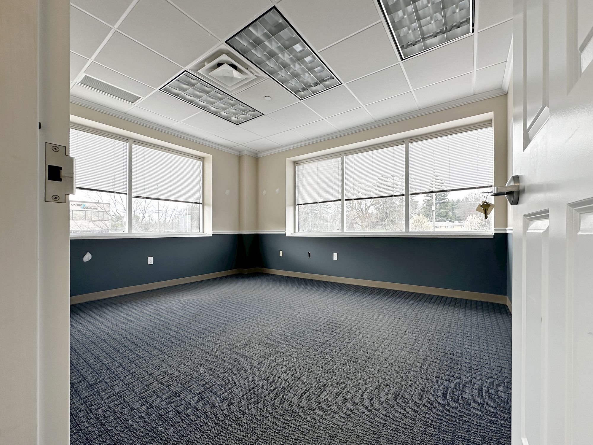 Second floor office space with natural light and on-site parking.