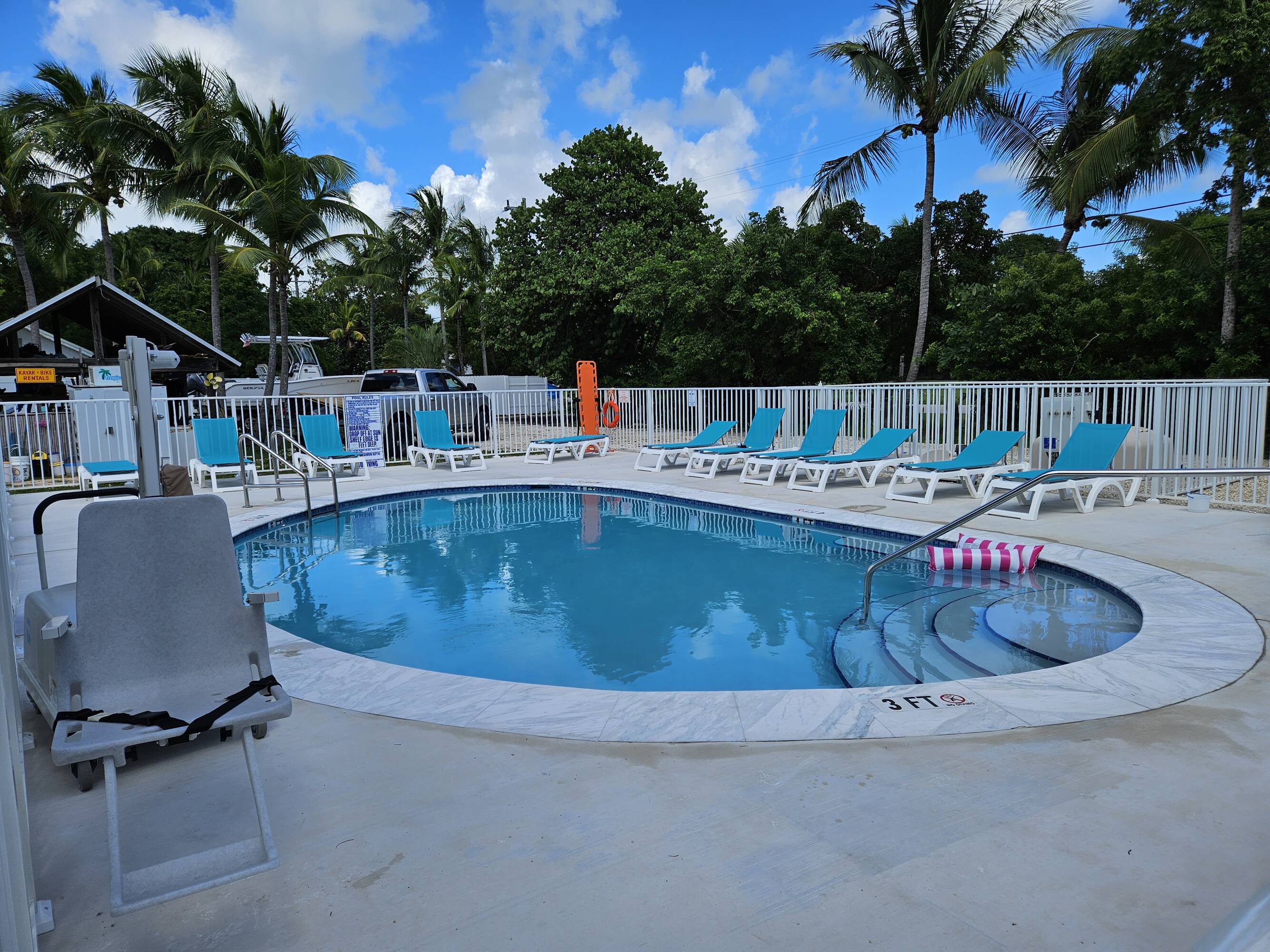 This unique marina and resort is located in Islamorada, Florida. The property features a rare 1+ acre oceanside lot with potential for various uses. It includes a deep water protected harbor with 18 large boat slips capable of accommodating yachts of 50+ feet. The approach depth is approximately 6 feet+ at high tide, with a clearly marked channel. Each slip is equipped with water and new 30 Amp and 50 Amp electric service. Additional features include a fuel dock, a concrete building housing an office, ship store, workshop, and garage/storage. There are also 2 outdoor showers and 2 bath houses with indoor showers, stalls, and a dressing area. A new waste/pump-out station and fuel station have been installed, along with a new concrete in-ground pool, deck, and fence. A separate concrete building on the north side of the property is used for storage. The property size is 1069 square feet.