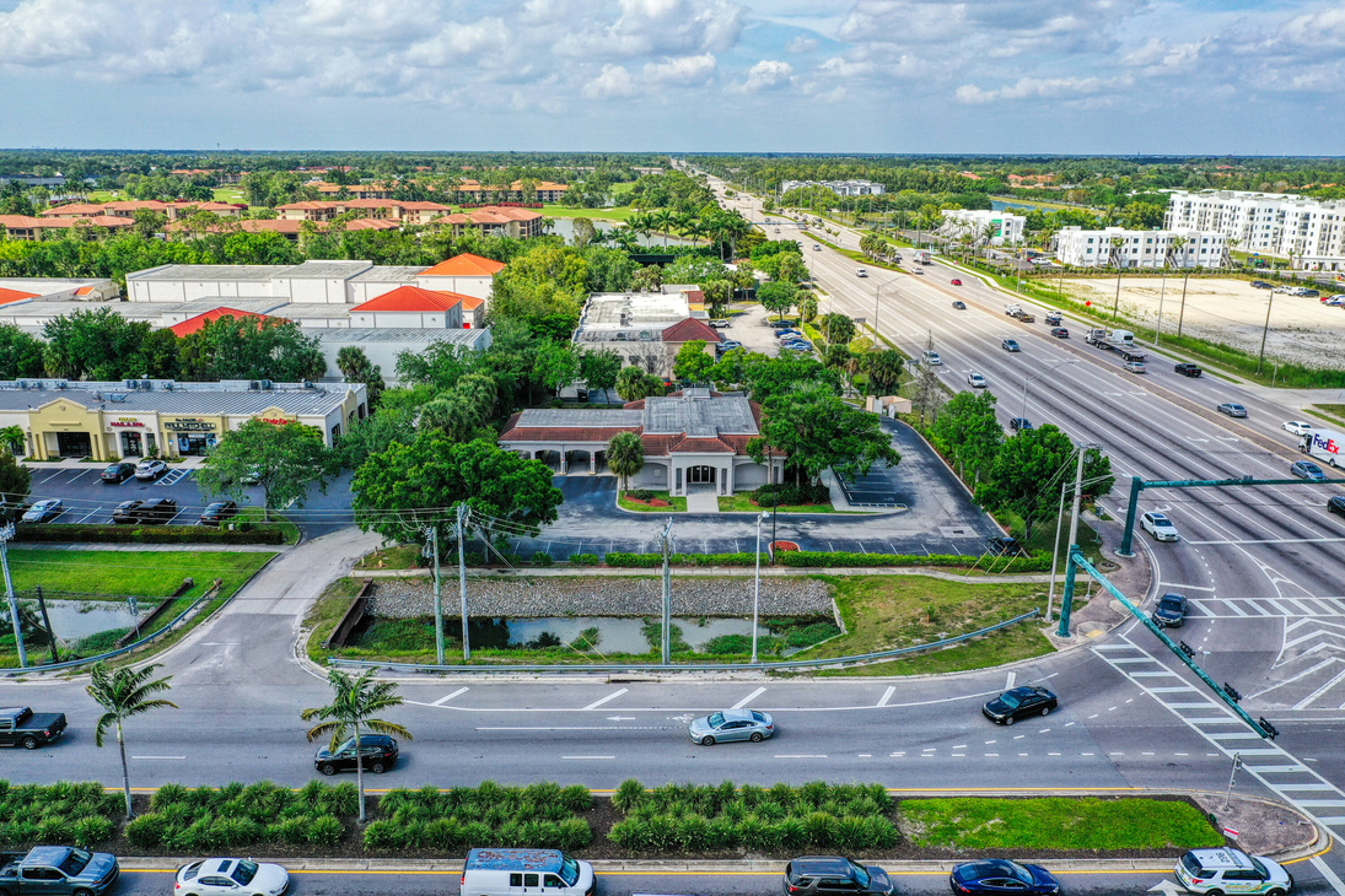 Commercial land for rent with high traffic and drive-through lanes.