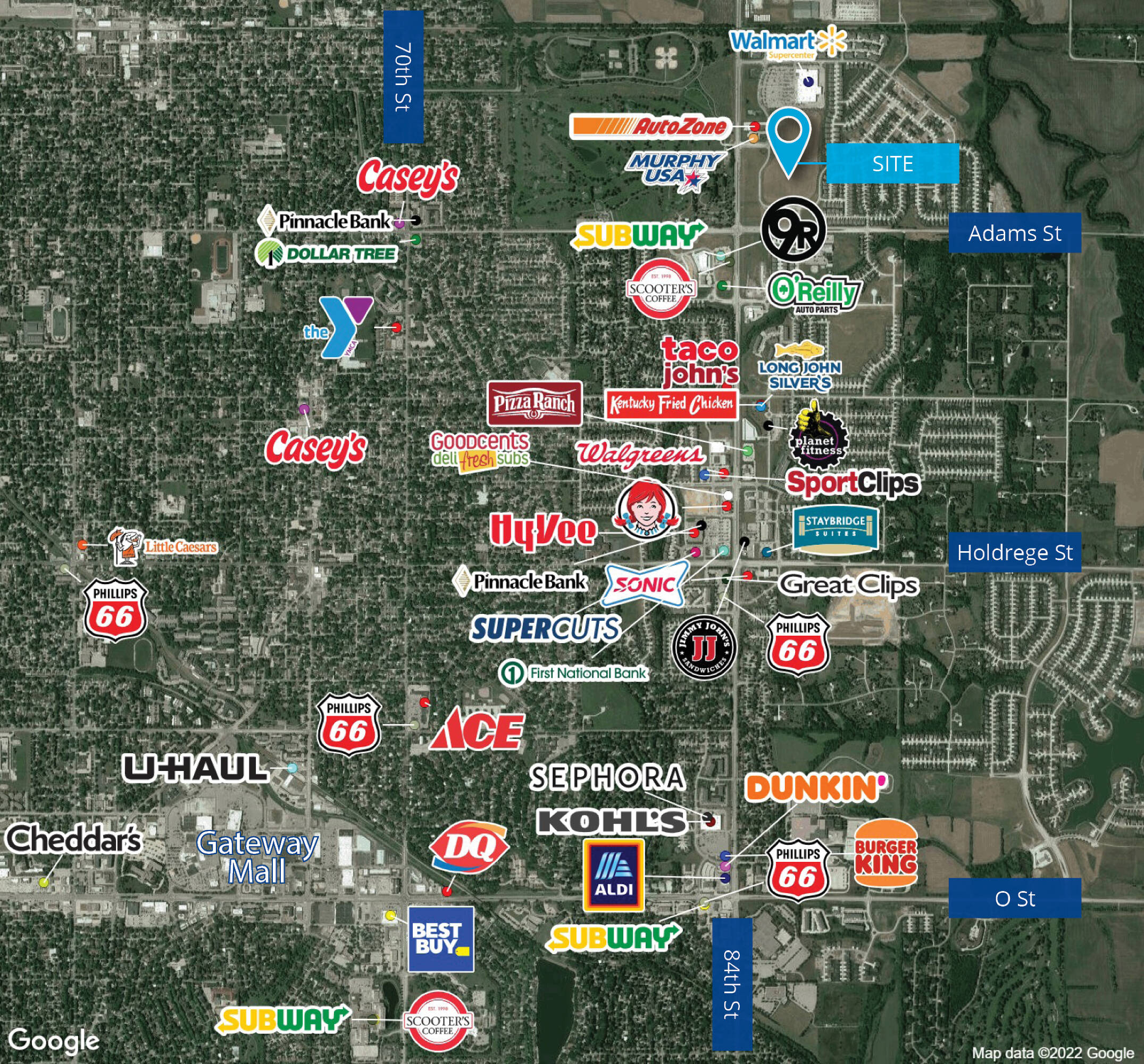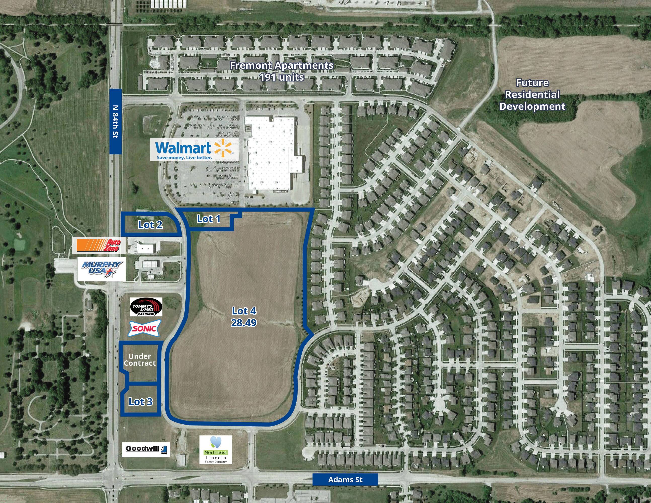 This commercial land is located near a Walmart Super Center, AutoZone, Sonic, Murphy Express, and Goodwill, situated on the 84th Street Corridor. The area is experiencing significant rooftop growth, presenting opportunities for expanding restaurants and service-oriented businesses.