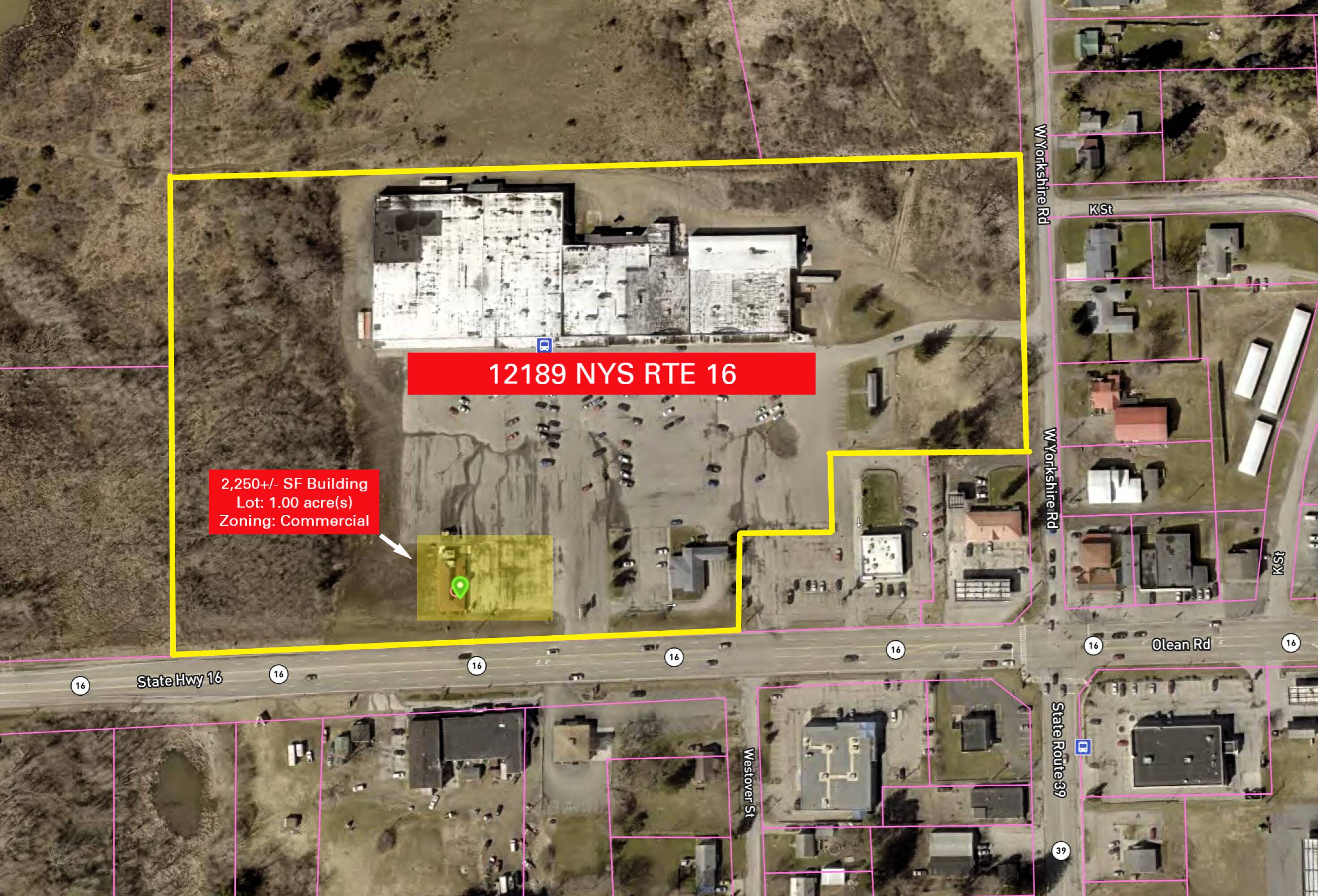This property features: High‑traffic location at the corner of NY Route 16 & W. Yorkshire Road in Yorkshire Plaza.; **2,250 +/- SF former Pizza Hut space suitable for restaurant or business.**; Ample parking in a large paved lot.