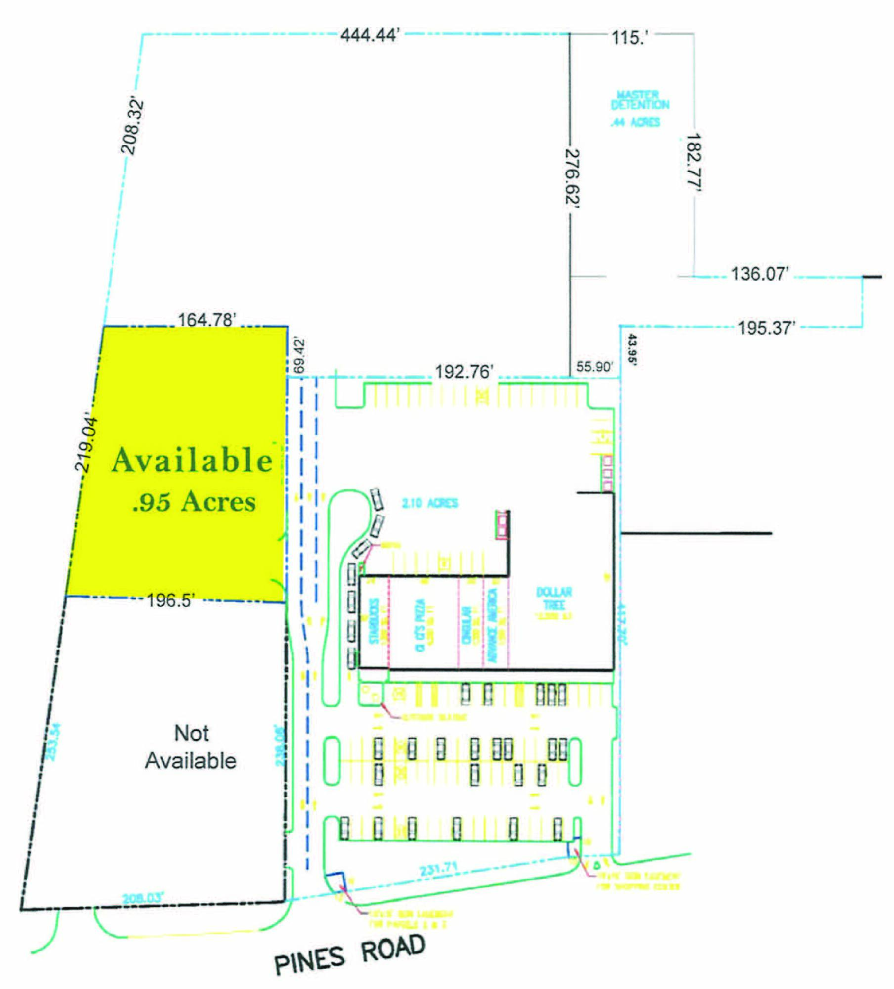 This is a 0.95-acre vacant land parcel available for sale. The land is cleared and leveled, with a detention area already in place. City water and sewage services are available for connection to the property. The property is located off Pines Road and Interstate 20.