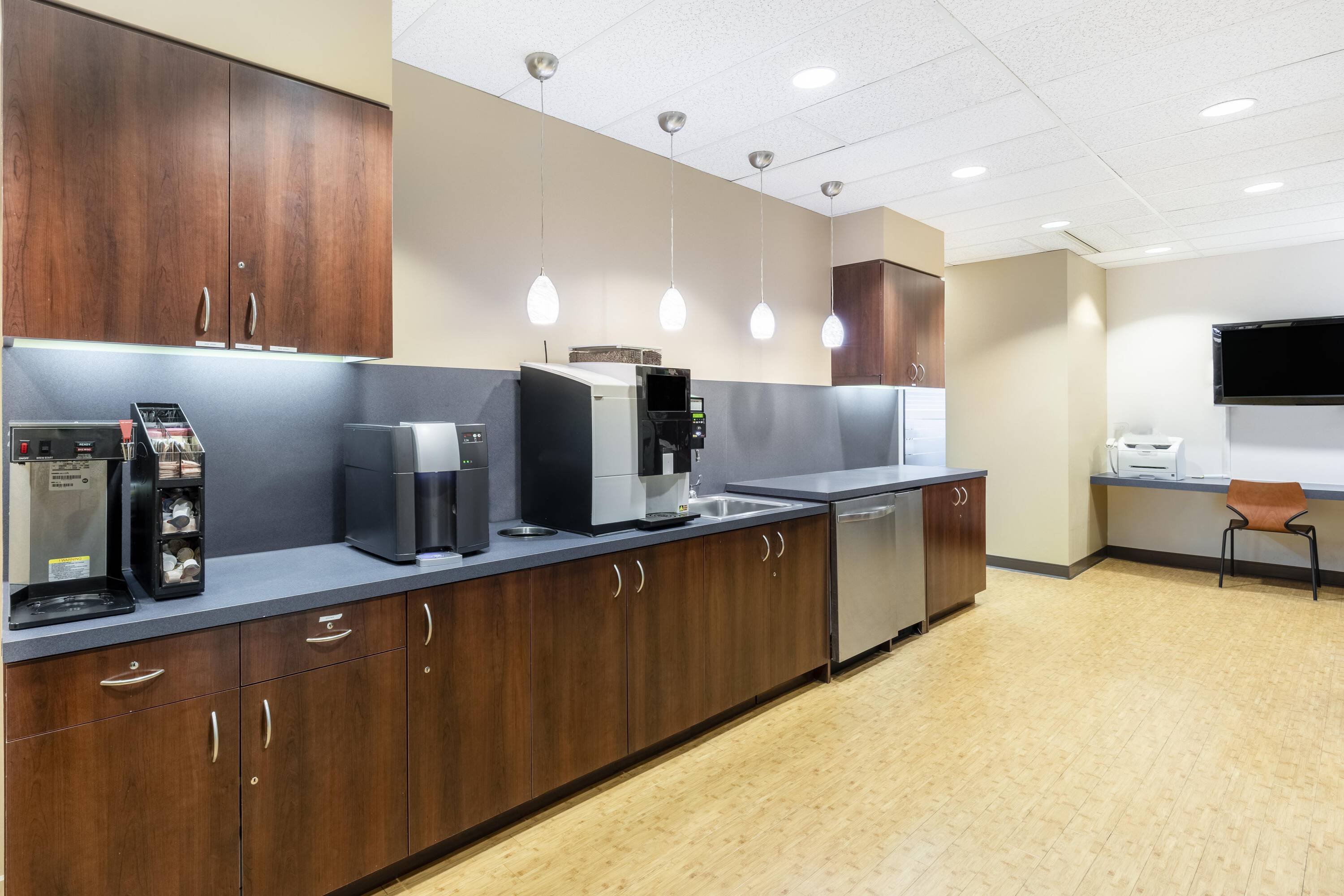 This office space is located in Northbrook, a suburb on the North Shore, and overlooks the Chicago Botanic Garden. The Botanic Gardens Center workspace is situated in a vibrant area with convenient access to highways and O’Hare International Airport. The property includes a reception team and a modern, fully-stocked kitchen. The location provides convenient access to natural areas and restaurants.