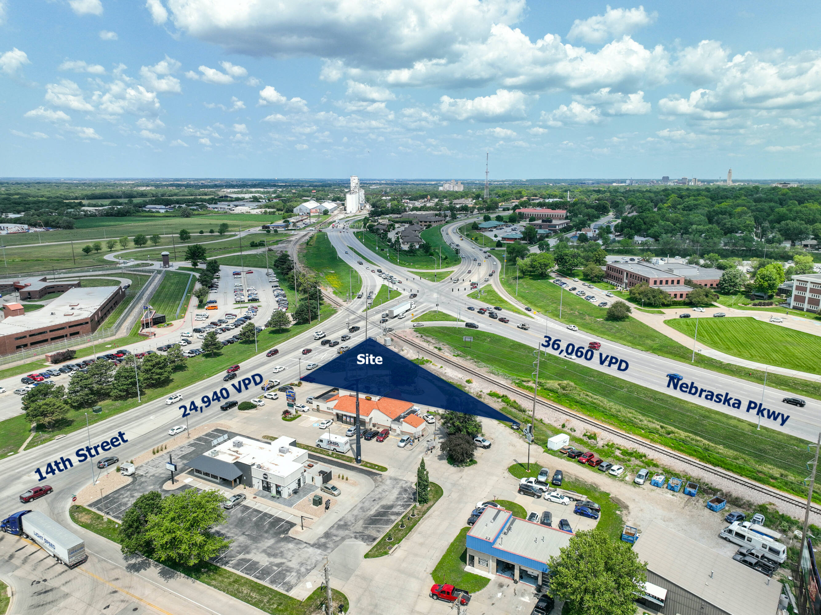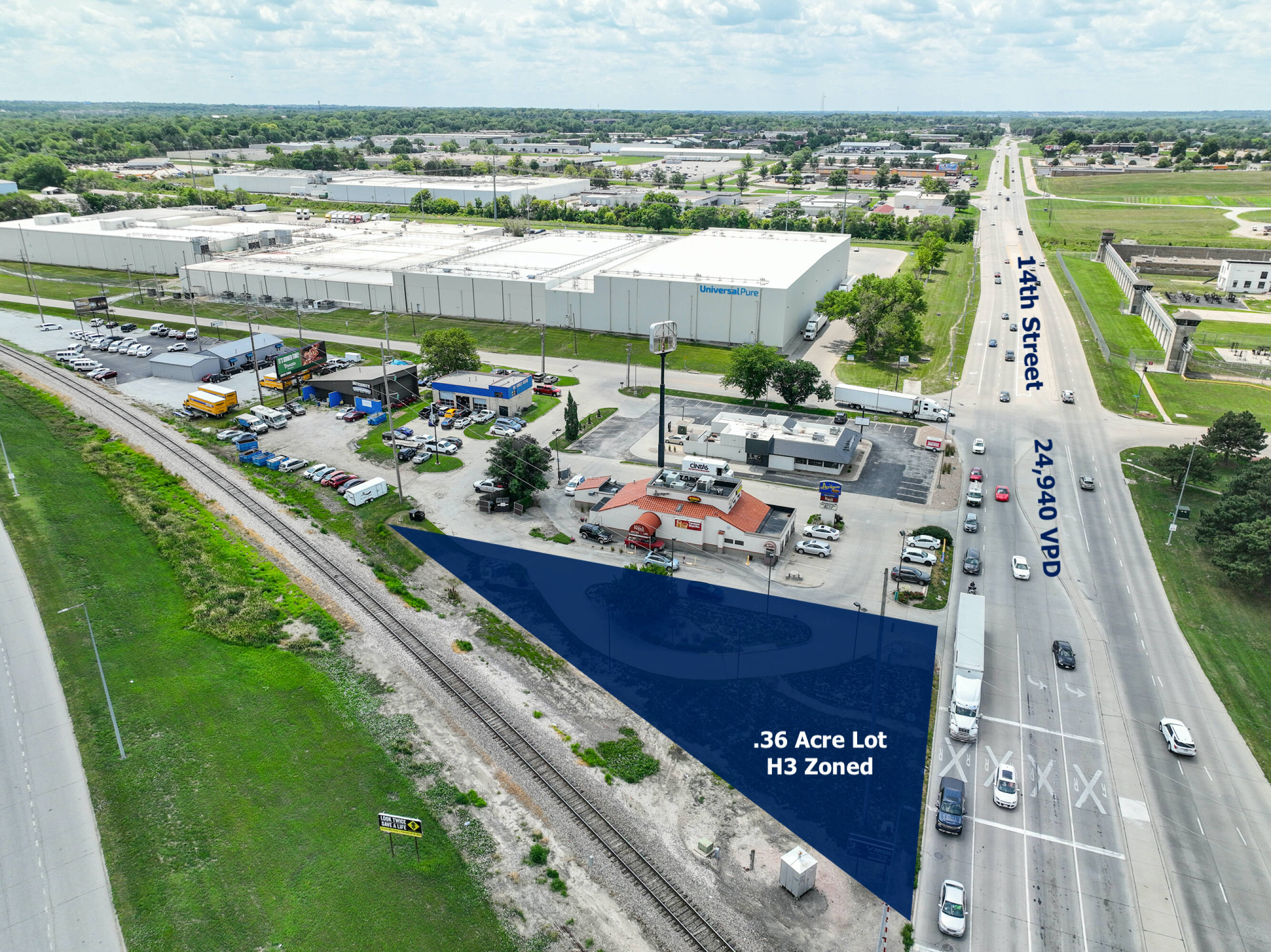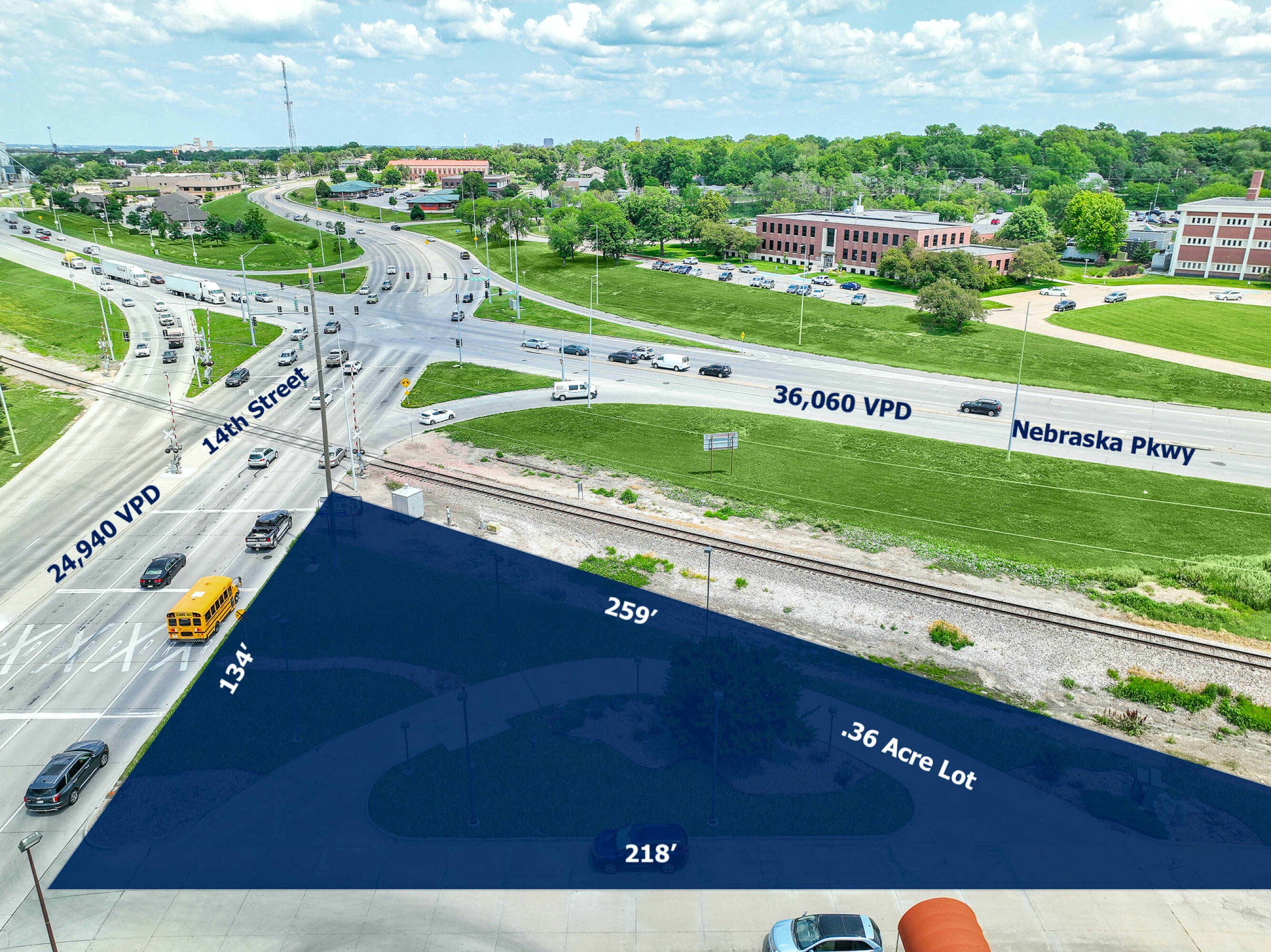 This \u00b10.36 acre commercial property is located at the intersection of 14th Street and Nebraska Parkway in Lincoln, Nebraska, offering high visibility. The site, situated on a hard corner, is available for sale, ground lease, or build-to-suit. The current H3 Zoning allows for a variety of uses, including quick-service drive-thru, single-tenant retail, flex space, or storage. Formerly a National Bank ATM location, the site is ready for construction with existing electrical and water connections. The lot is fully drive-thru paved. Traffic counts for South 14th Street and Nebraska Parkway for 2021 were 61,000 vehicles per day. Build-to-suit options are available. Lot lines are approximate.