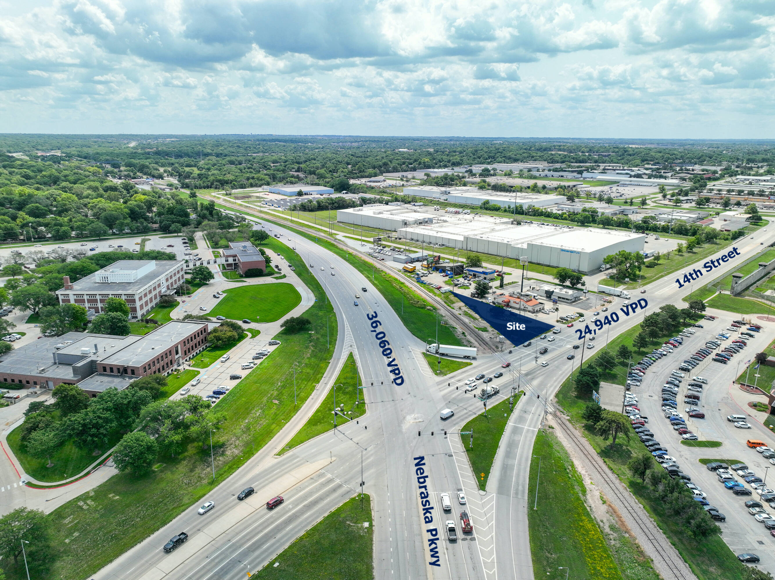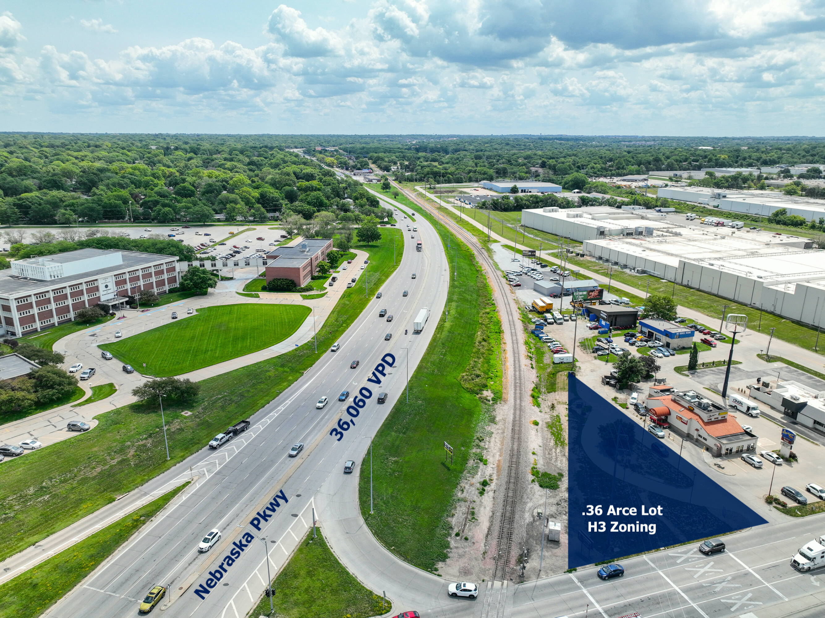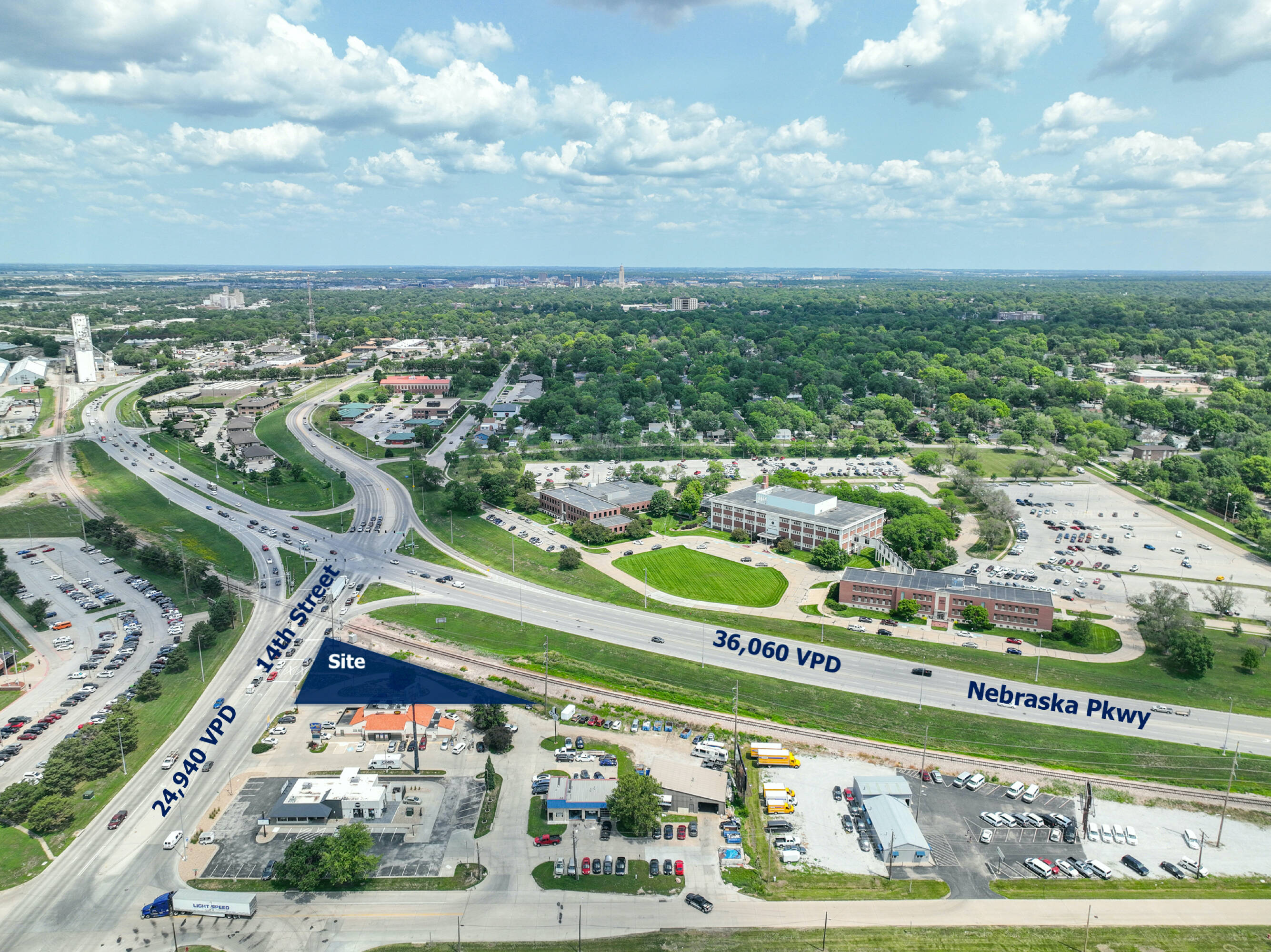 This \u00b10.36 acre commercial property is located at the intersection of 14th Street and Nebraska Parkway in Lincoln, Nebraska, offering high visibility. The site, situated on a hard corner, is available for sale, ground lease, or build-to-suit. The current H3 Zoning allows for a variety of uses, including quick-service drive-thru, single-tenant retail, flex space, or storage. Formerly a National Bank ATM location, the site is ready for construction with existing electrical and water connections. The lot is fully drive-thru paved. Traffic counts for South 14th Street and Nebraska Parkway for 2021 were 61,000 vehicles per day. Build-to-suit options are available. Lot lines are approximate.