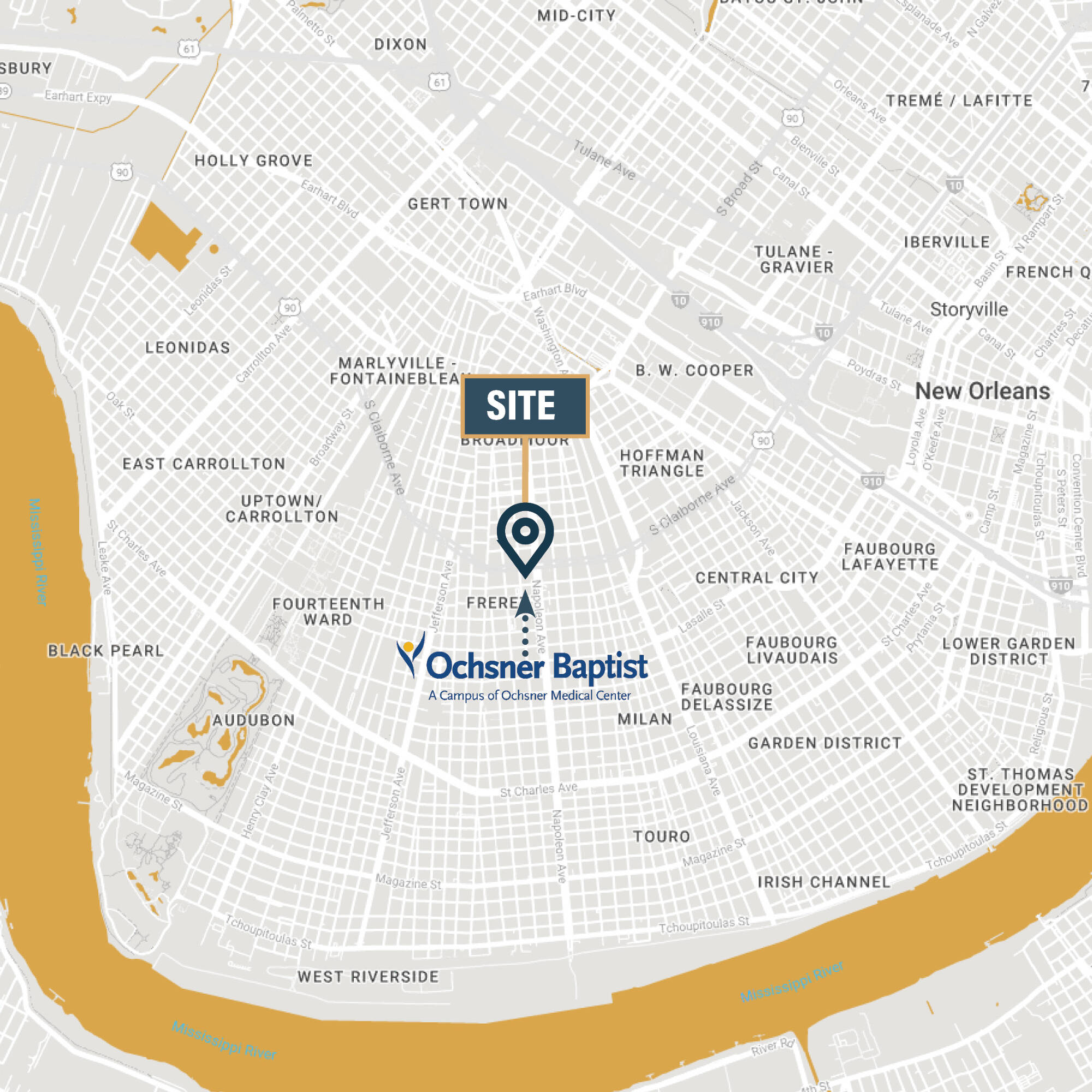 Located directly across from Ochsner Baptist in uptown New Orleans, this land is well suited to support a Medical Office Building development for health care providers that work closely with the Ochsner medical system. The property is available for sale or lease.
