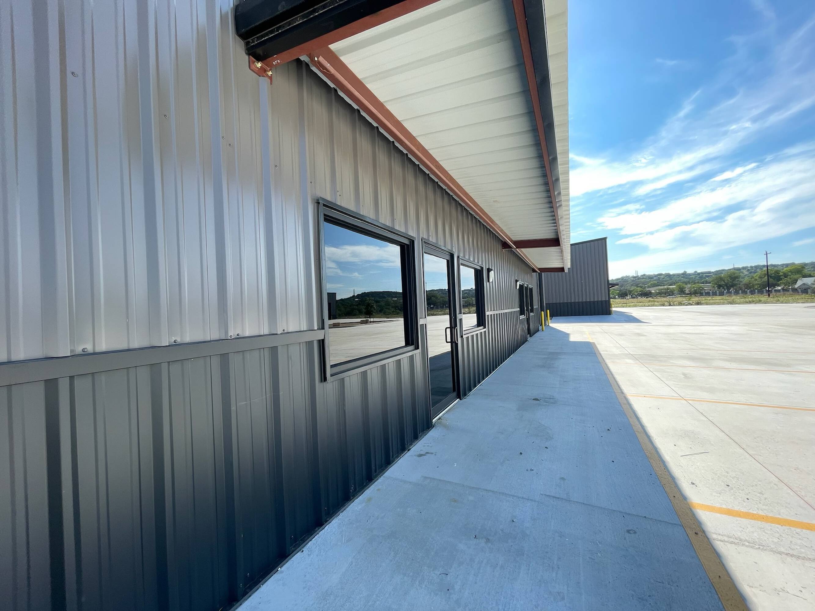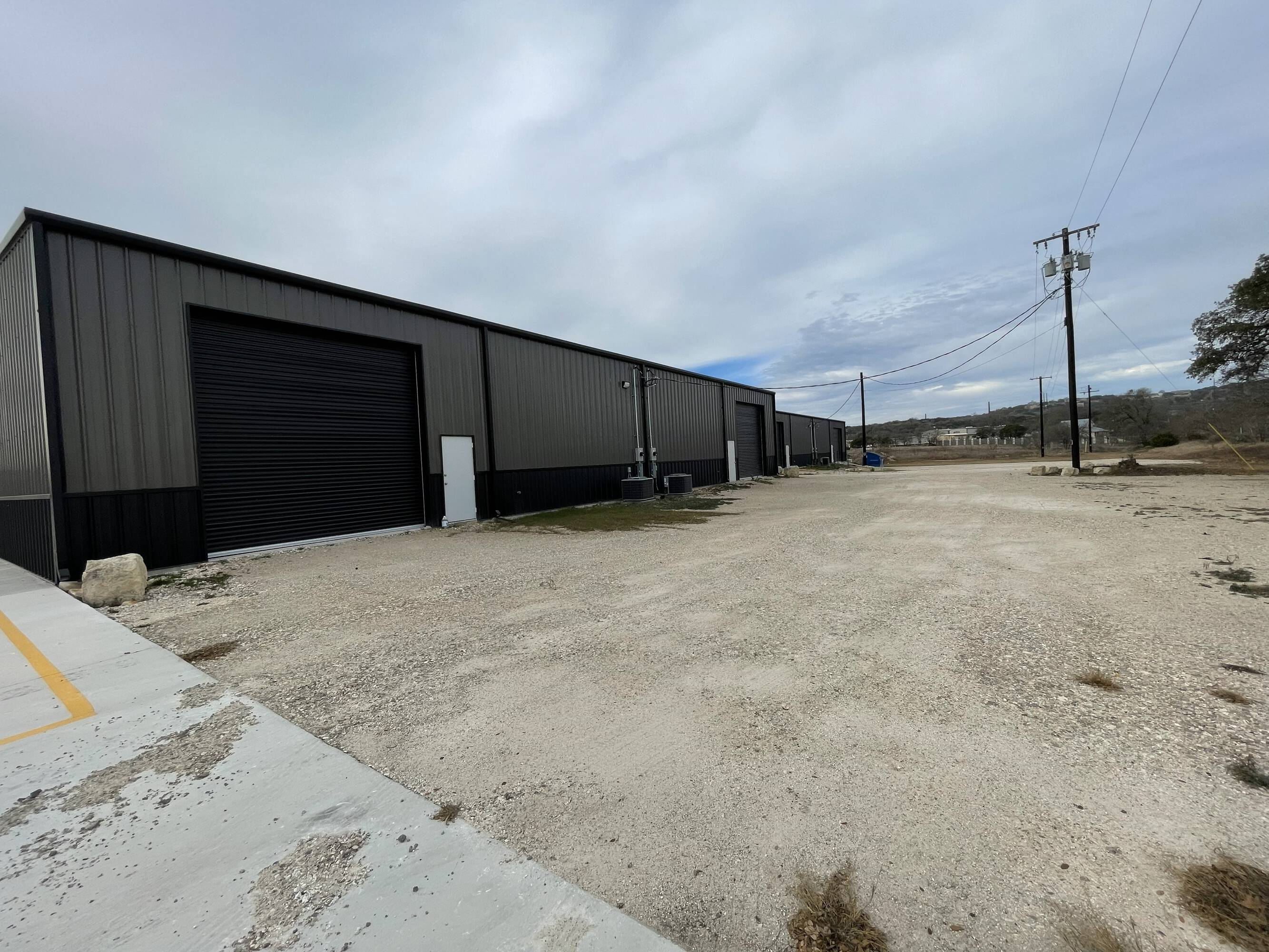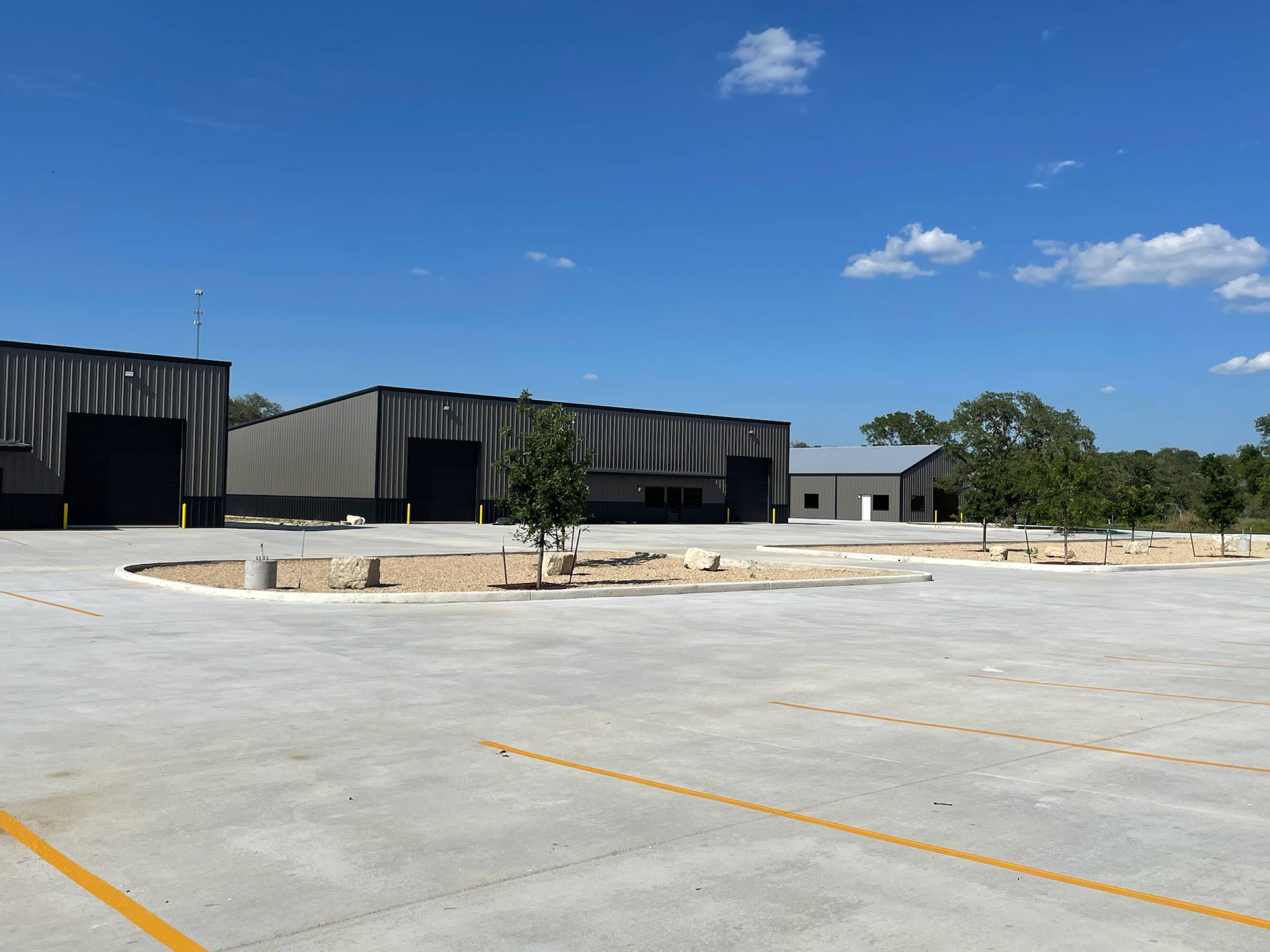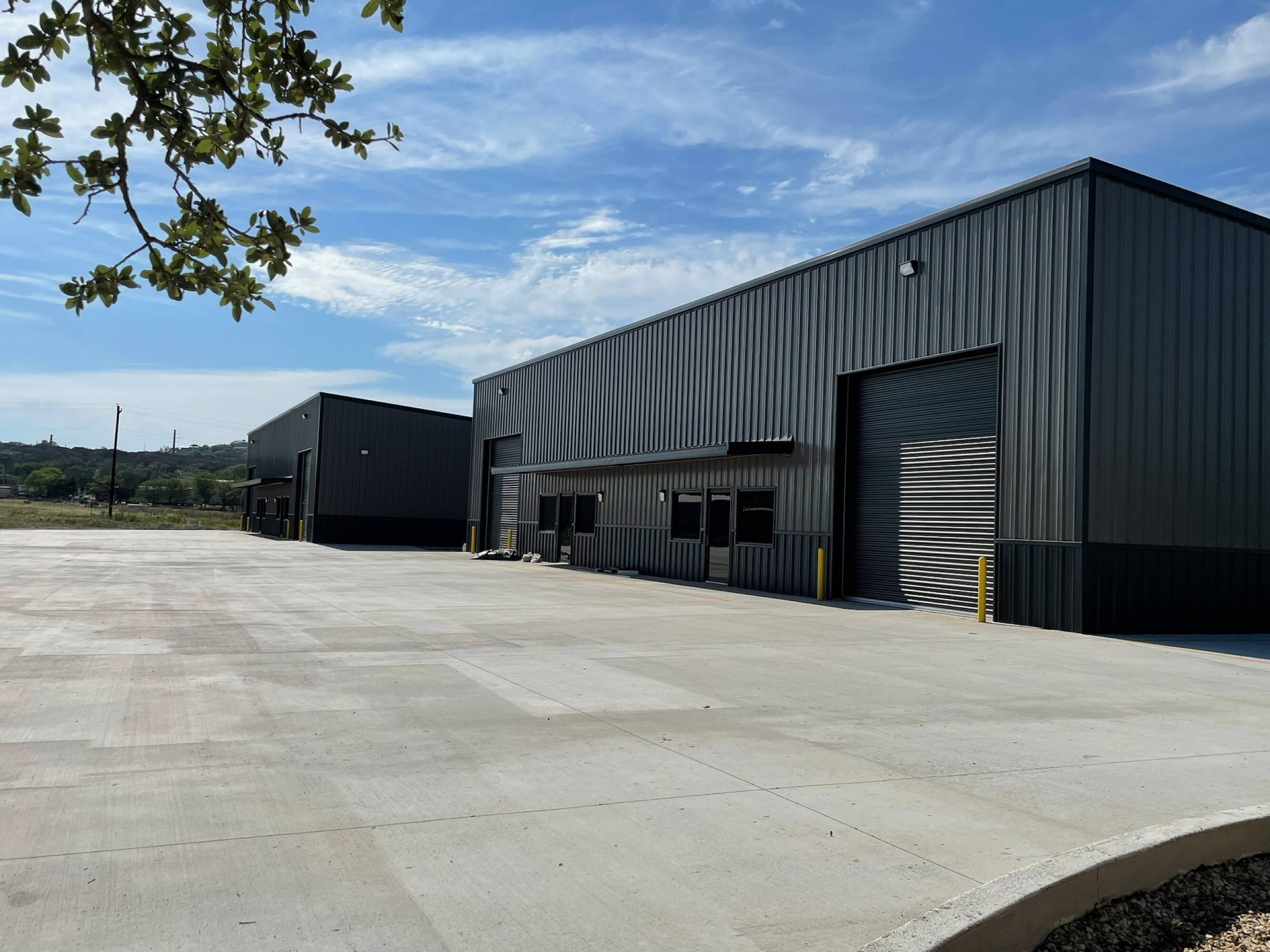 Warehouse buildings for lease with concrete parking and yard space.