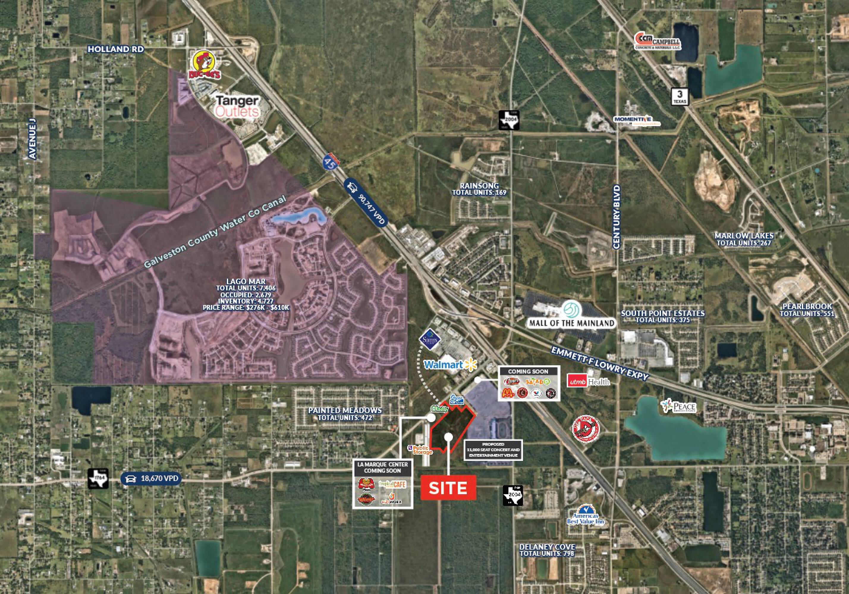 This commercial land is located in a high-growth area of La Marque, Texas, a 30-minute drive from Houston's central business district. The property fronts FM 1764, just west of I-45, presenting an excellent development opportunity for various commercial uses. The rapidly growing communities of Lago Mar and Delaney Cove, projected to have over 7,000 homes upon build-out, are in the immediate vicinity. A new Sam's Club and Walmart are located just north of the property, fronting FM 1764. Within a 2-mile radius are UTMB Health, Gulf Greyhound Park, Mall of the Mainland, and the Texas City Tanger Outlet, a regional draw with over 5 million annual visitors and retailers such as Brooks Brothers, Michael Kors, Ralph Lauren, and Coach. Adjacent to the Tanger Outlets is "Adventure Point," an amusement park and conference center under development. The trade area is vastly underserved from a grocery and retail perspective. The site has excellent frontage-to-depth ratios and is ideal for grocery-anchored development with complimentary restaurants and retail uses. Plans for a future FM 1764 traffic signal mid-block on the property would create two valuable commercial corners. The City of La Marque is pro-business and welcoming to potential developers.