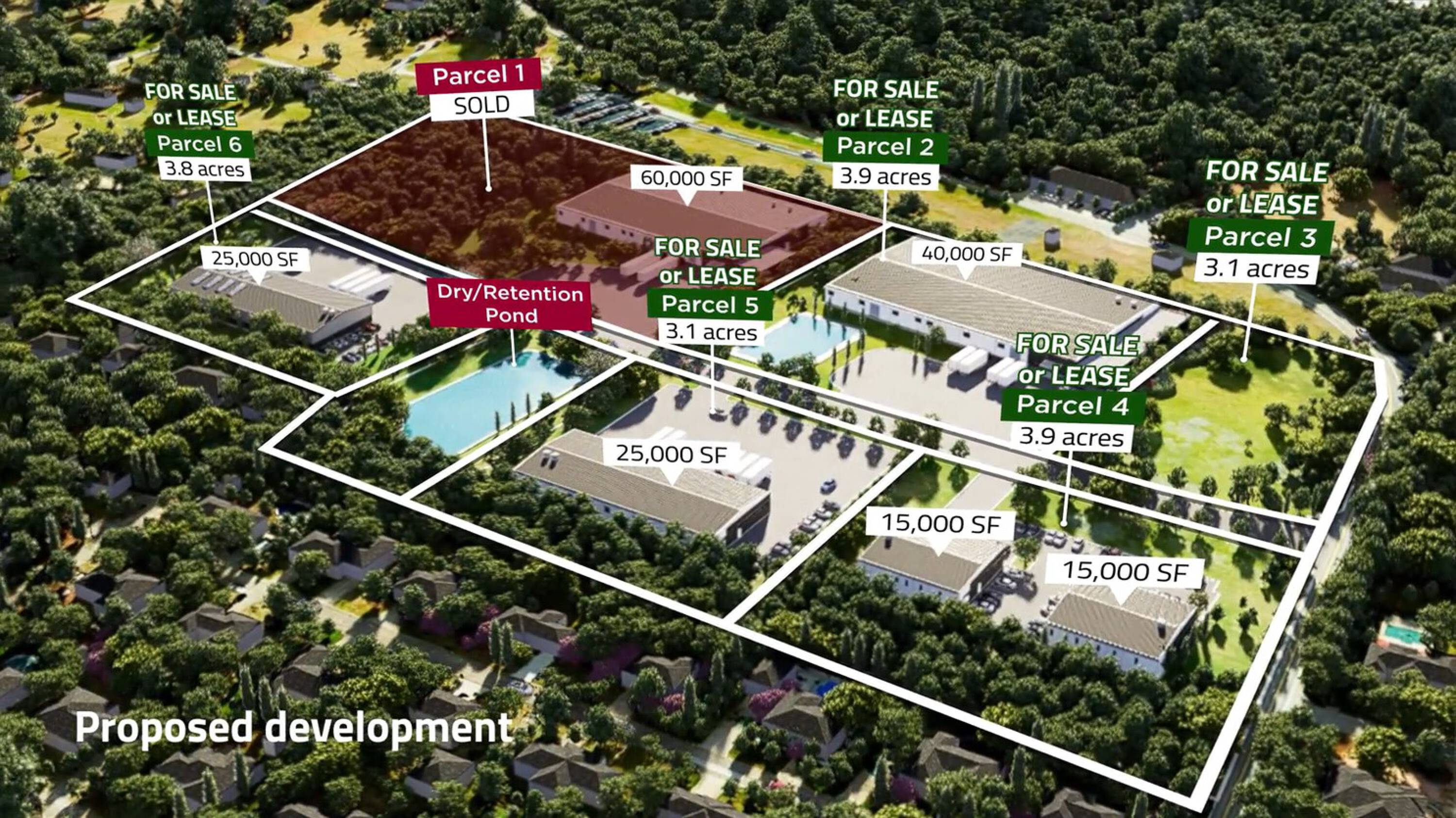 Industrial park with customizable lots for lease or sale.
