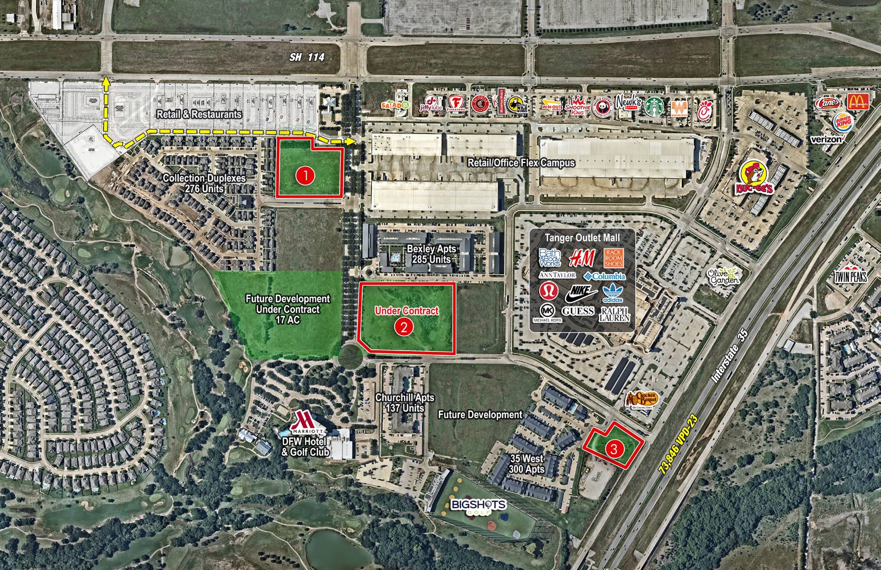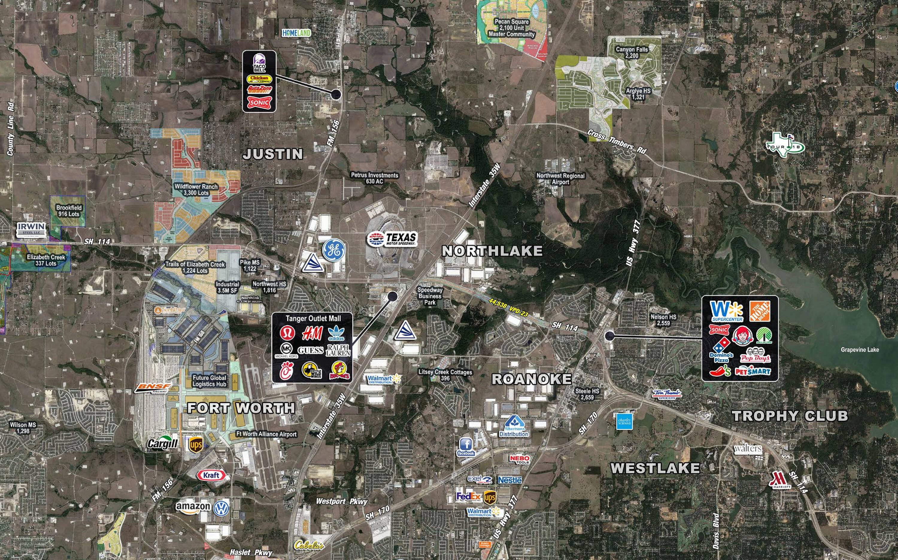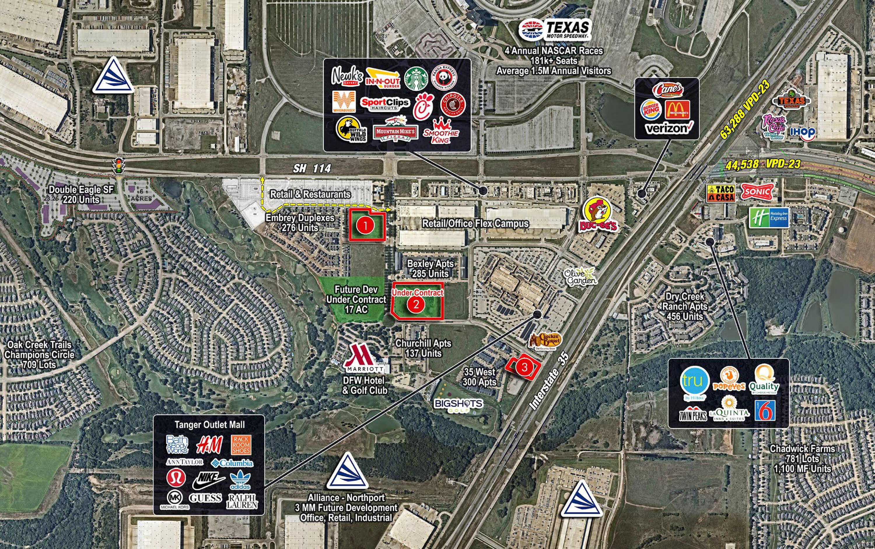 Multiple development opportunities near Texas Motor Speedway and Tanger Outlets.