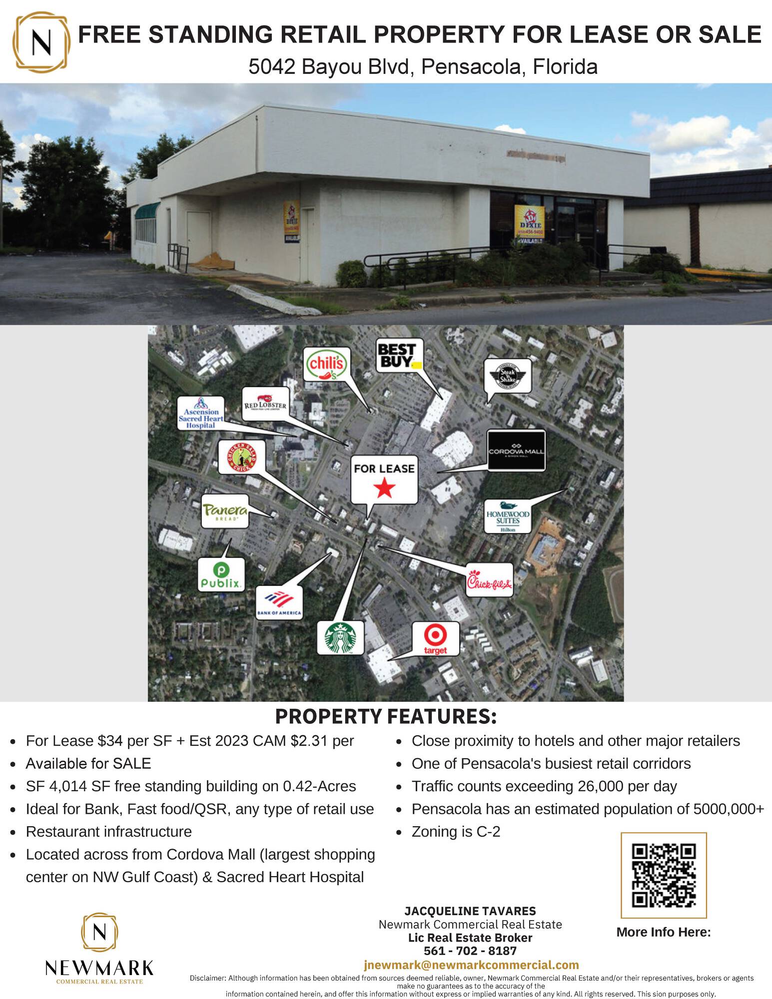This property features: High‑traffic location: Over 26,000 vehicles per day.; Prime retail corridor: Close to Cordova Mall, Sacred Heart Hospital, hotels, and major retailers.; Free‑standing 4014 SF building suitable for various retail uses.