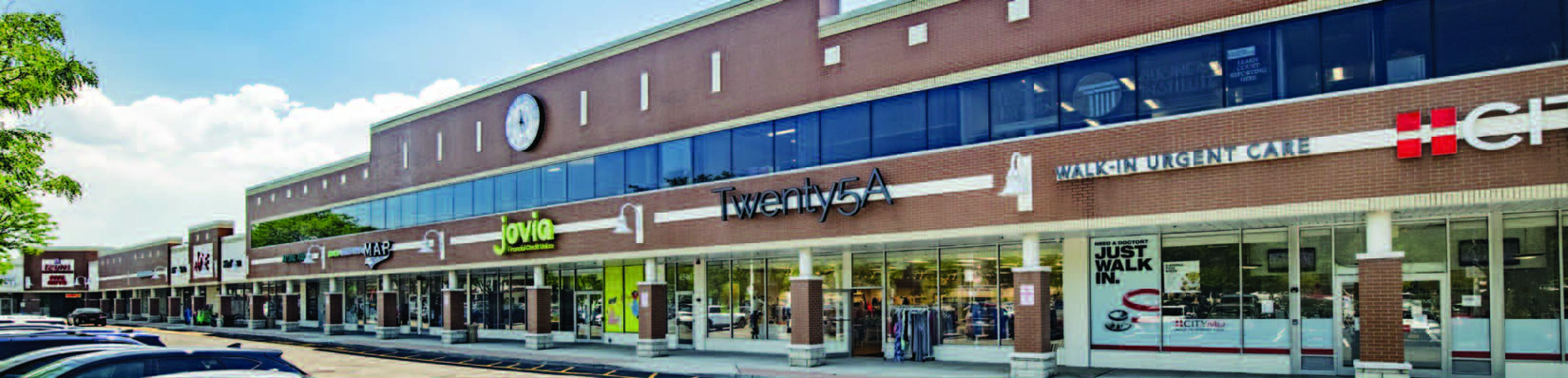 High-traffic retail space at a signalized intersection.