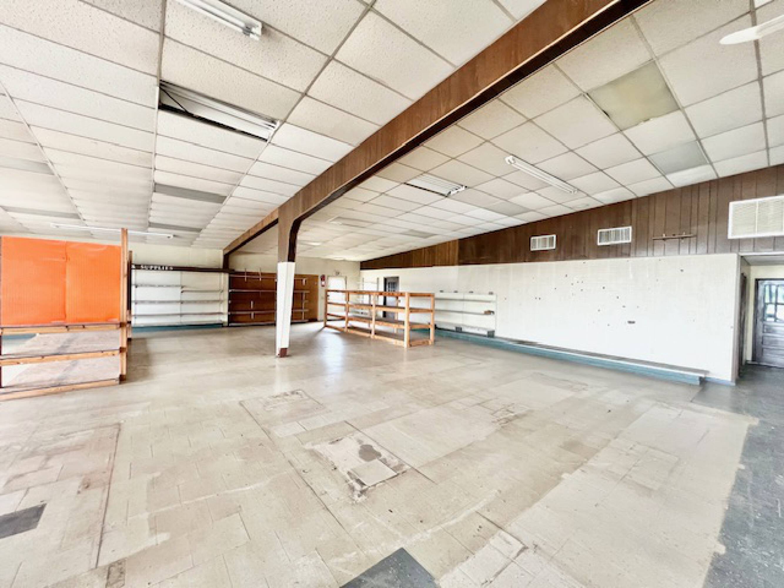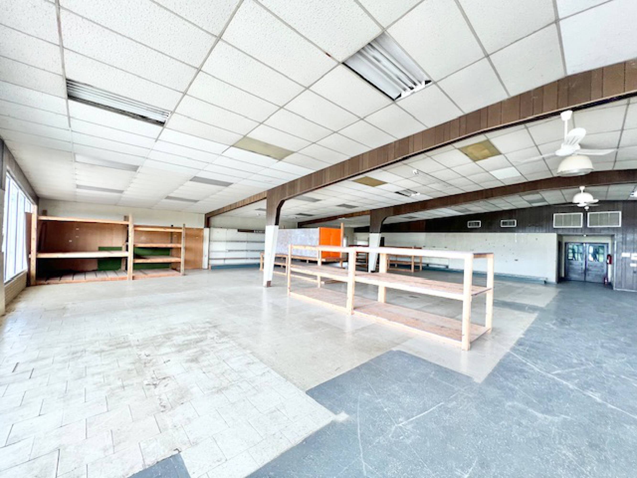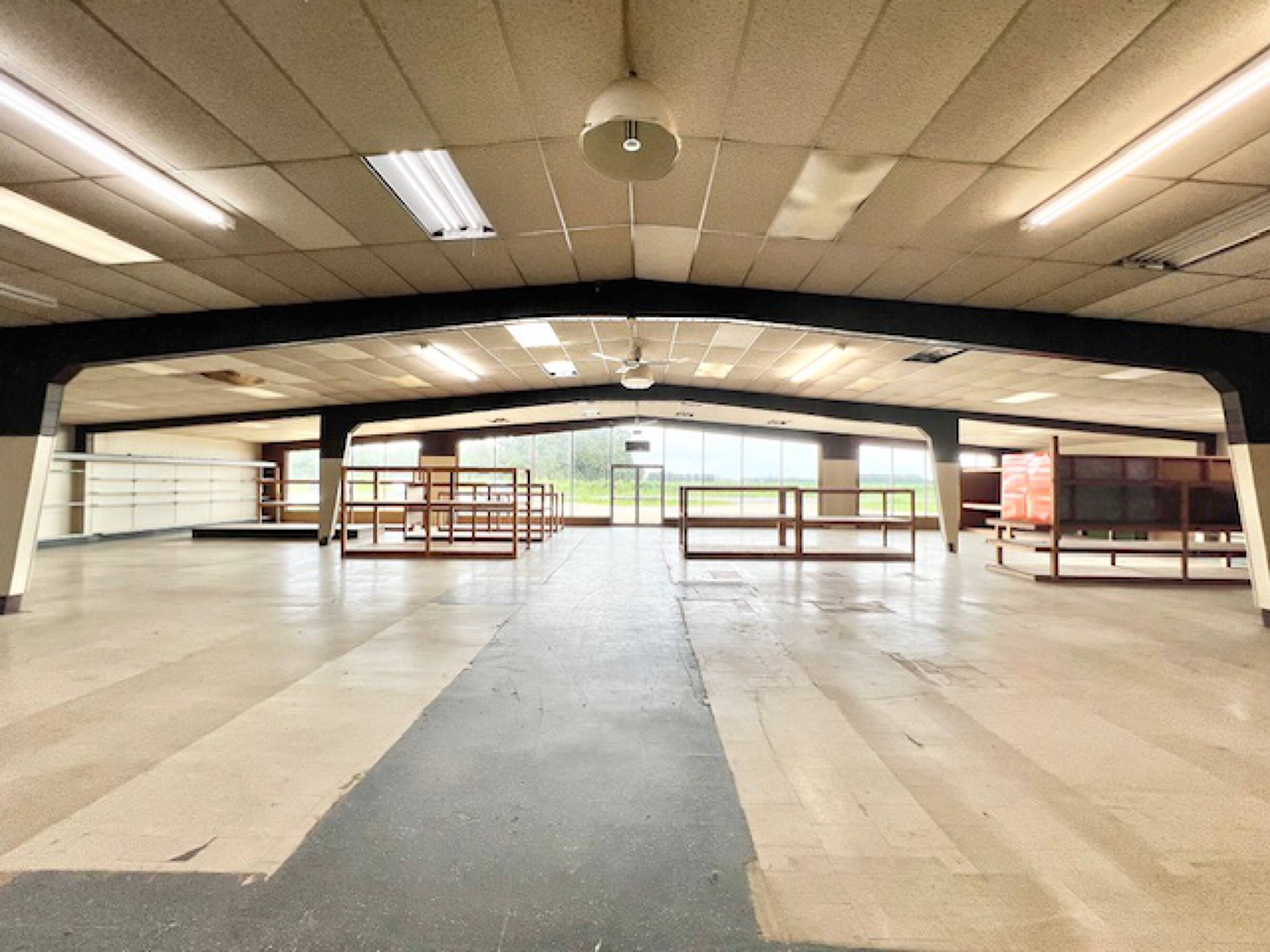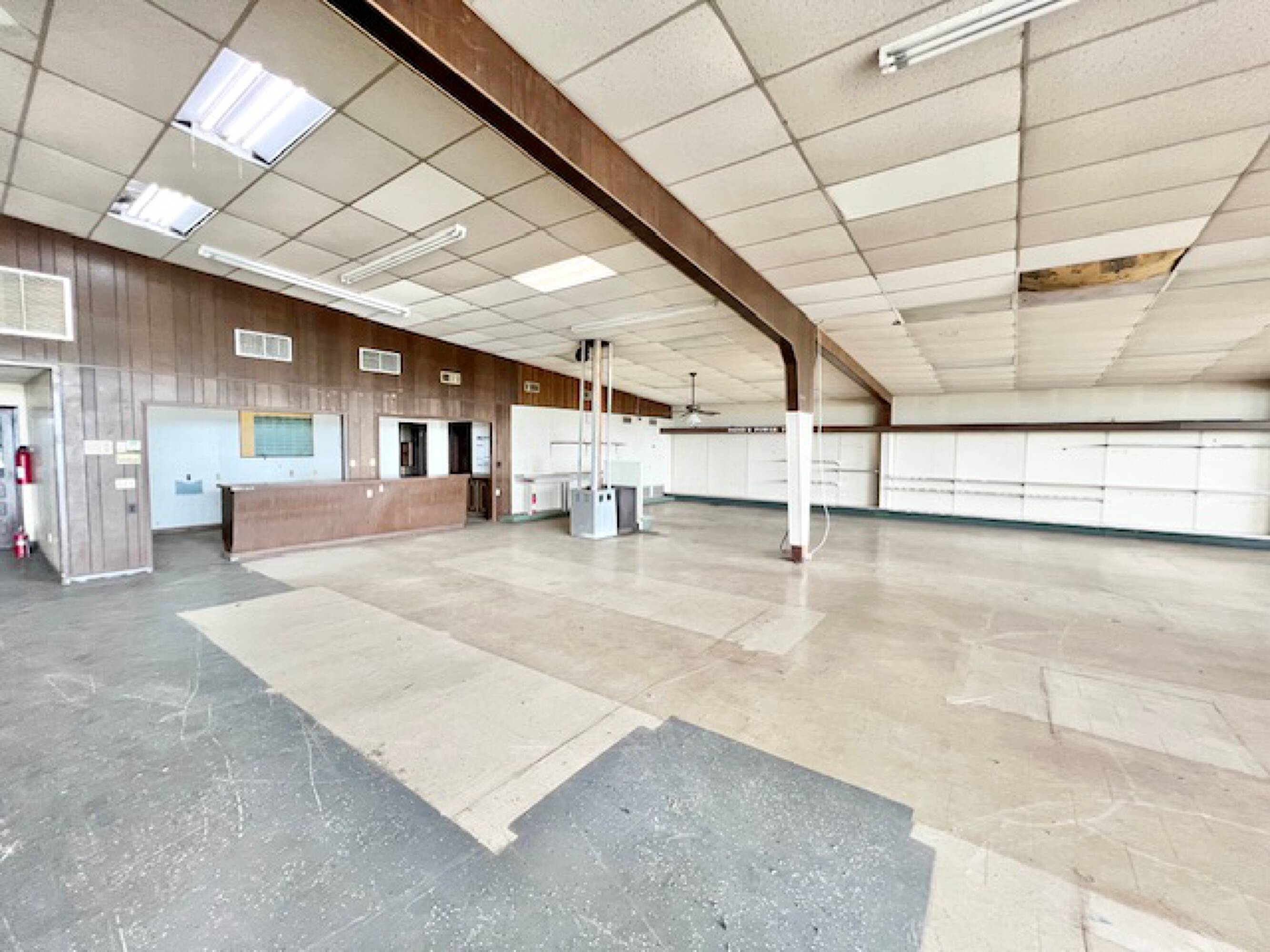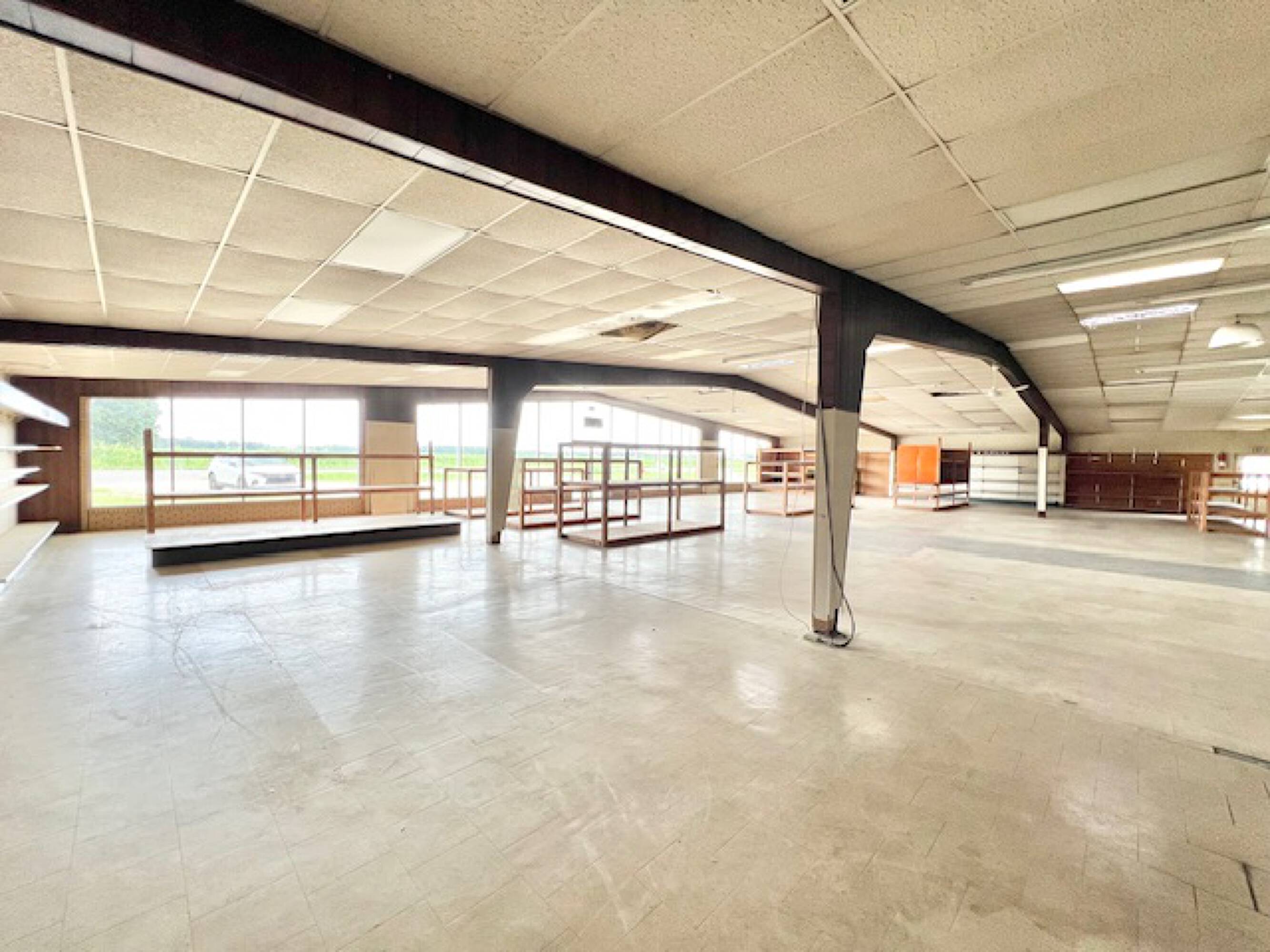 Well-established commercial building with high ceilings and ample parking.