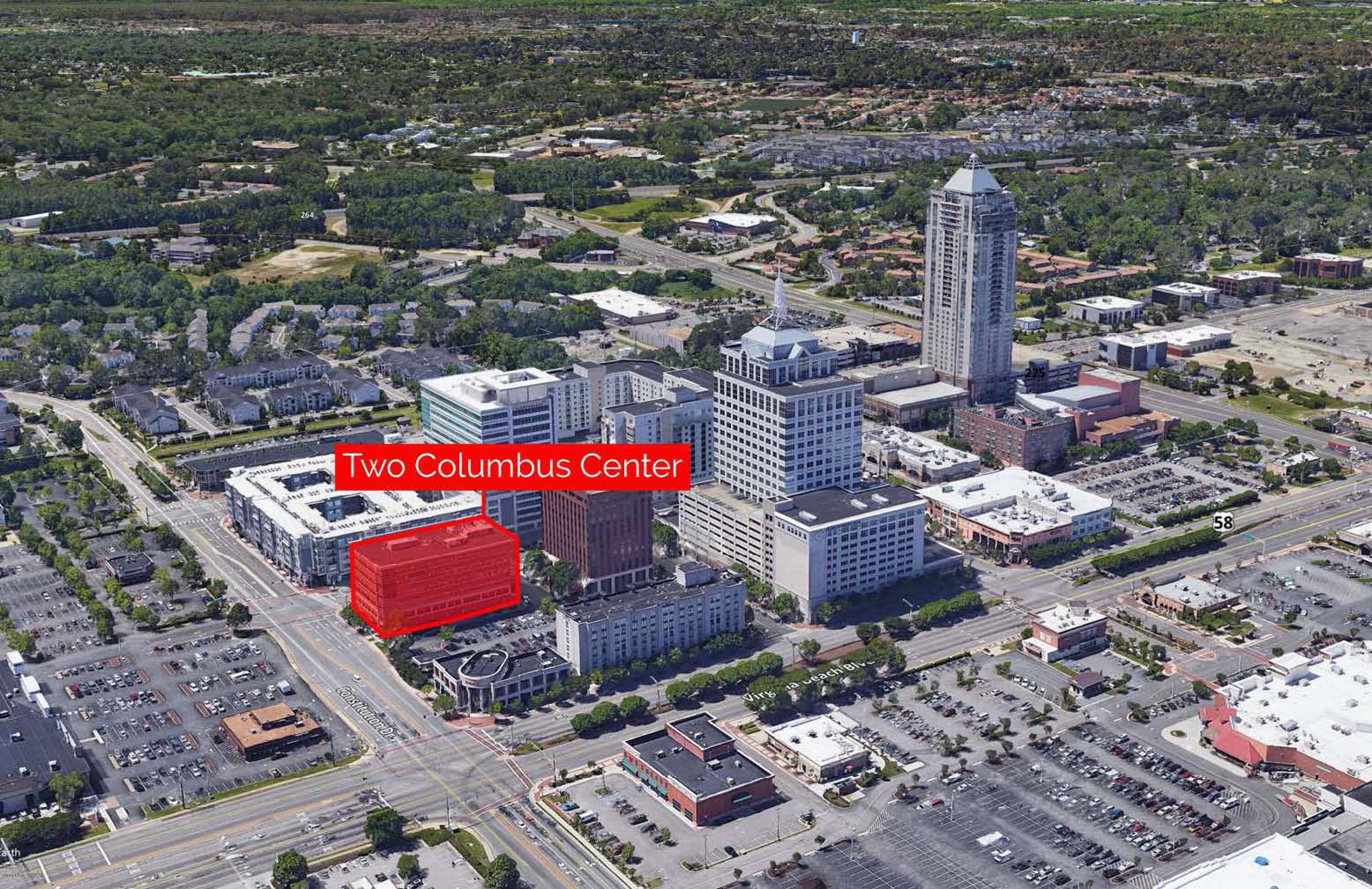 Two Columbus Center is situated in the Town Center of Virginia Beach, within the central business district. The building is located at the intersection of Constitution Drive and Main Street, north of the Clark Nexsen Building. The location offers convenient access to upscale dining, banking facilities, luxury apartments, retail shops, personal service providers, and a private health club, all within walking distance. The Town Center of Virginia Beach is a mixed-use city center featuring Class A office space, upscale retail stores, restaurants, two hotels, and high-end apartments. Its central location provides convenient access to Interstate 264.