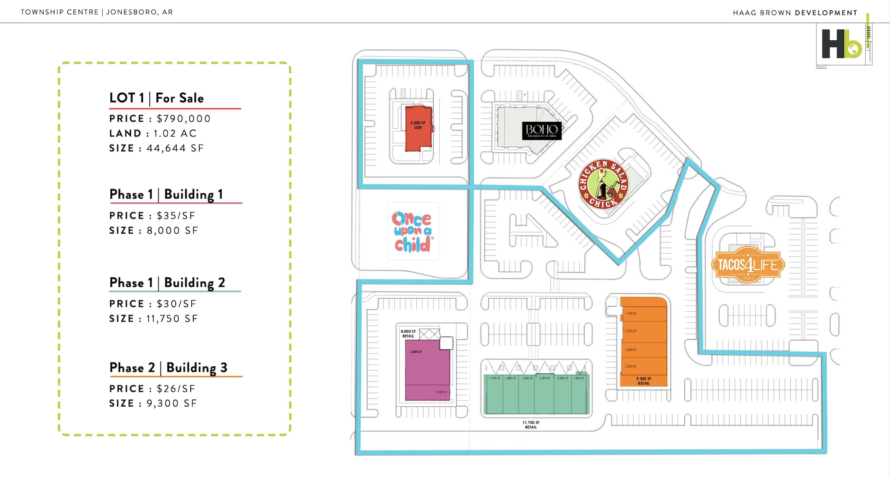 Located along Red Wolf Boulevard between Interstate 555 and the Mall at Turtle Creek, the Township Centre development is situated in Jonesboro’s main retail sector, which has been the focal point of the city’s growth for the past 10 years. The site is surrounded by restaurants and retailers, including Academy Sports, Cheddar’s Casual Cafe, Panera Bread, Men’s Wearhouse, Qdoba, The Refinery, Orange Theory Fitness, Sissy’s Log Cabin, Starbucks, Ashley Furniture, Plato’s Closet, Gigi’s Cupcakes, Aspen Dental, 1812 Pizza and Wings to Go. The property is zoned commercial. Tenants within Township Centre have exposure on Red Wolf Boulevard, with traffic counts reaching 34,000 cars per day, and Race Street, with traffic counts totaling 11,000 cars per day. Lot 1 is located at the intersection of Parkwood Road and Fair Park Boulevard. Bordered by Once Upon a Child to the south and Boho Extension Co. & Salon to the east, the site faces Kohl's and Lowe's. The 1.02 acre site is suited for any restaurant or retailer needing high visibility and easy access and can accommodate up to 3,500 square feet of stand alone space.