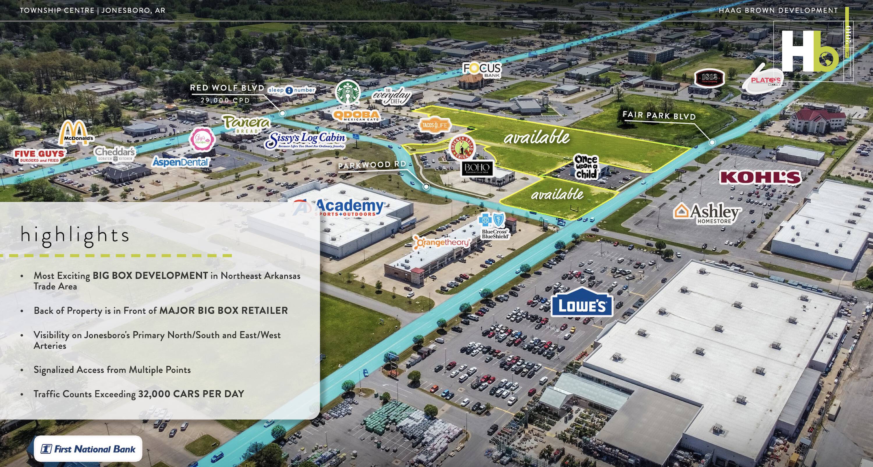This property features: Prime location: the only remaining hard corner at Parkwood Road and Fair Park Boulevard within the Township Centre development.; High visibility on Red Wolf Boulevard (34,000 cars per day) and Race Street (11,000 cars per day).; Located in the epicenter of Jonesboro's main retail sector, the focal point of the city's growth.