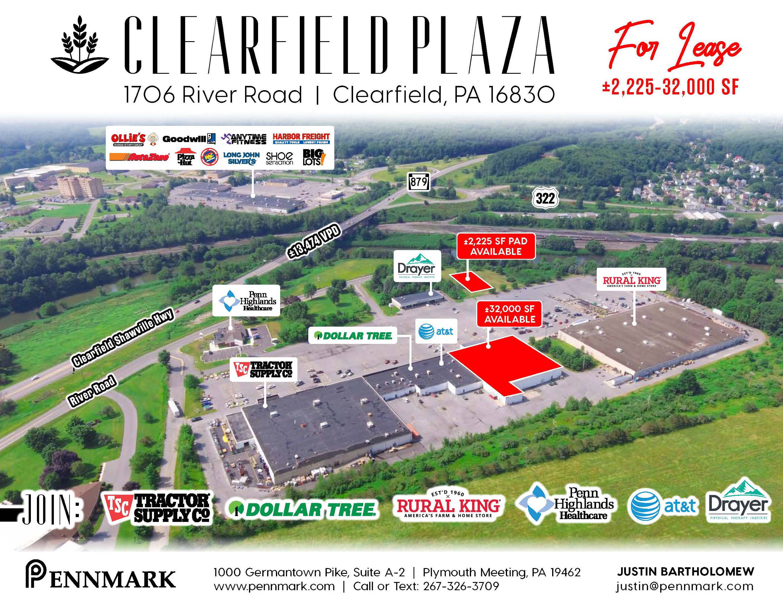 Clearfield Plaza is a newly renovated community retail center offering over 200,000 square feet of leasable space. The property is located on River Road, between Clearfield Square and the I-80 Interchange. The plaza benefits from high visibility and accessibility from major highways. Anchor tenants include Rural King (farm and home supply), Dollar Tree (discount retail), Big Lots (furniture and general merchandise), Save-A-Lot (grocery), Label Shopper (fashion and apparel), Tractor Supply Company (home improvement and outdoor living), AT&T Wireless (mobile services), and Drayer Physical Therapy Institute (healthcare services). The location features 1,178 feet of frontage on River Road and 1,096 parking spaces. The property benefits from high traffic counts and freeway visibility, dedicated turn lanes, and signage opportunities. Clearfield Plaza is managed by Pennmark Management Company. The property is suitable for businesses seeking high foot traffic and strong co-tenancy.