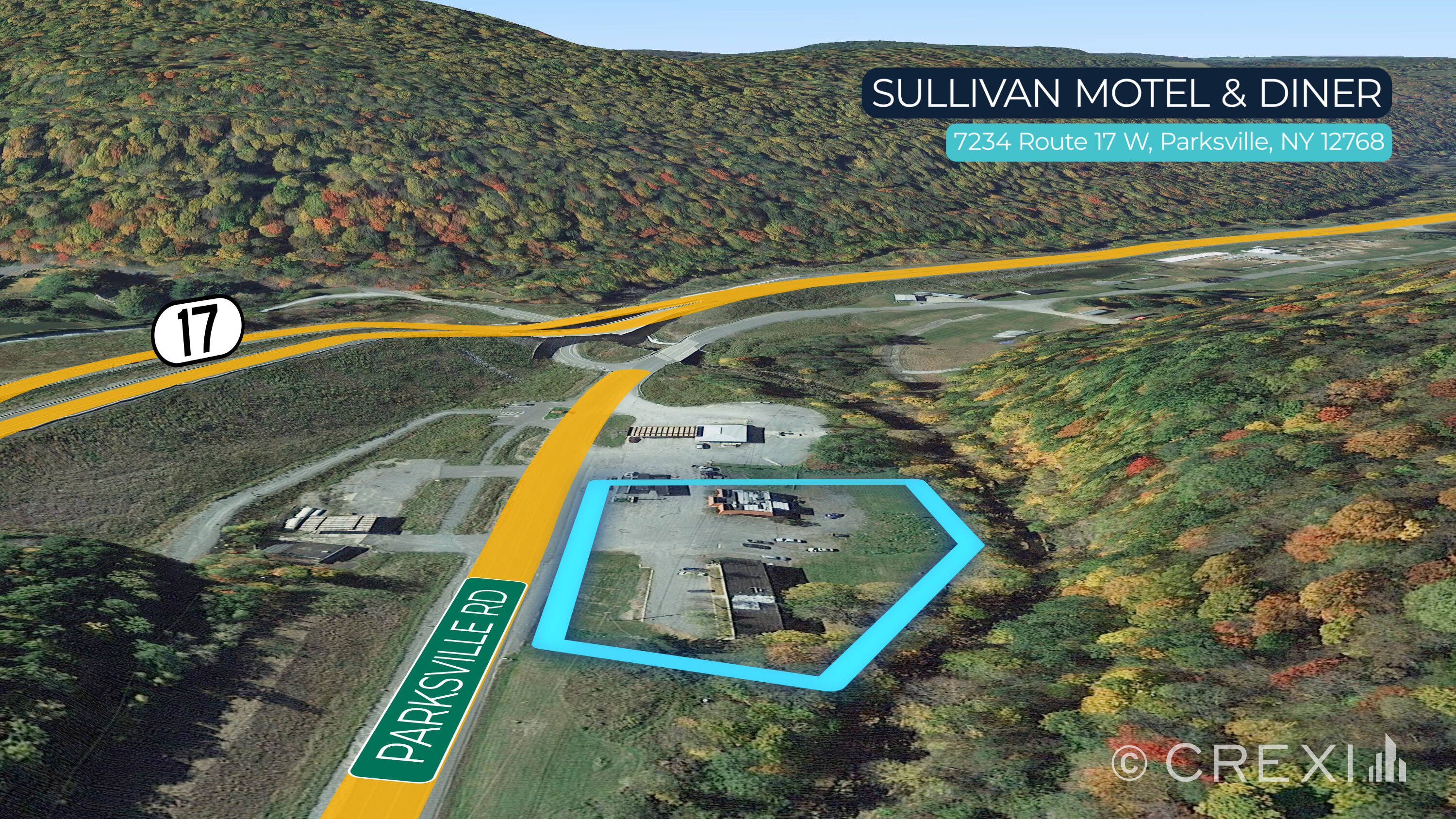 The Sullivan Motel & Diner, located at 960 and 968 Parksville Rd in Parksville, NY, presents an investment opportunity. The property is suitable for either a rehabilitation project or a redevelopment project. A potential use for the property is an RV resort with amenities. The property could also be transformed into a truck stop, motel, and fly-fishing destination on the Little Beaver Kill Stream. The property size is 6000 square feet.