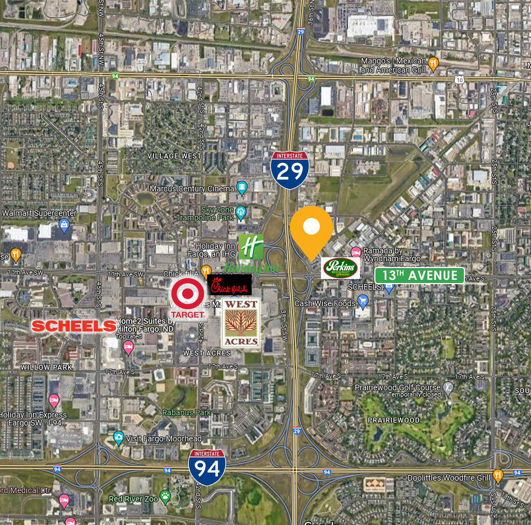 This is a former restaurant building available for sale or lease, situated at the crossroads of I-29 and 13th Avenue S. The stand-alone quick service restaurant building features a visible pylon sign, a large parking lot, and a drive-thru. Traffic counts near the property include over 66,000 on I-29 and 27,000 on 13th Avenue. The building has a total area of 4284 square feet. Inside, the turn-key restaurant space includes seating areas, booth fixtures, a large order counter, a kids play area, two restrooms, a kitchen area with equipment available, sinks, and an office area. This property is suitable for a new business or investment.