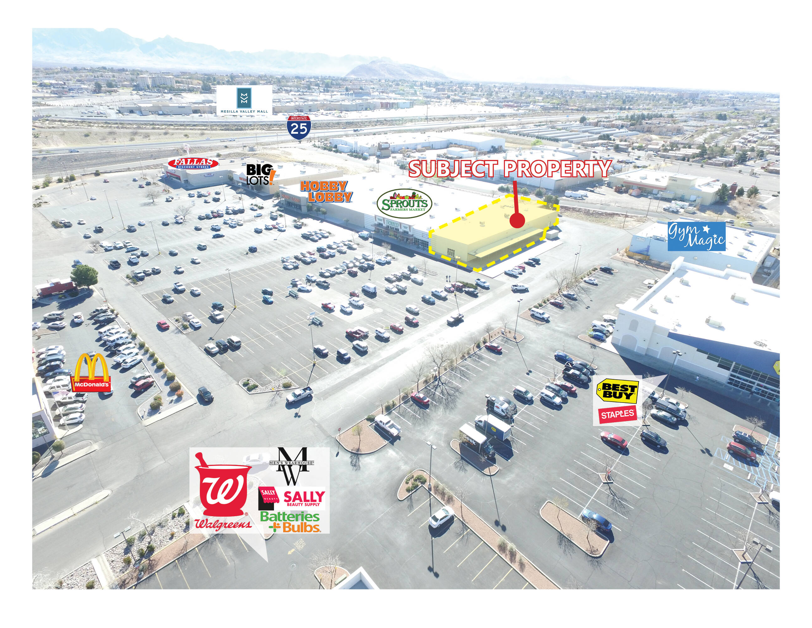 This retail space offers approximately 11,574 square feet. The location benefits from a traffic count of 27,709 vehicles per day. Nearby tenants include Best Buy, Hobby Lobby, Fallas, Walgreens, Wal-Mart Supercenter, Staples, Bed Bath and Beyond, and Old Navy.