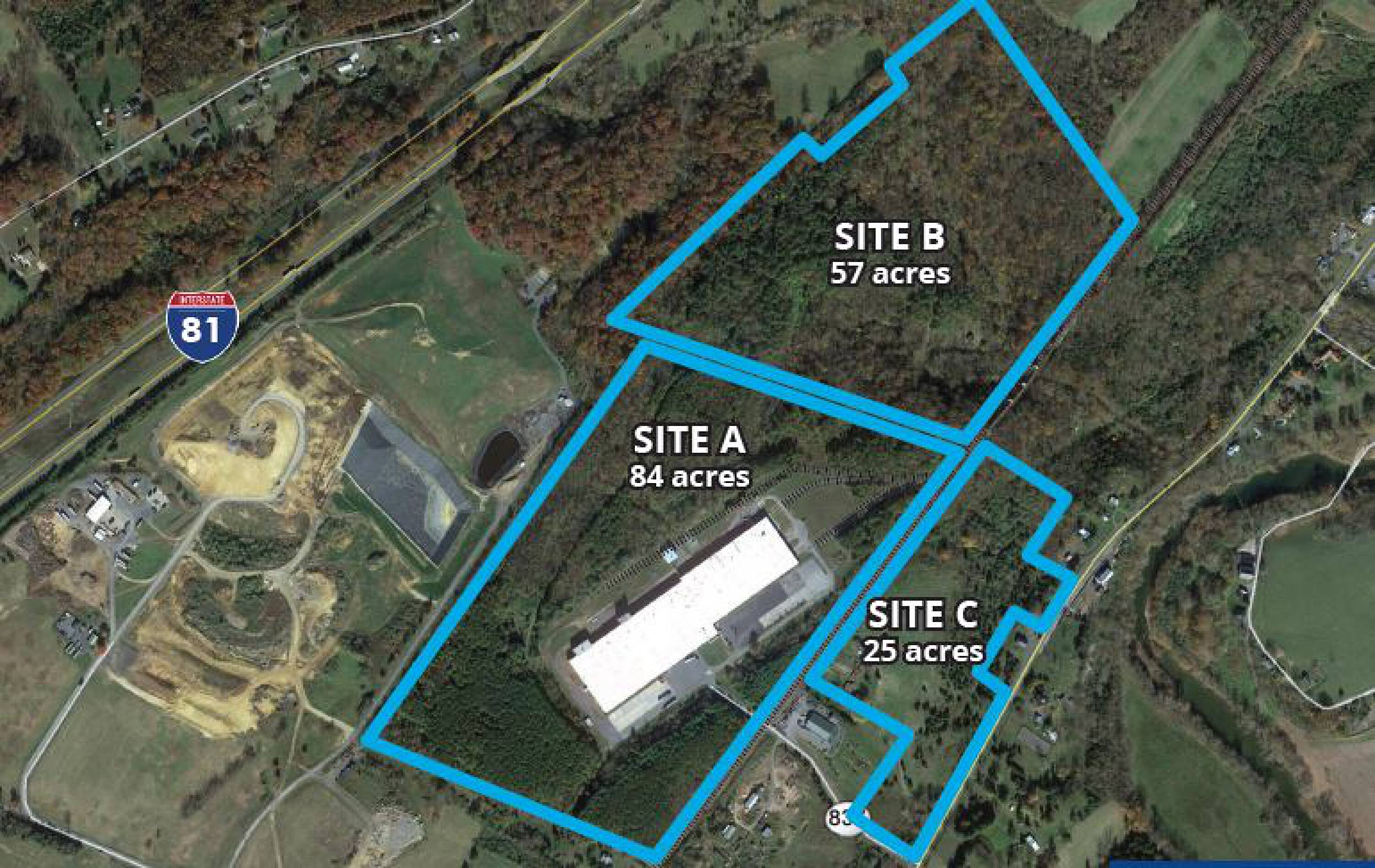 This industrial property features build-to-suit options across 166 acres. Site A includes a building constructed in 1974 and renovated in 2014 with $3M in improvements, offering between 27,000 and 54,000 square feet. It has an on-site, spring-fed well with a 300,000 gallon/day capacity, a 1-2,500 KVA transformer, 6,000 amp, 227-480 volt, 3-phase, 4 wire service, and a primary substation on-site with a possible upgrade to 30 KVA. The site is connected to public sewer and has a 12” gas line at 15 PSI from Washington Gas. Rail access is available to the site. There are 174 parking spaces. The building has a ceiling height of 25 feet clear and column spacing of 50 feet by 50 feet. Up to 2,000,000 square feet of buildable space is available.