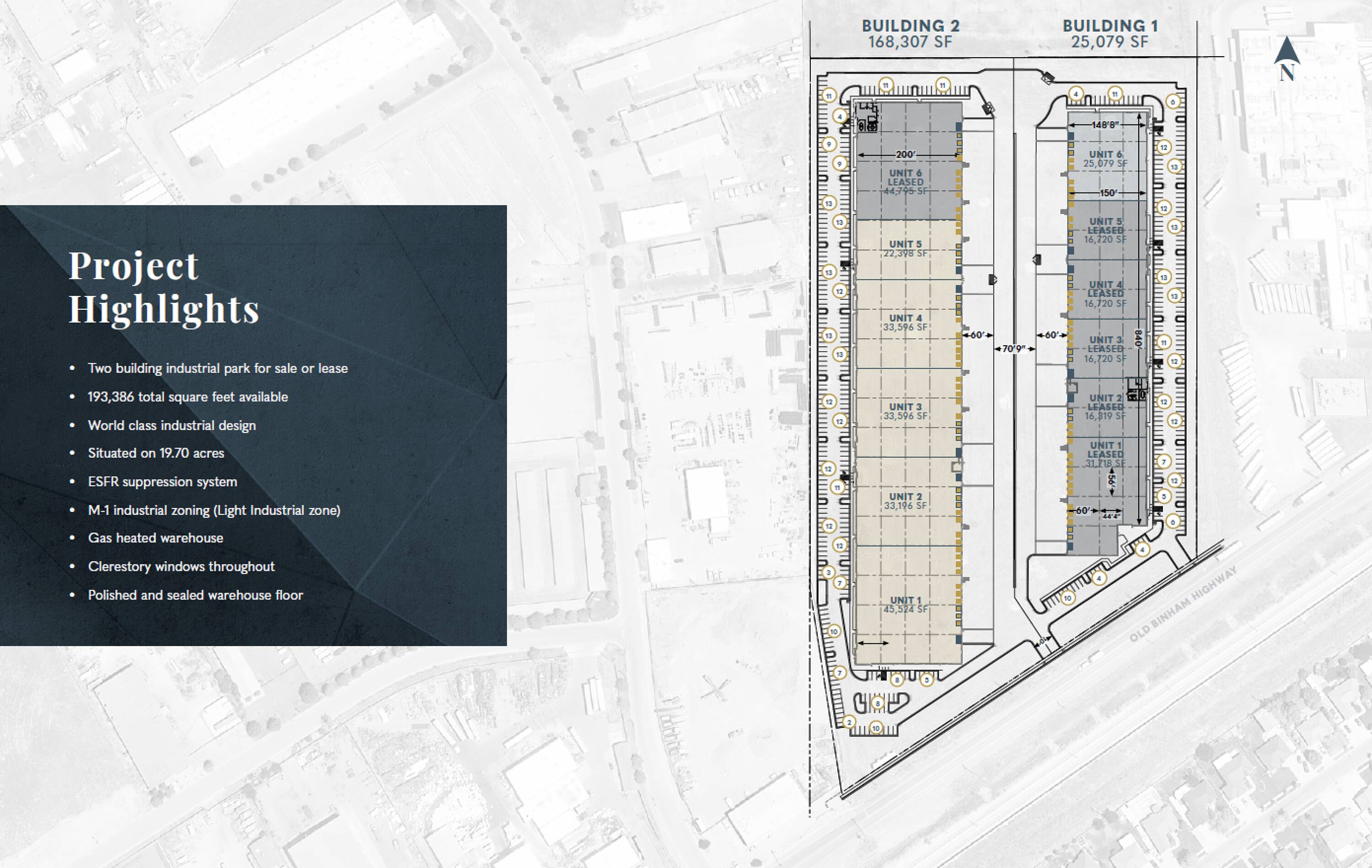 This industrial park features two buildings with a total of 193,386 square feet available for sale or lease. The property is situated on 19.70 acres and boasts a world-class industrial design. It includes an ESFR suppression system and M-1 industrial zoning (Light Industrial zone). The warehouse is gas heated and features clerestory windows throughout. The warehouse floor is polished and sealed.