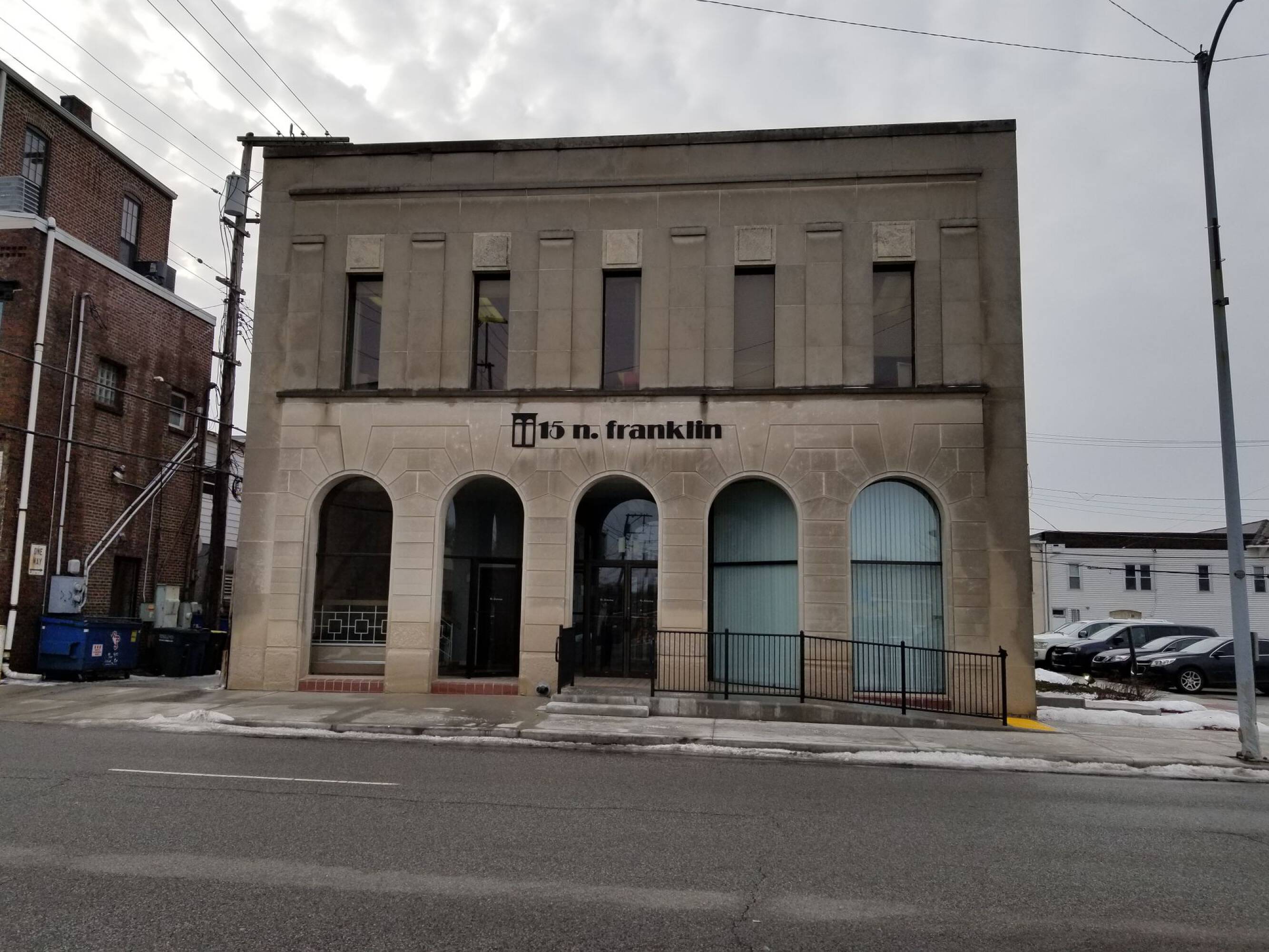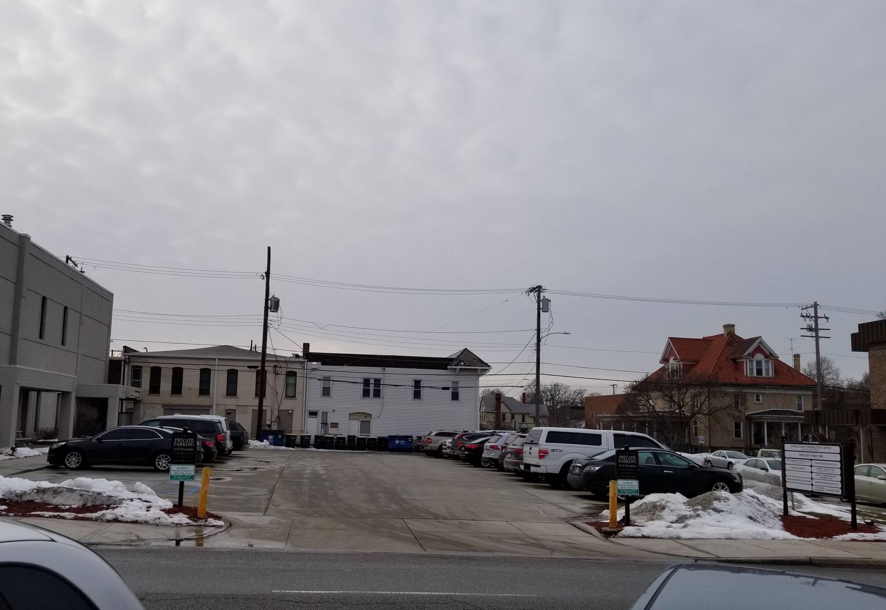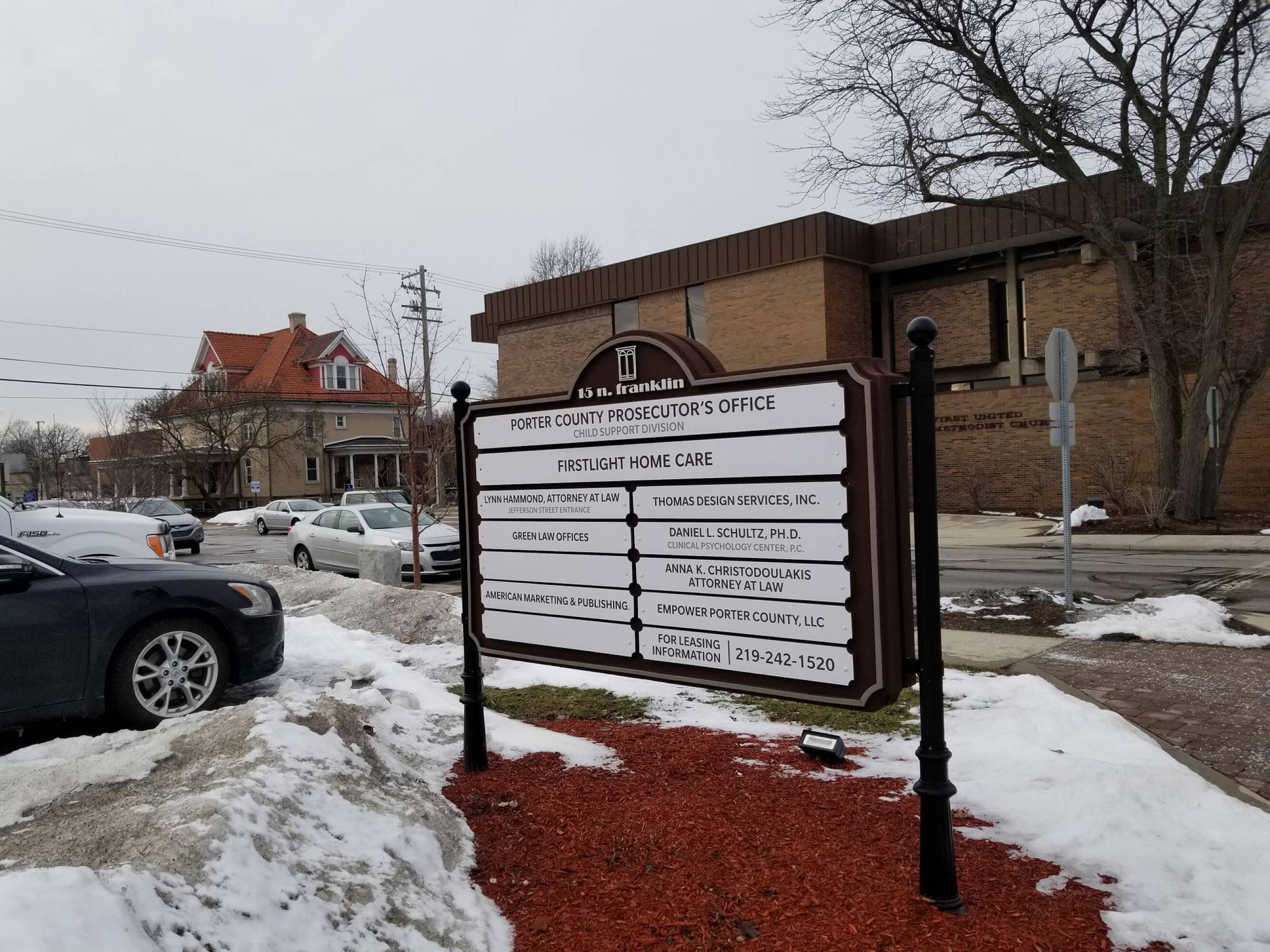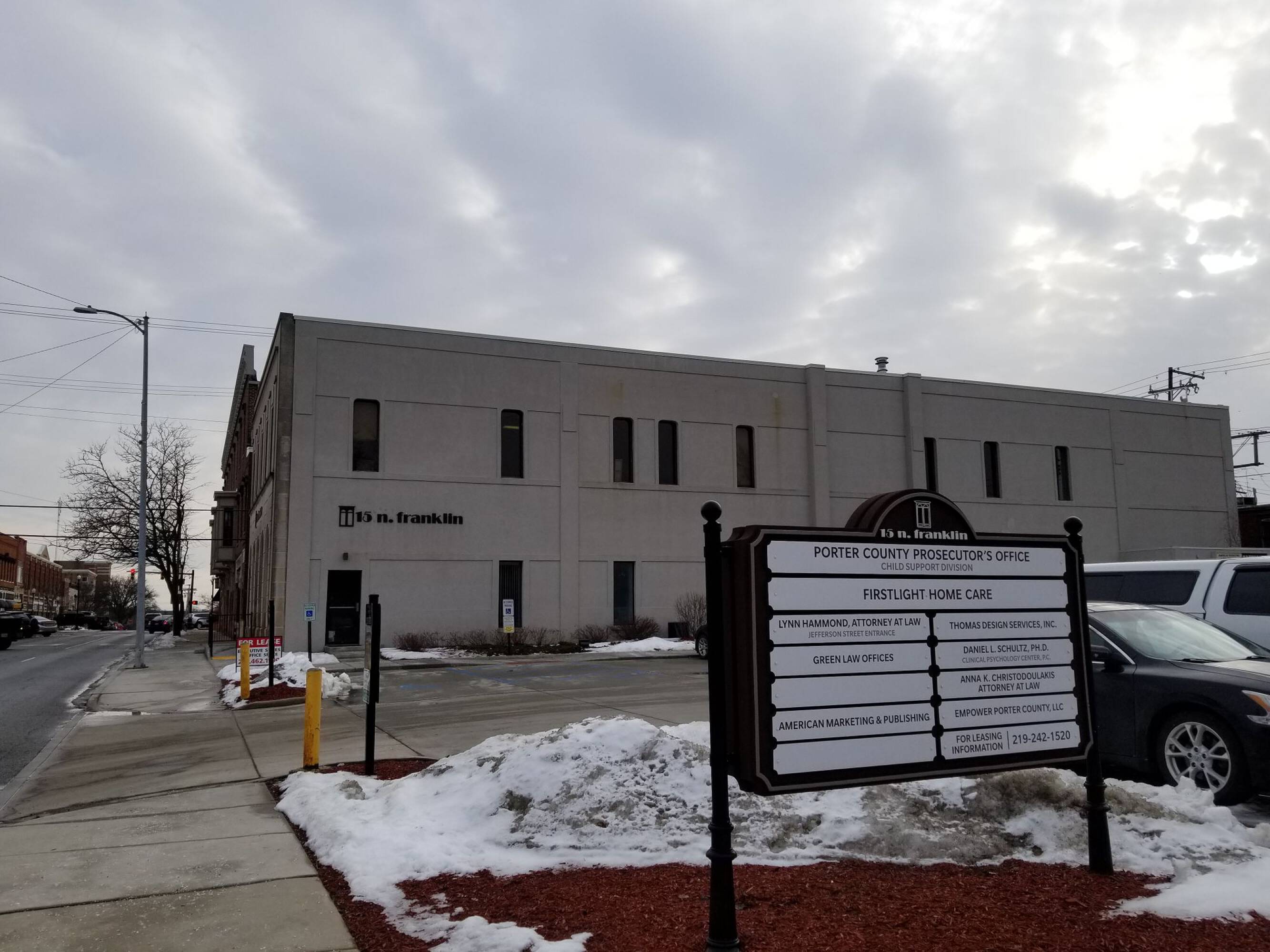 Two-story office building with parking and signage in downtown Valparaiso.