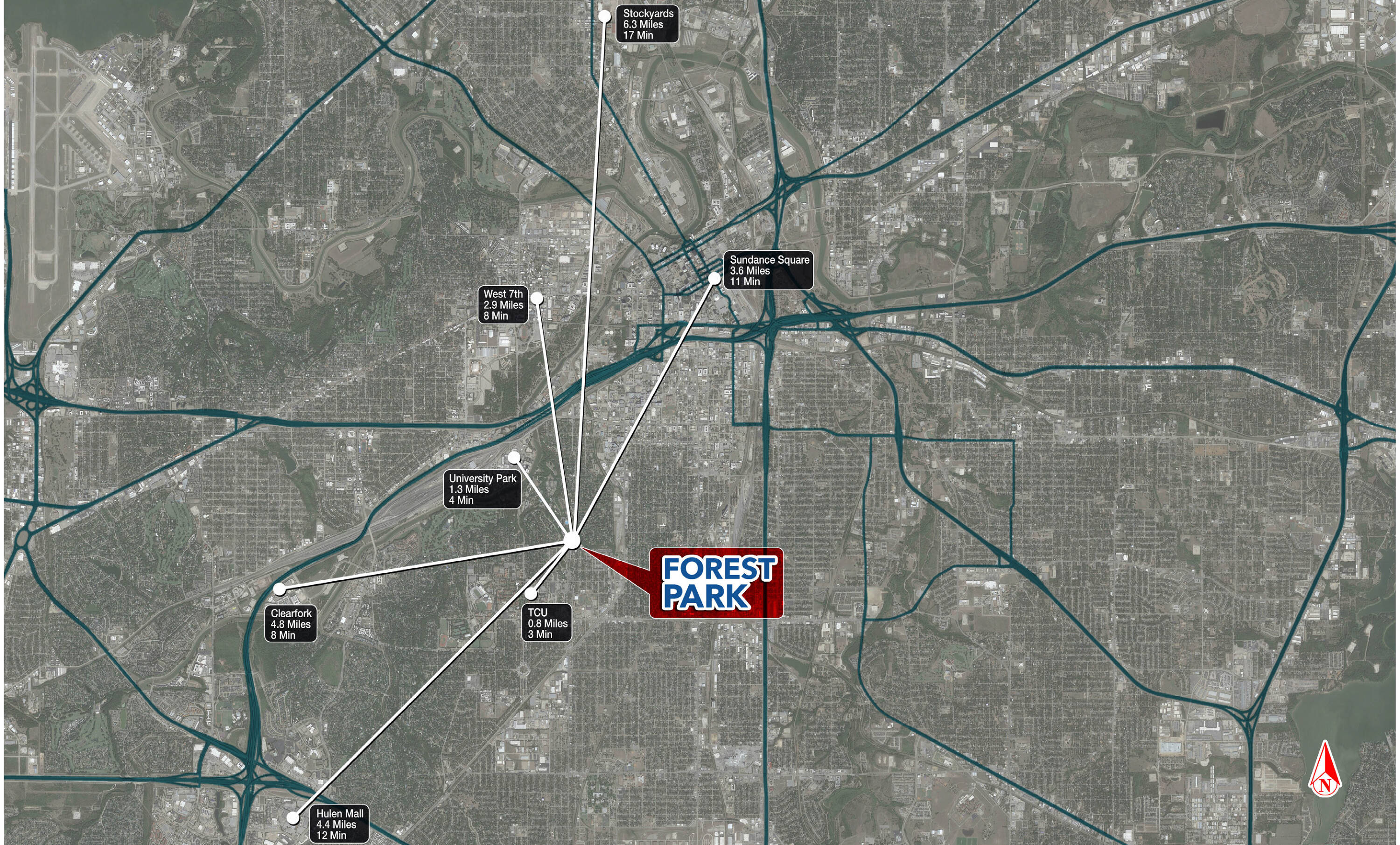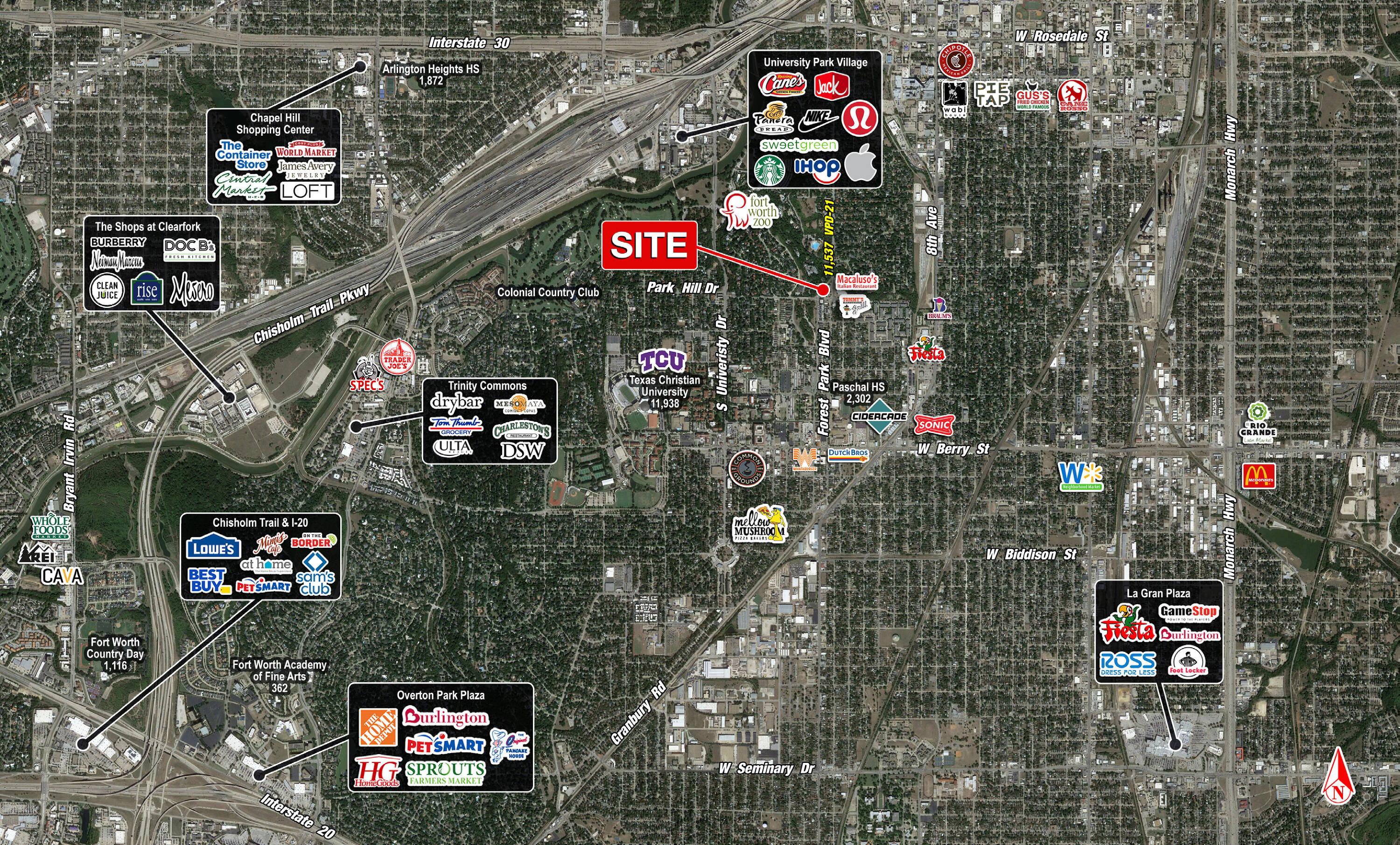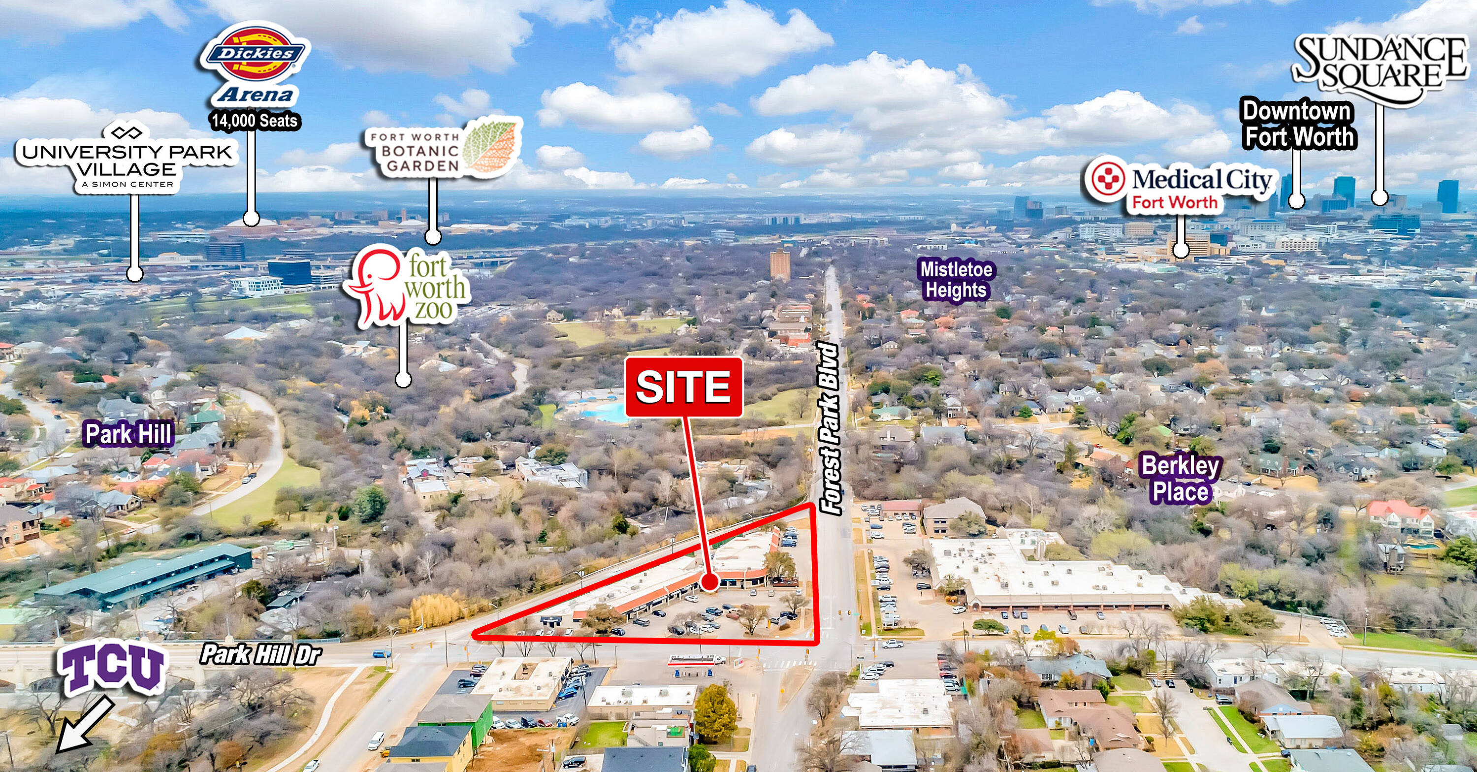 Retail and restaurant spaces are available at the intersection of Park Hill Drive and Forest Park Boulevard. The property is located less than 1 mile from the campus of Texas Christian University (TCU) and is in close proximity to the Fort Worth Zoo and Medical City Fort Worth. The location benefits from its position within established neighborhoods of Fort Worth.