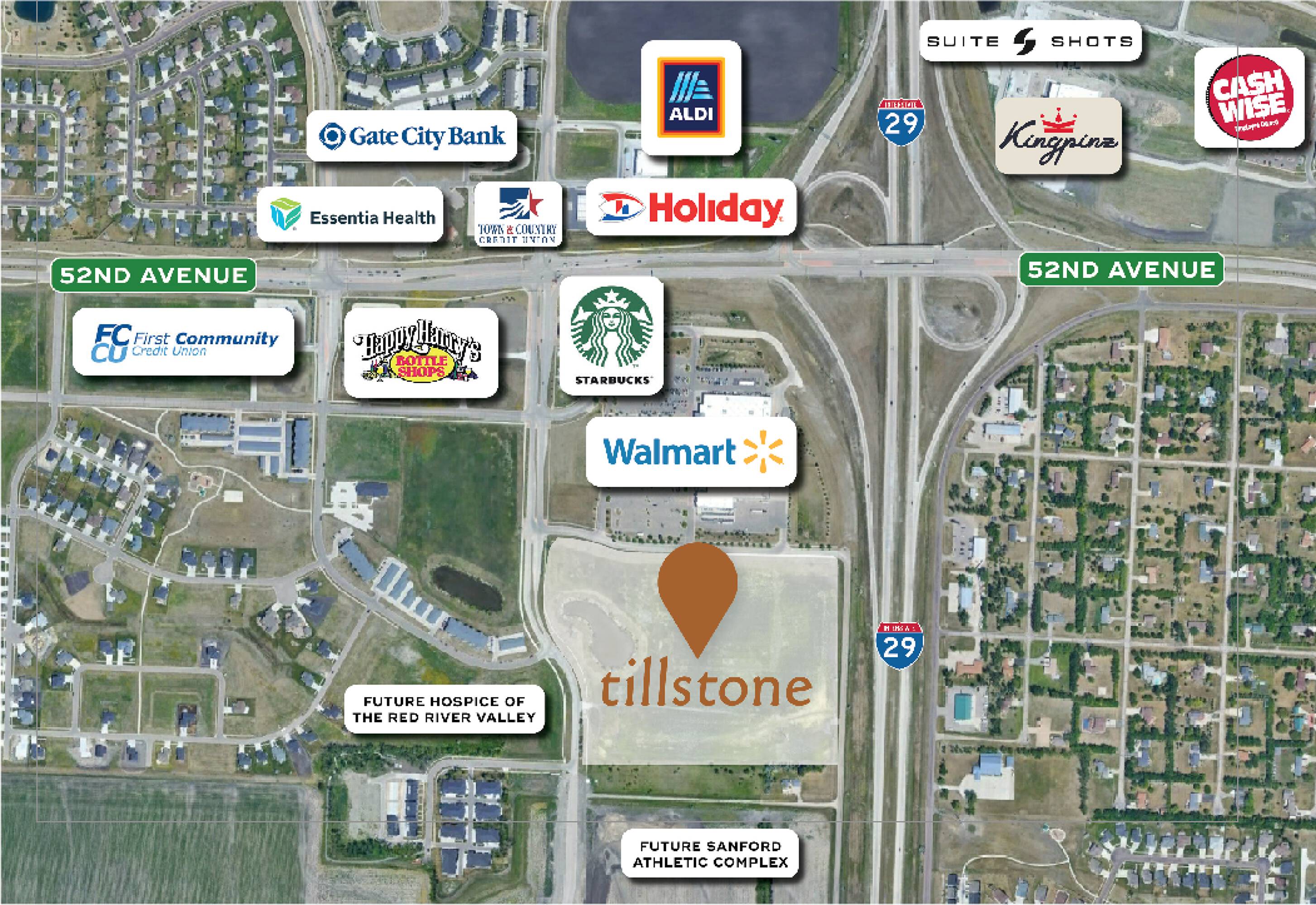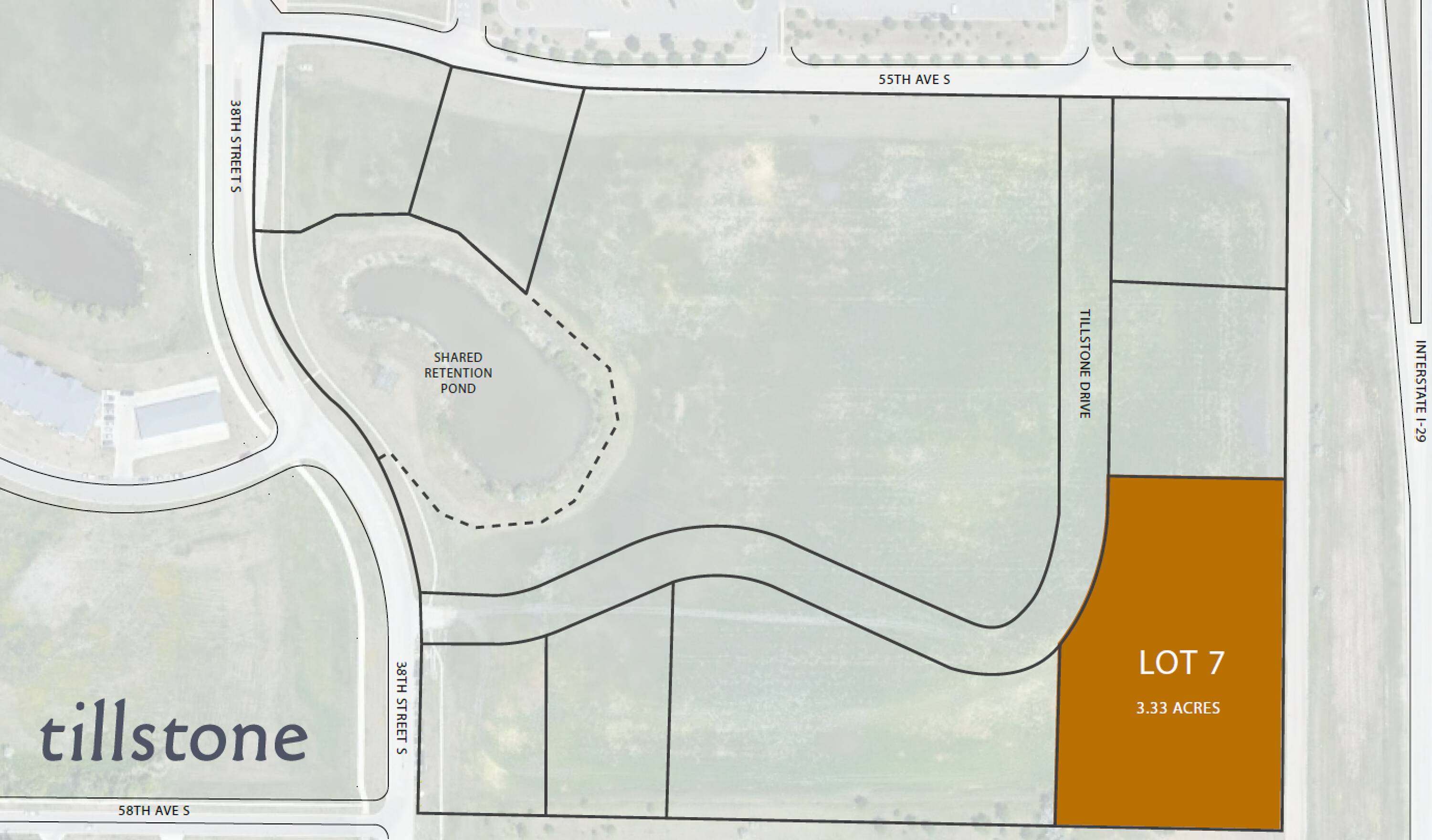 Commercial lots are available for sale or build-to-suit opportunities at Tillstone, a new development in south Fargo. The commercial lots at Tillstone offer a location south of Walmart with visibility from I-94 and 52nd Ave South. The development's proximity to residential neighborhoods, commercial businesses, and retailers complements the site's visibility with consumer traffic. The property includes a shared retention pond.