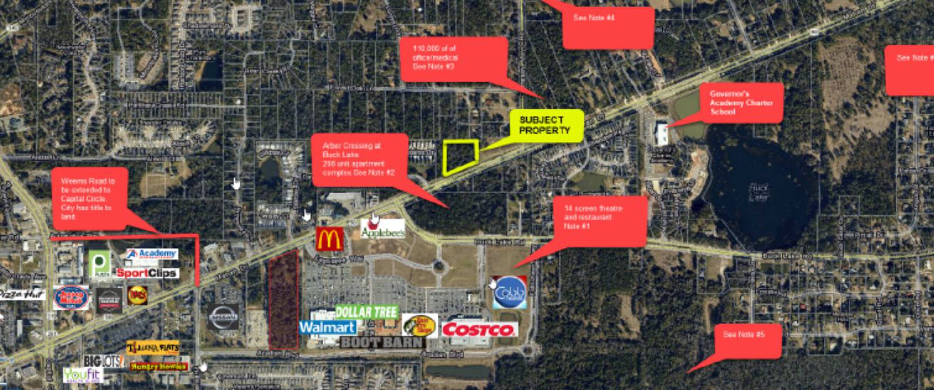 This commercial real estate tract is suitable for commercial and mixed-use development. The property allows for up to 16 units per acre of residential space and up to 12,000 square feet per acre of commercial space. It features over 435 feet of frontage on Mahan Drive. City water and sanitary sewer services are available. The topography of the land is considered good. Vehicle access is available with right-in, right-out, and left-in options. The property is located less than a quarter mile from Walmart, Costco, Bass Pro, Dollar Tree, Boot Barn, and Applebee's.