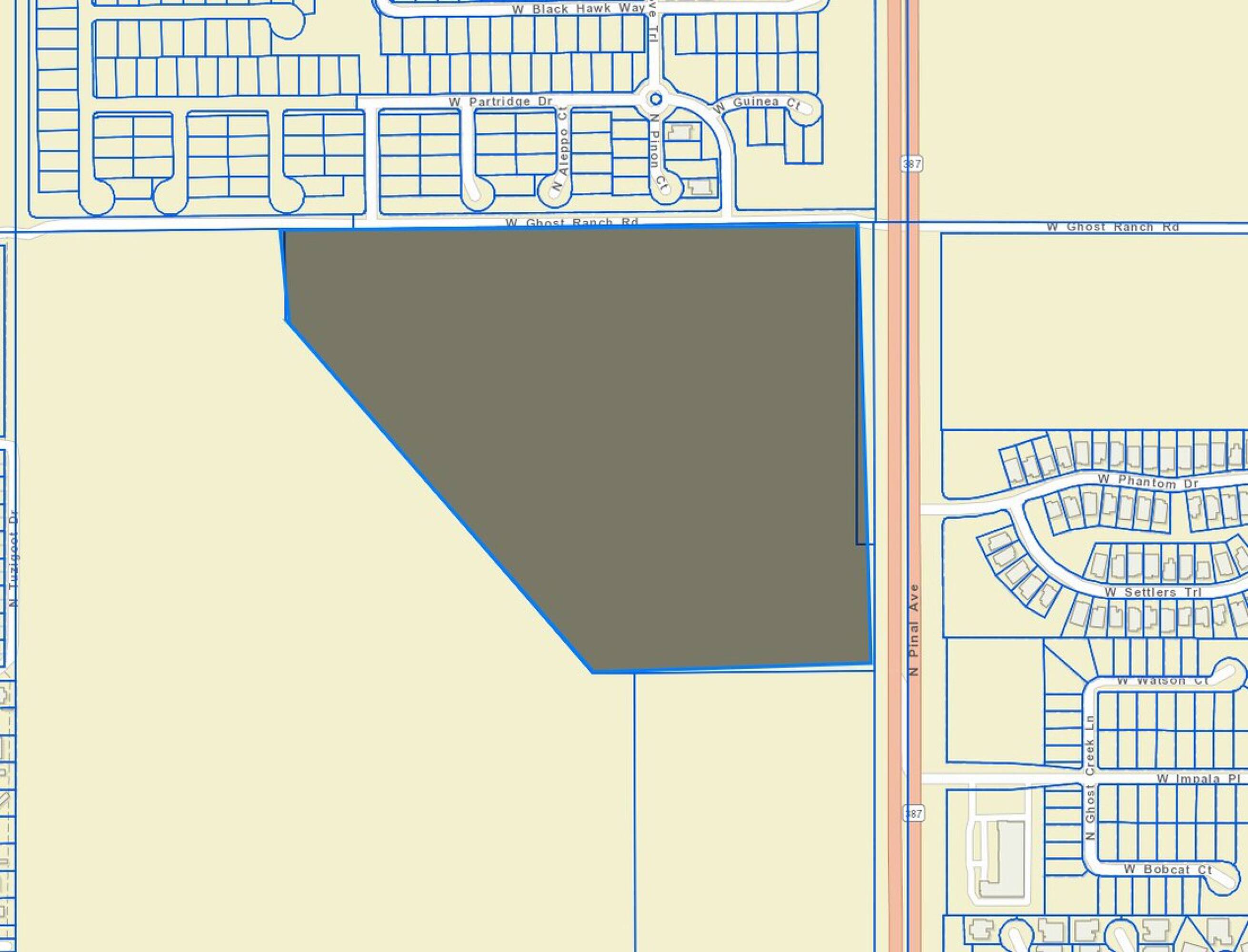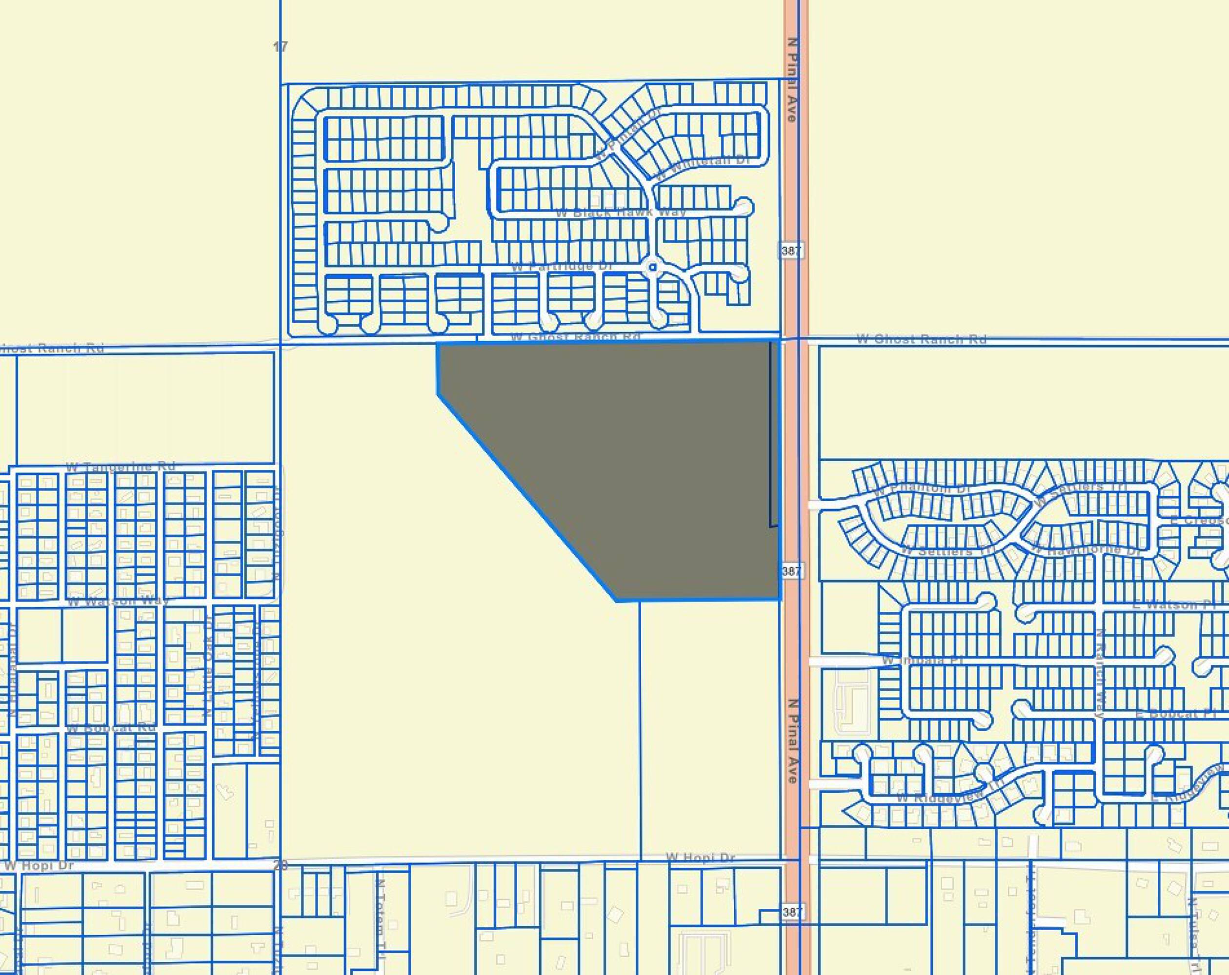 This 40.73-acre parcel is located at the southwest corner of Pinal Avenue and Ghost Ranch Road, offering visibility and 1,000 feet of frontage on Pinal Avenue. The level site benefits from paved roadway access and a controlled intersection. The location is experiencing residential and commercial growth and is situated minutes from Interstate 10 and major retail areas. The property is suitable for retail centers, grocery stores, big-box retailers, mixed-use developments, medical facilities, hospitality venues, multi-family housing, logistics operations, or a corporate campus.