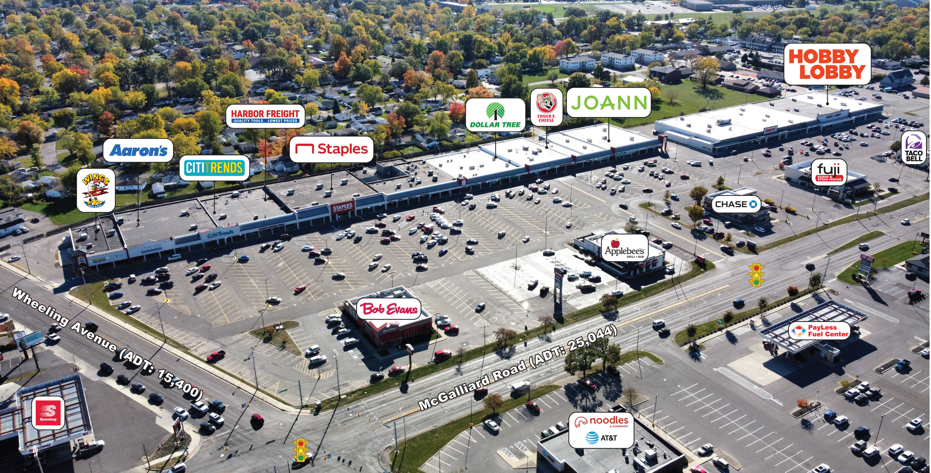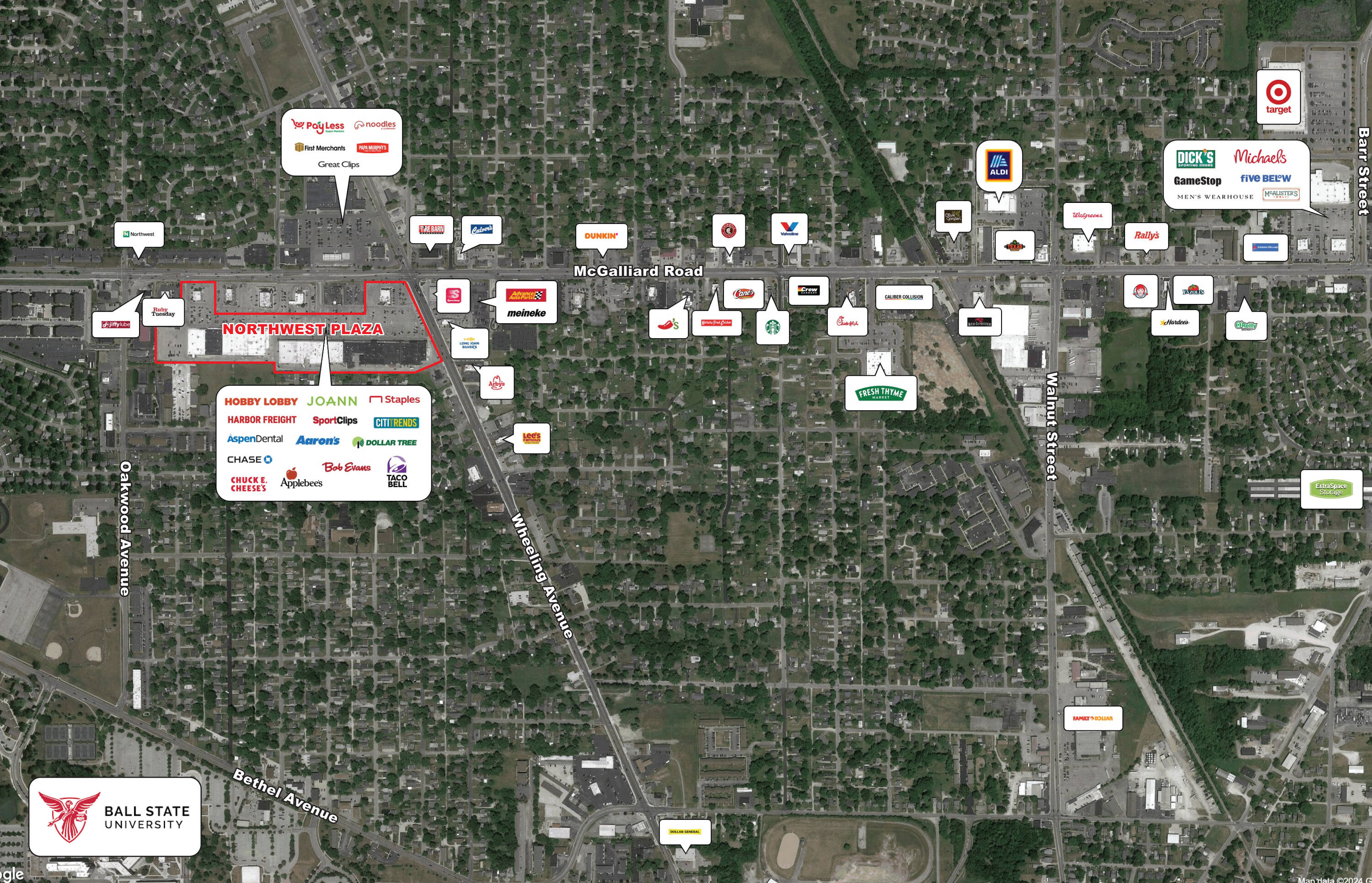 Retail spaces available in Muncie's main retail corridor.