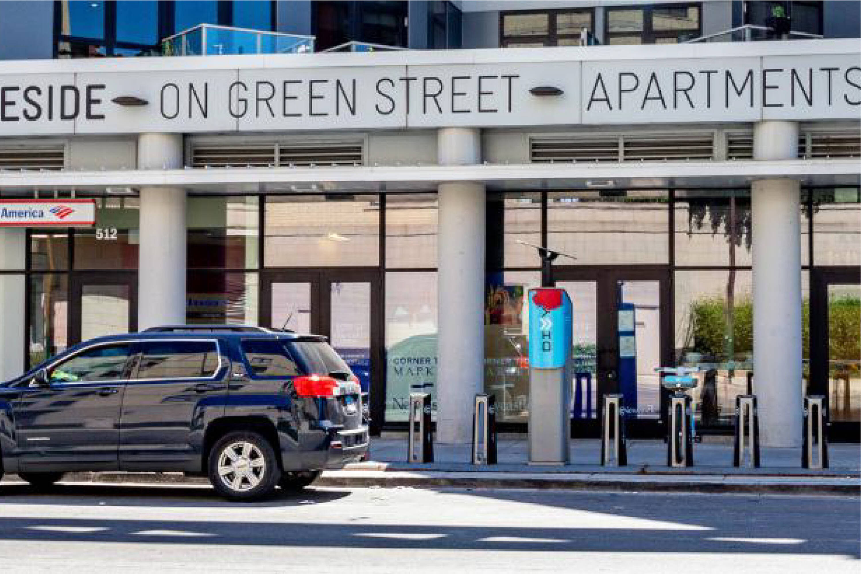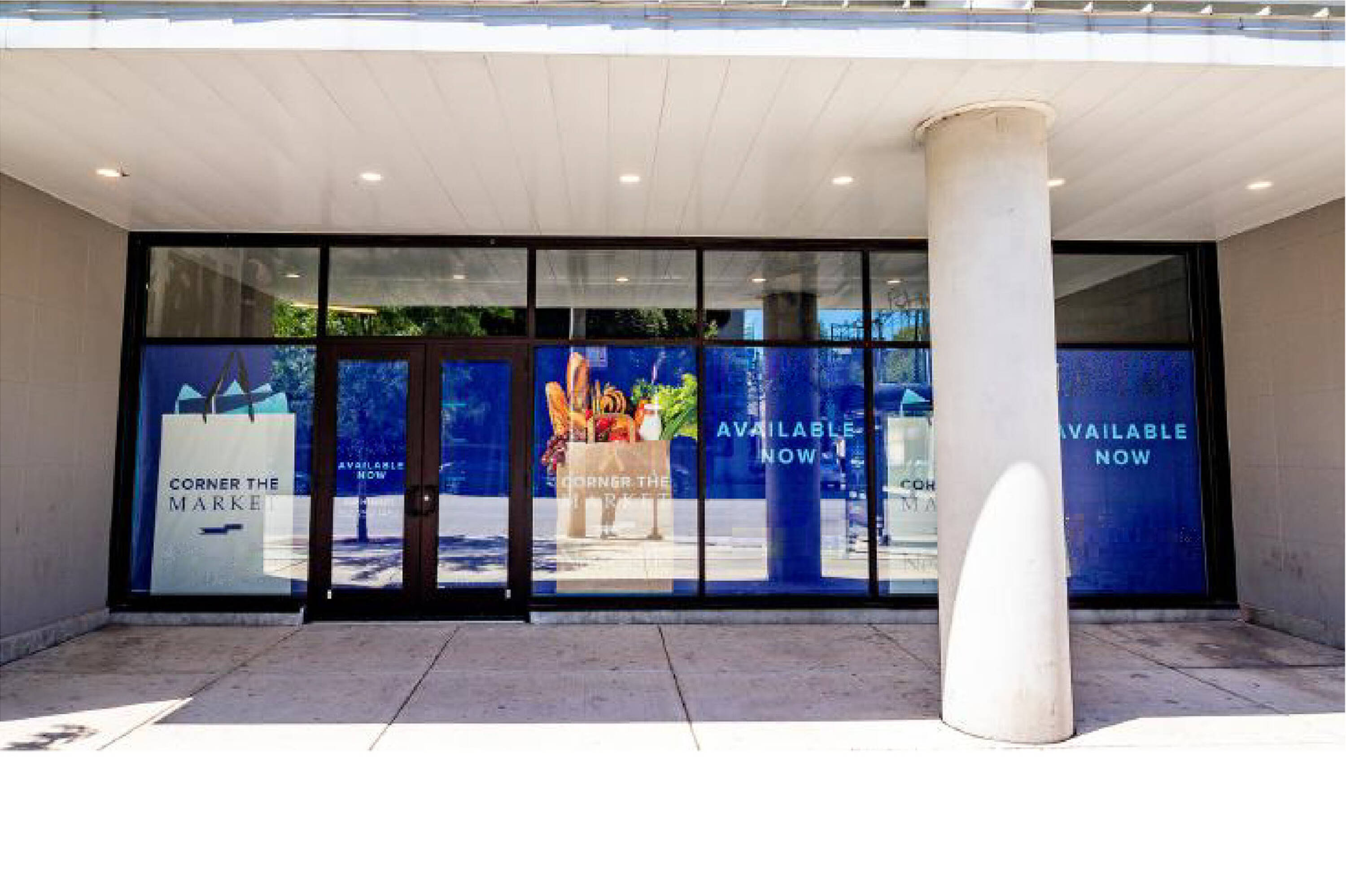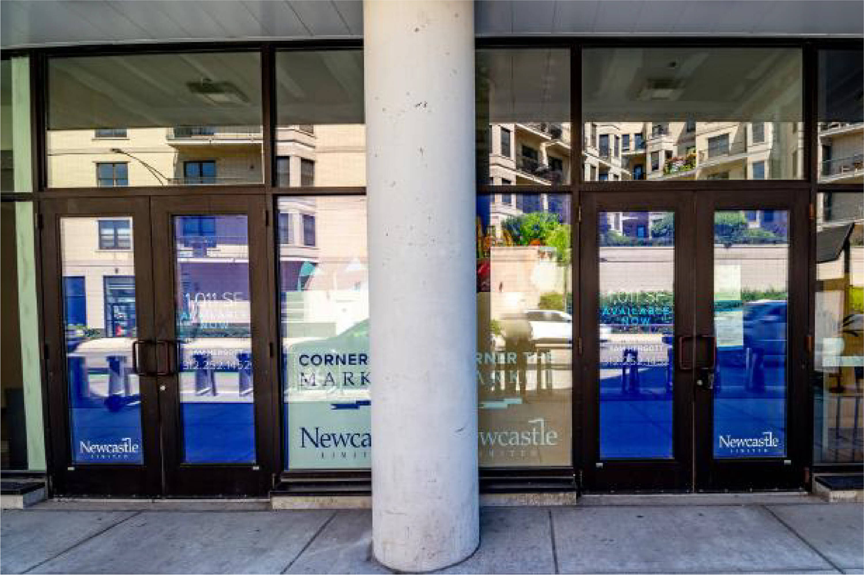 Retail space with outdoor seating near transit and new developments.
