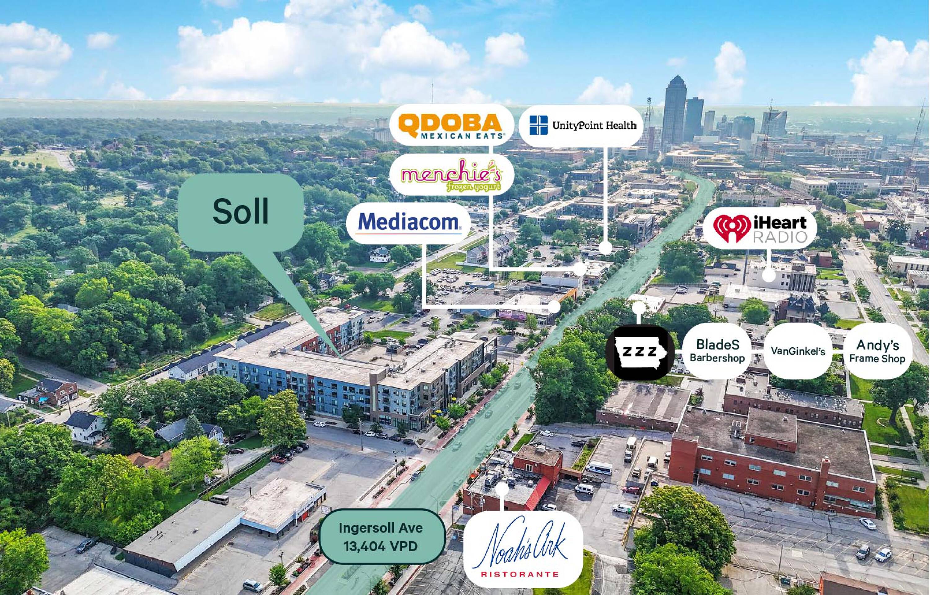 This property offers an excellent retail opportunity within the Soll Apartment Building, situated on the newly streetscaped Ingersoll Avenue. Its location is within walking distance of Des Moines’ newest Starbucks.