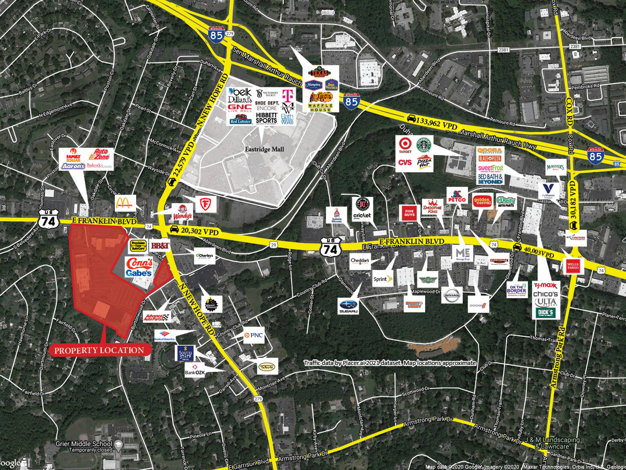 This property features: Prime location in Gastonia, NC, near the intersection of U.S. 74 and South New Hope Road on busy Franklin Boulevard.; Anchored by established retailers: Roses, Ollie’s, Burton’s Home Outlet, and Gabe’s.; Approx. 235,000 SF neighborhood center on 24 acres.
