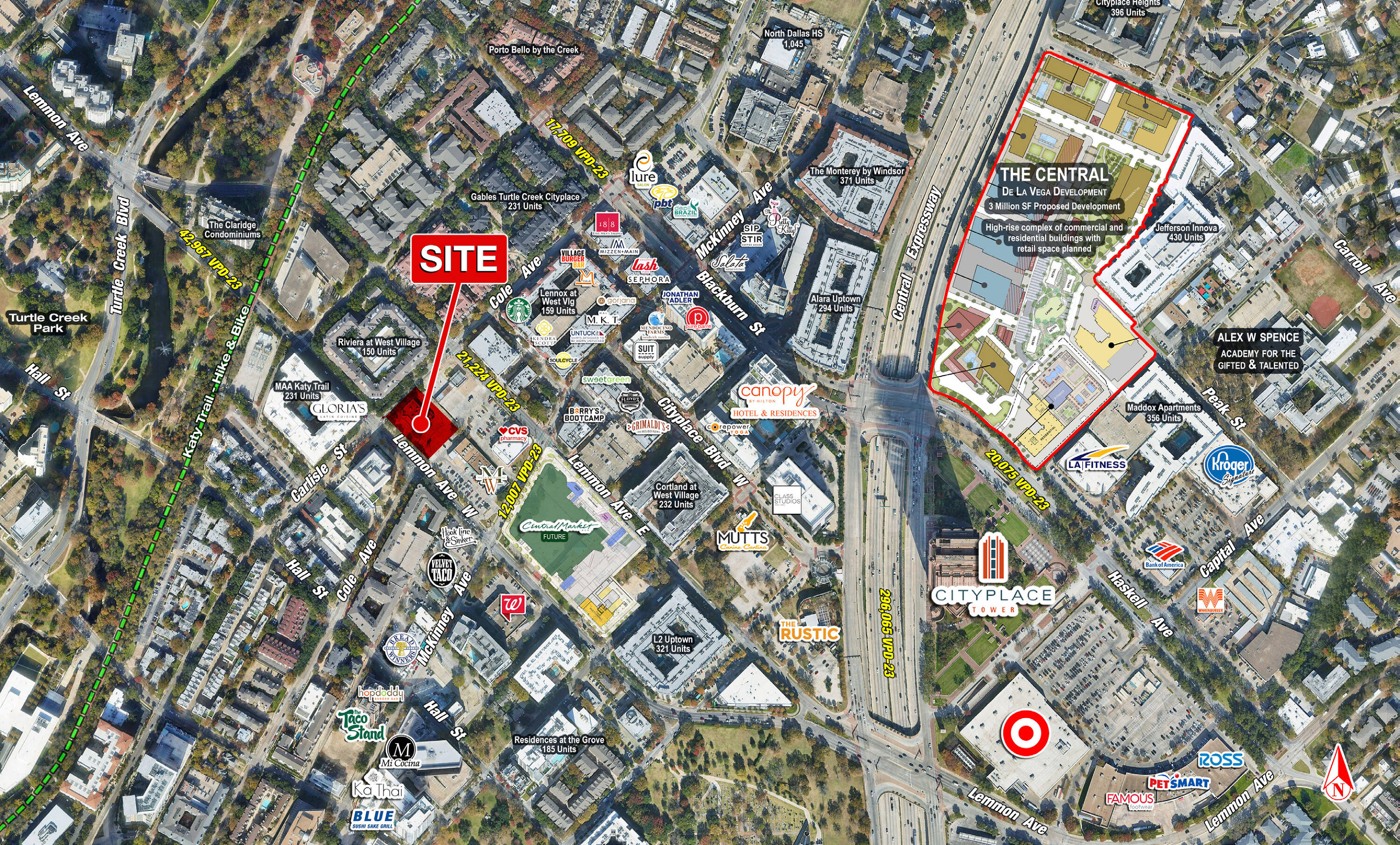 This high-profile retail space is located at the hard corner of Cole Avenue and Lemmon Avenue in Uptown, Dallas. Uptown is known as Dallas’ most walkable live-work-play neighborhood, featuring high-density residential areas, high-rise office towers, restaurants, and upscale hotels. The property benefits from its proximity to West Village, a vibrant shopping and dining district. The location experiences regular traffic, with over 23,790 vehicles per day.