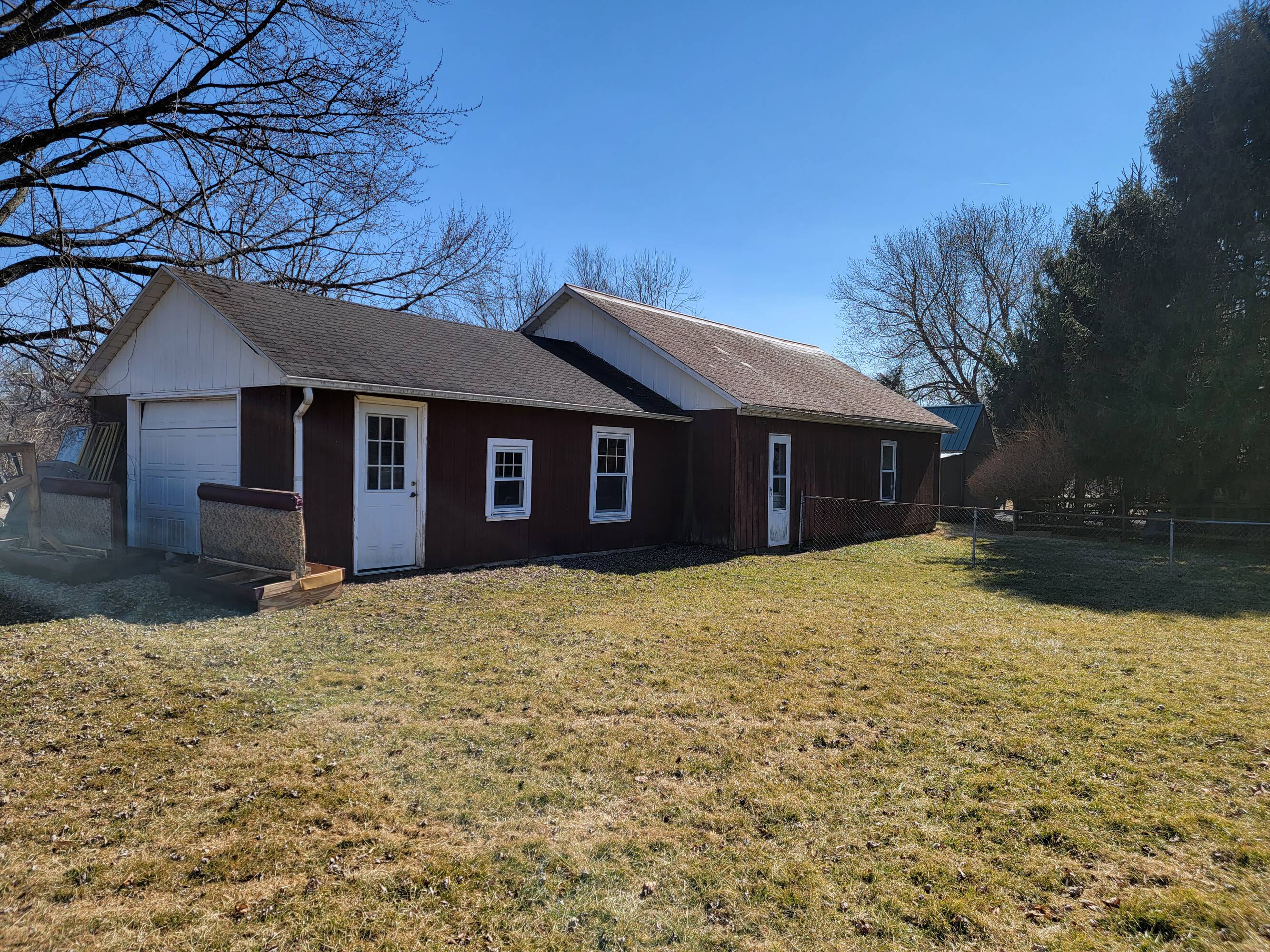 Two-unit apartment building with detached garage and large yard.