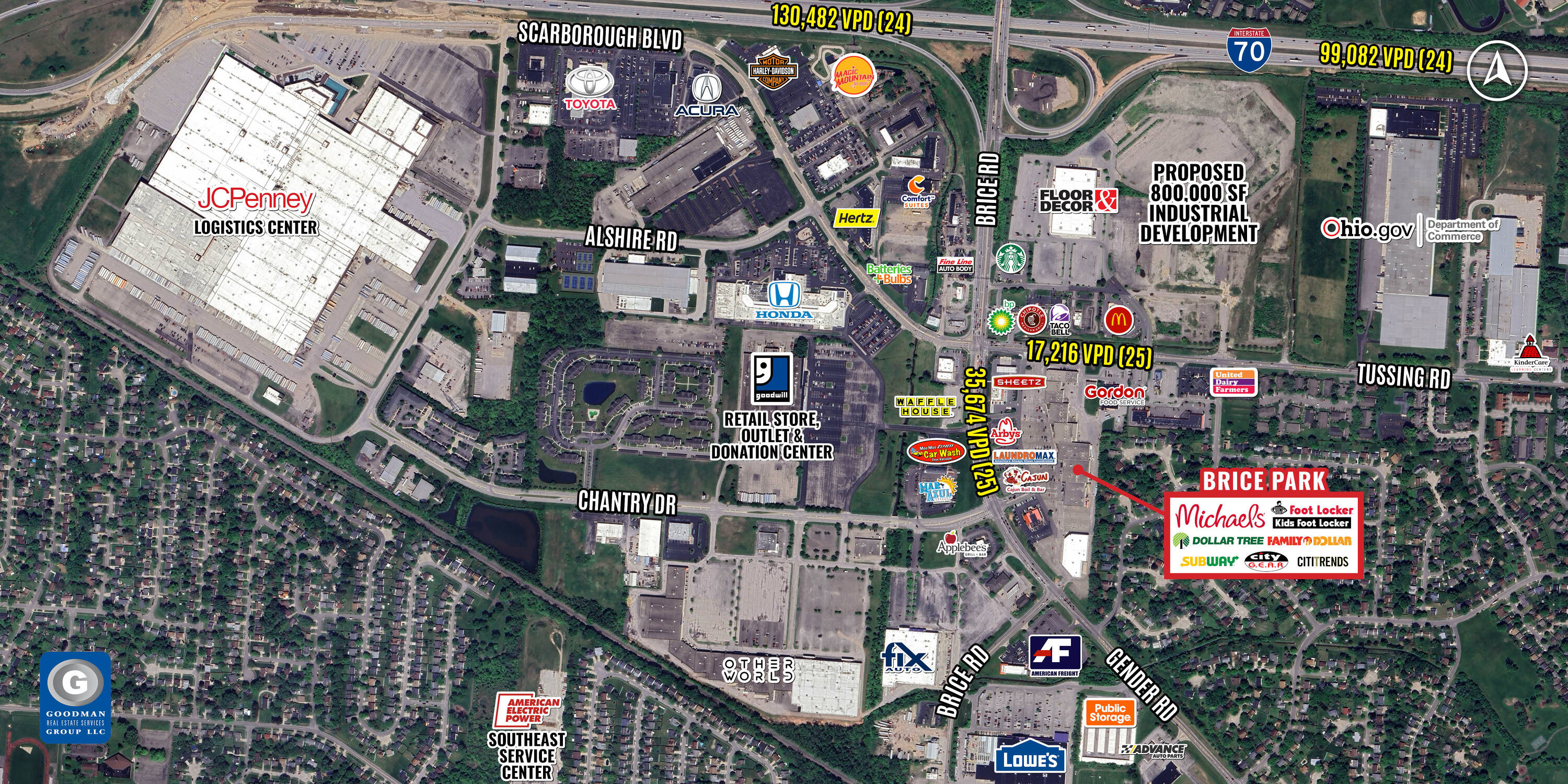 Available retail spaces include 7,200 SF and 8,000 SF options within a 145,000 SF shopping center. The property is located at the intersection of Brice Road, which sees 35,674 vehicles per day, and Tussing Road, which sees 17,216 vehicles per day, in Reynoldsburg. Current tenants include Michaels, Ollie’s Bargain Outlet, Foot Locker, Dollar Tree, Subway, and Sheetz. Pylon signage is available. The location offers access to Interstate 70, which has a traffic volume of 130,482 vehicles per day. The property is near a 2M SF, 24-hour JCPenney Logistics Center.