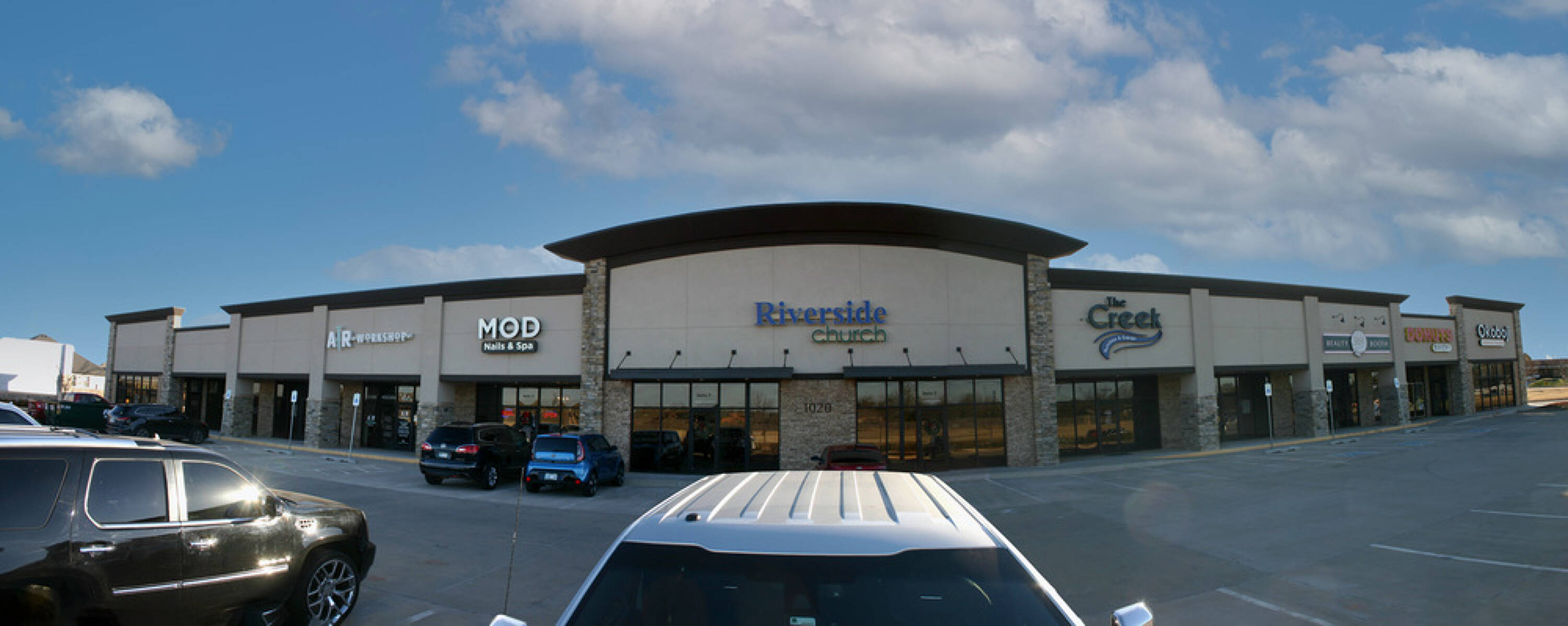 Newer shopping center with signage opportunities in a developing area.