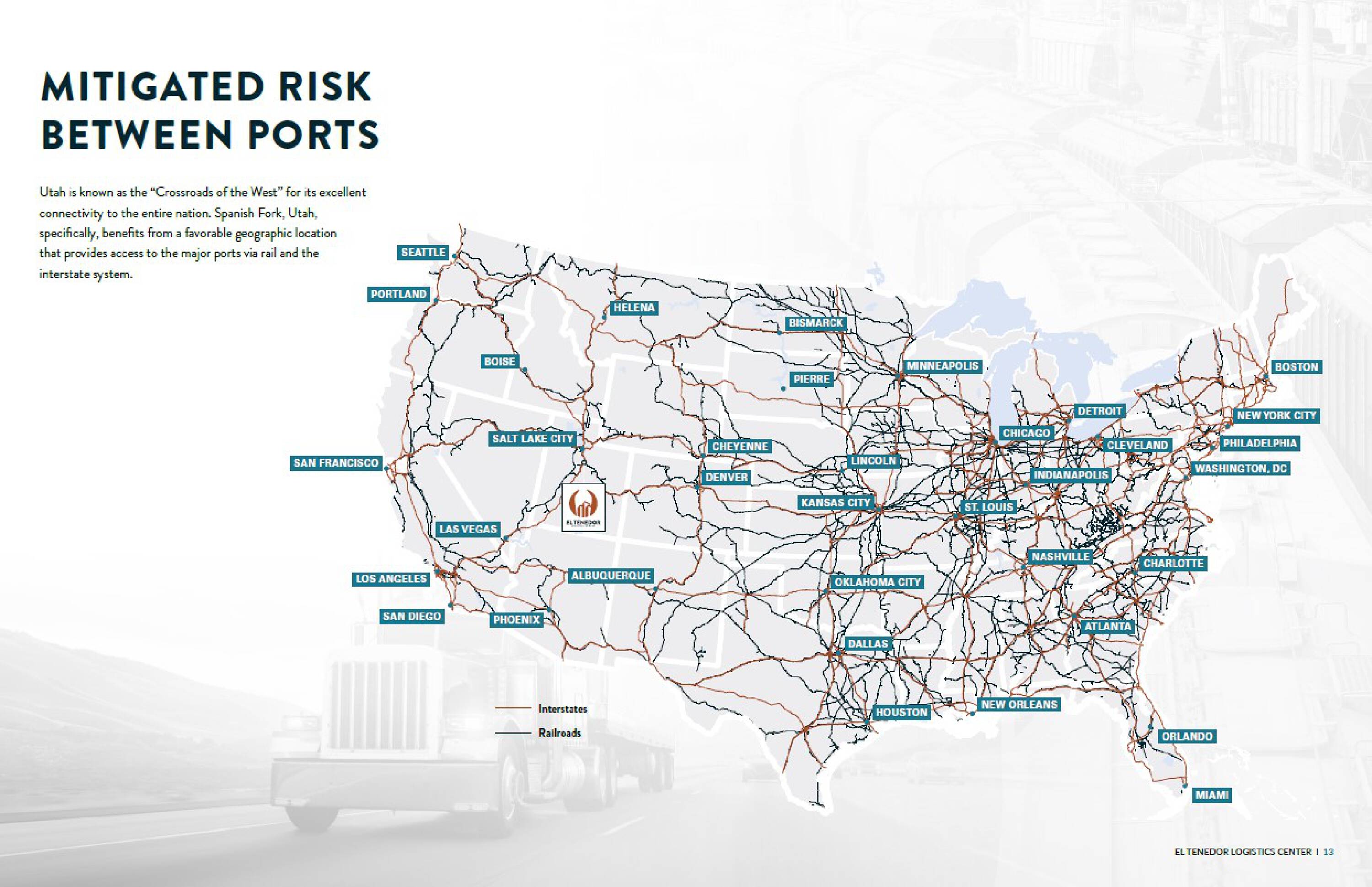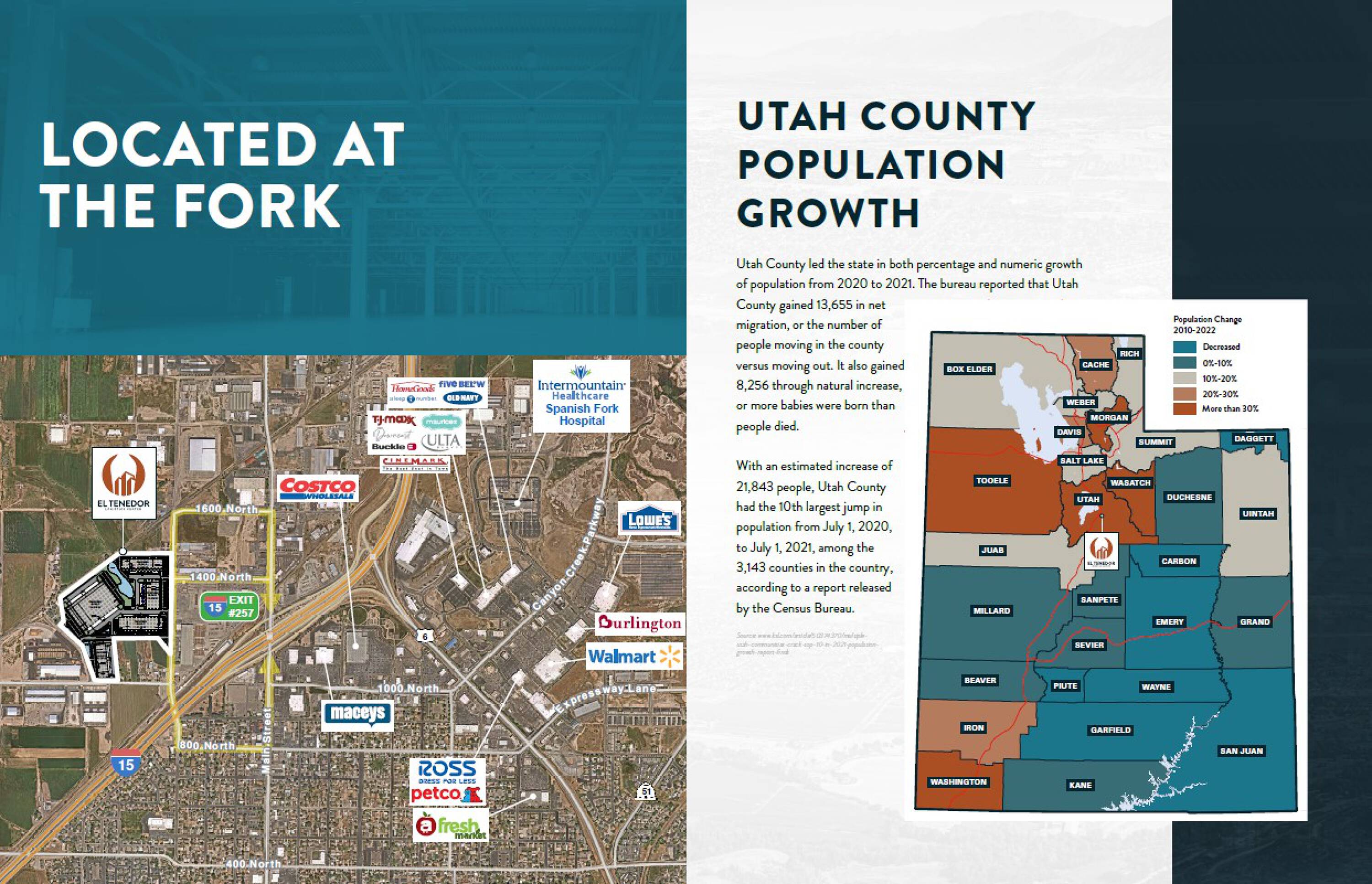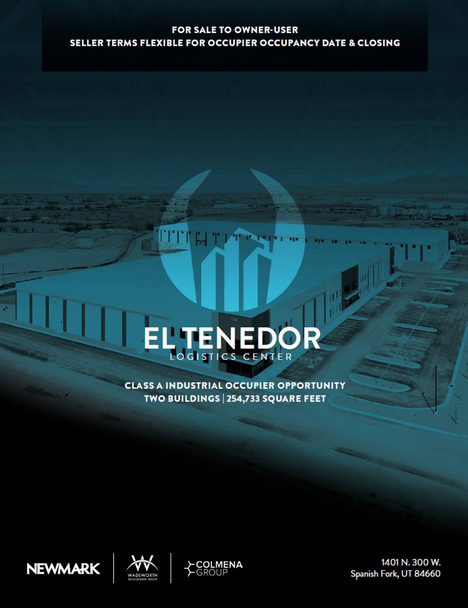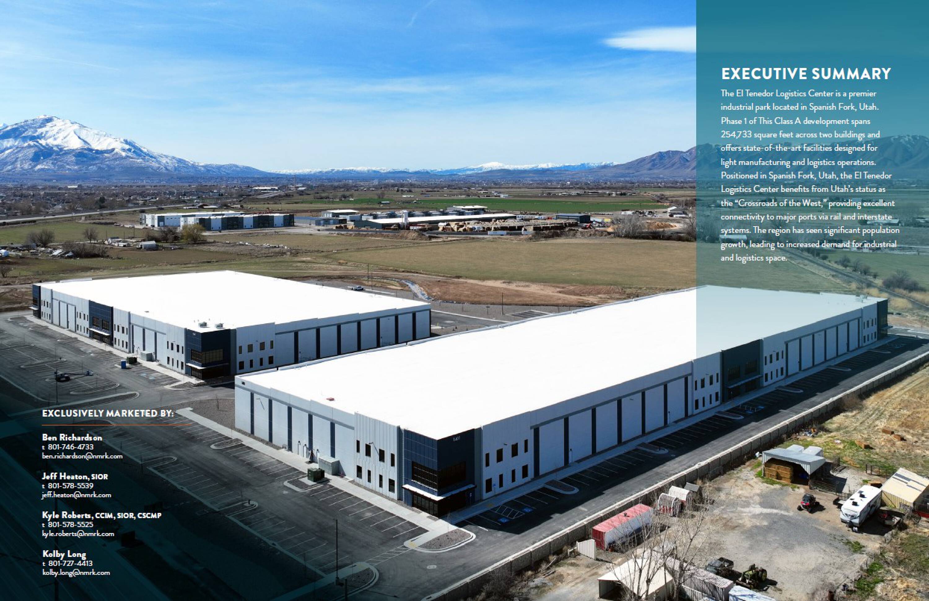 The El Tenedor Logistics Center is an industrial park located in Spanish Fork, Utah. Phase 1 spans 254,733 square feet across two buildings. It offers facilities designed for light manufacturing and logistics operations. Positioned in Spanish Fork, Utah, the El Tenedor Logistics Center benefits from Utah’s status as the “Crossroads of the West,” providing connectivity to major ports via rail and interstate systems. This opportunity is available for owner users. The region has seen population growth, leading to increased demand for industrial and logistics space.