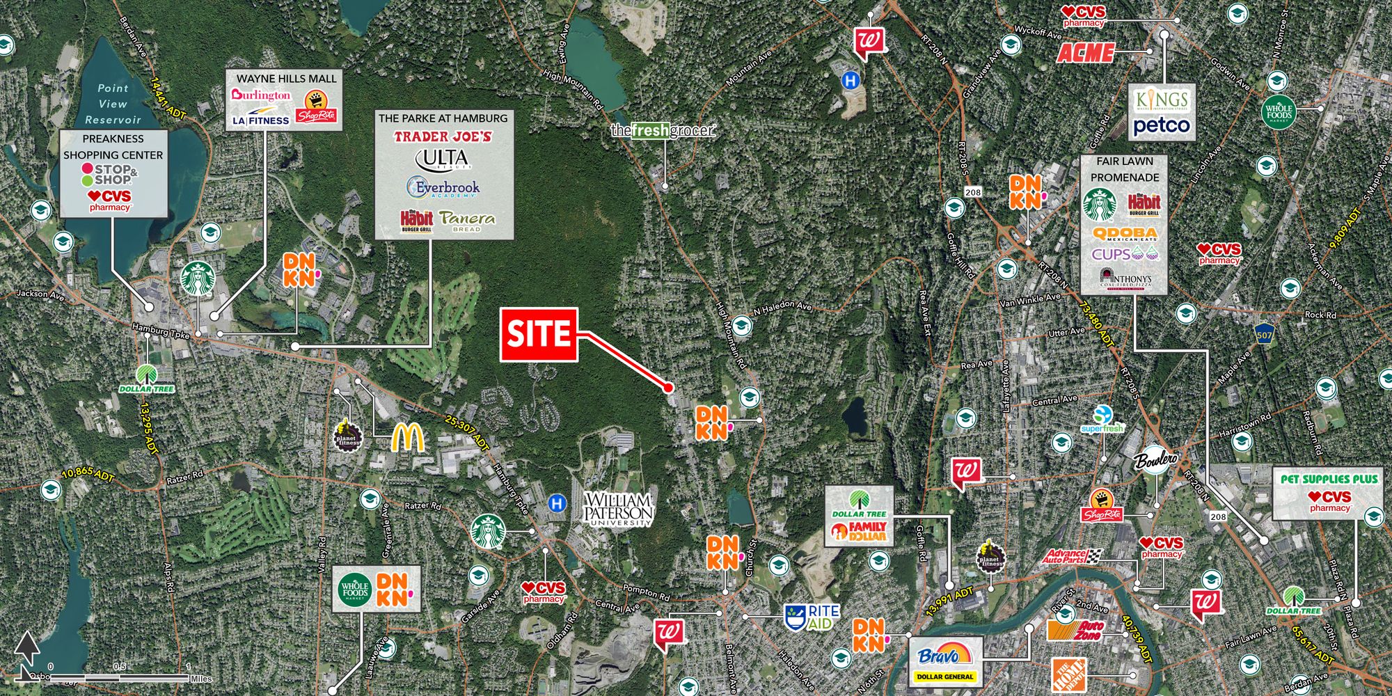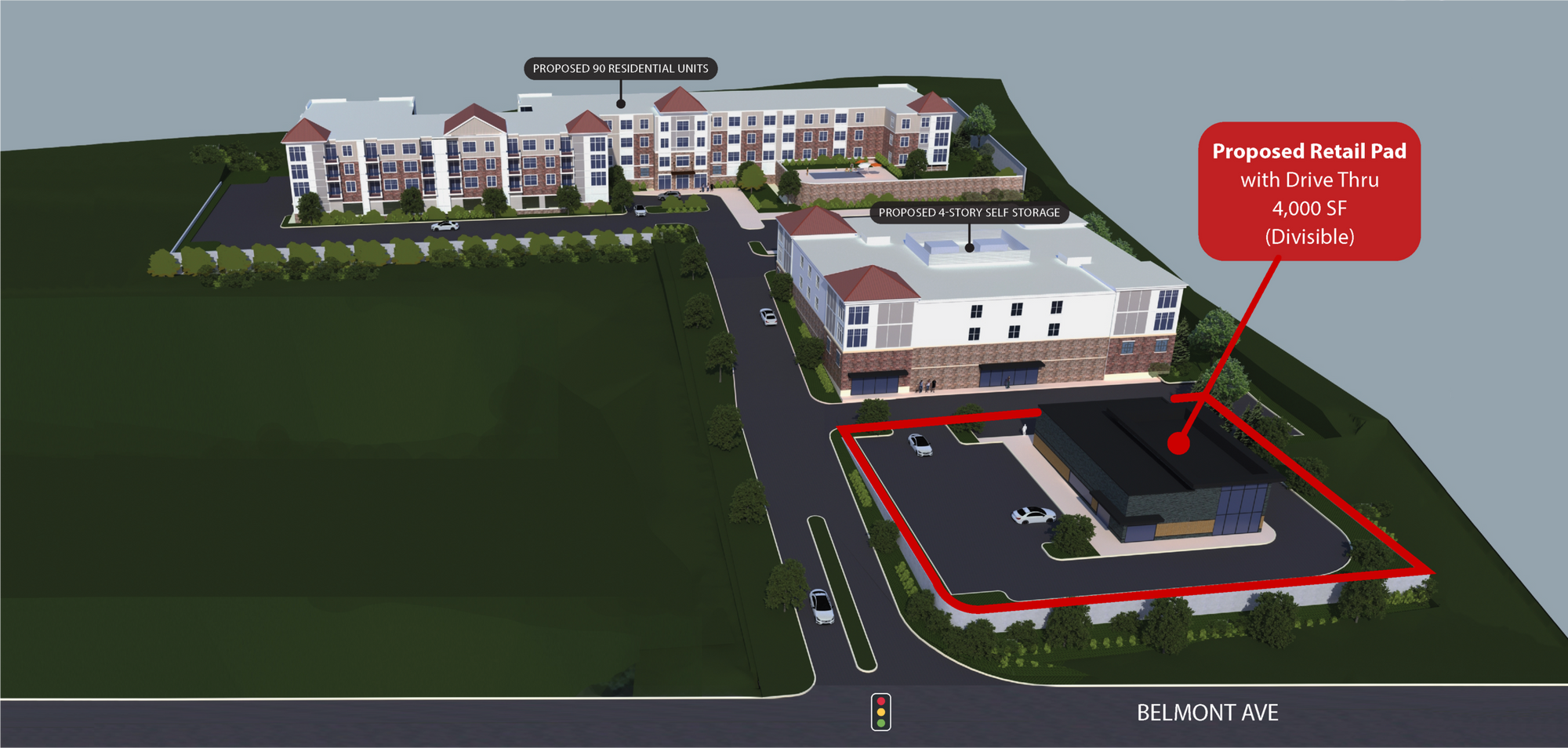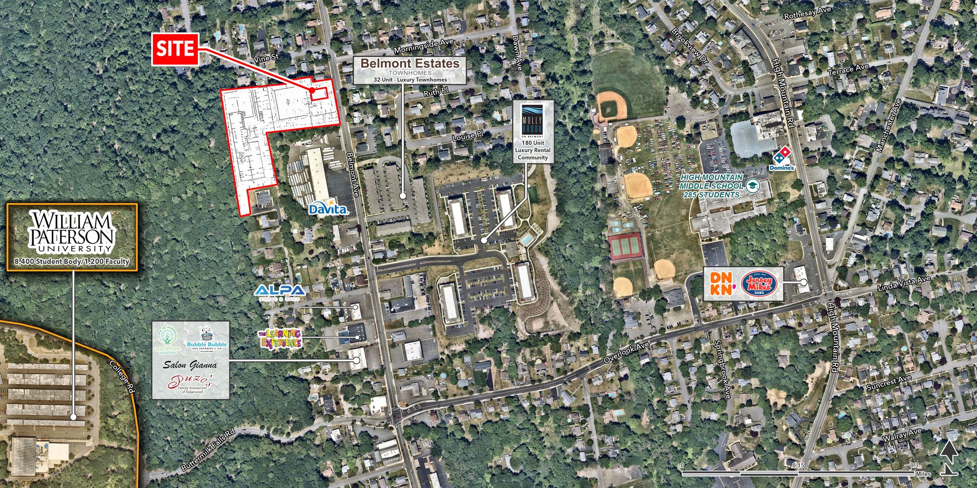 High Mountain Promenade is a new construction project located in North Haledon, near the Passaic and Bergen County lines. The development features a 90-unit apartment community, an 80,000-square-foot four-story self-storage facility, and a 4,000-square-foot divisible retail pad with a drive-thru. A new traffic signal is planned for the entrance of High Mountain Promenade on Belmont Avenue. The property is situated across from the new Molly Brook on Belmont residential community, which includes 180 units, and the Belmont Estates Townhomes. It is a 3-minute drive to William Paterson University and a 7-minute drive to St. Joseph's Hospital. Neighboring tenants include Fresh Grocer, The Learning Experience, Jersey Mikes, and Dunkin' Donuts.