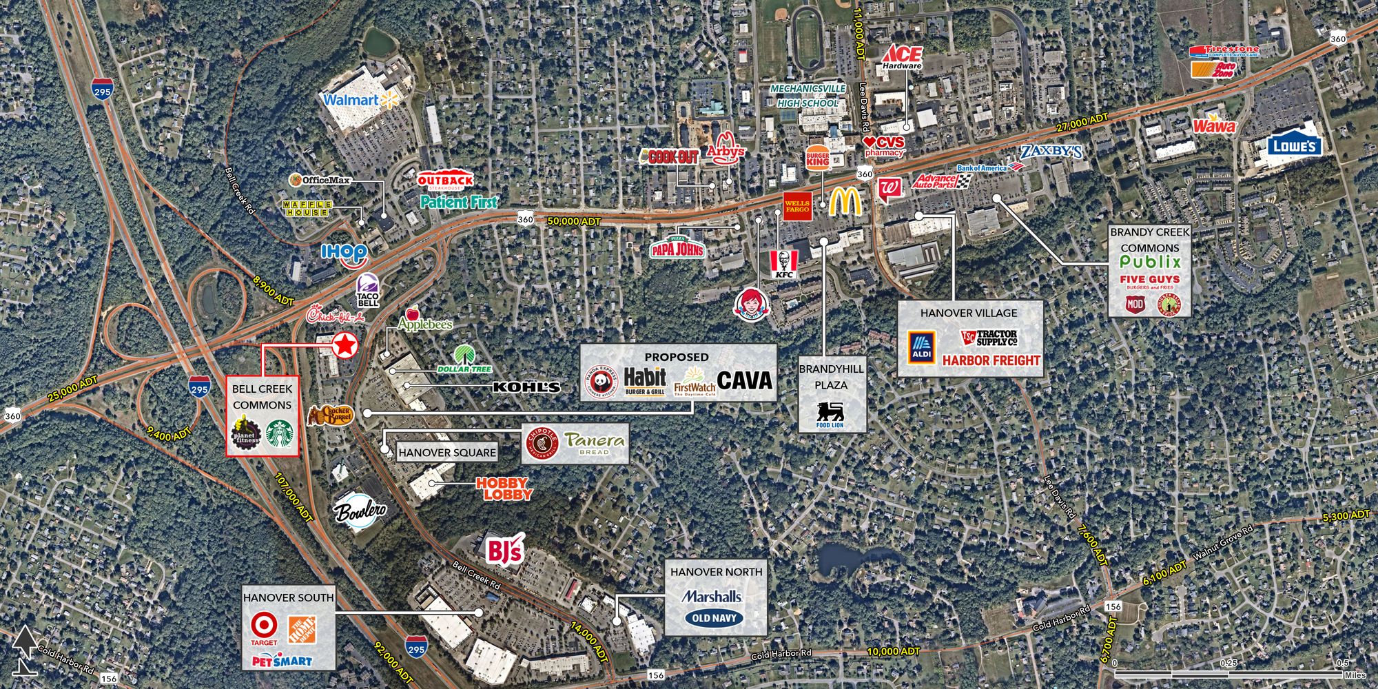 This property features: Prominent location at entrance of Hanover Square, the dominant shopping center in the trade area.; Excellent visibility to Bell Creek Rd, just off US Route 360 (Mechanicsville Tpke).; High traffic counts: 50,000 AADT on Mechanicsville Tpke and 14,000 AADT on Bell Creek Road.