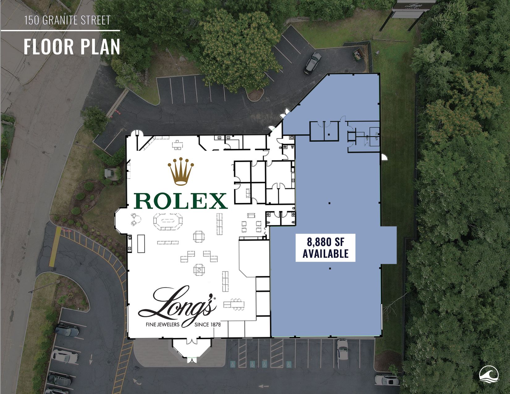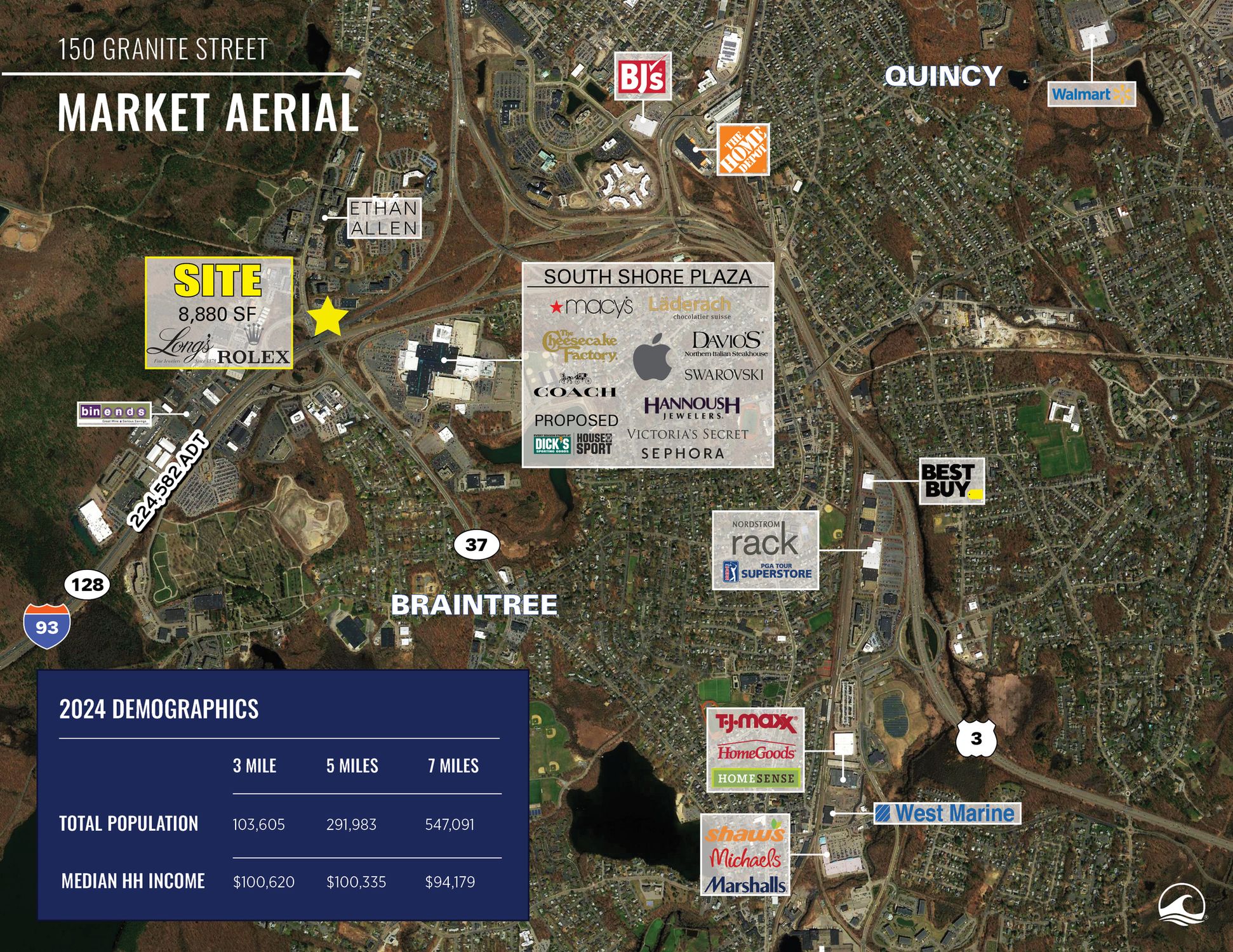 This retail space offers 8,880 square feet available for lease. The property benefits from signalized access off Granite Street and I-95 at Exit 6. It experiences high traffic volume, with 224,582 ADT on I-95, and offers great visibility from I-93. Pylon signage is available. Long's Jewelers is a co-tenant.