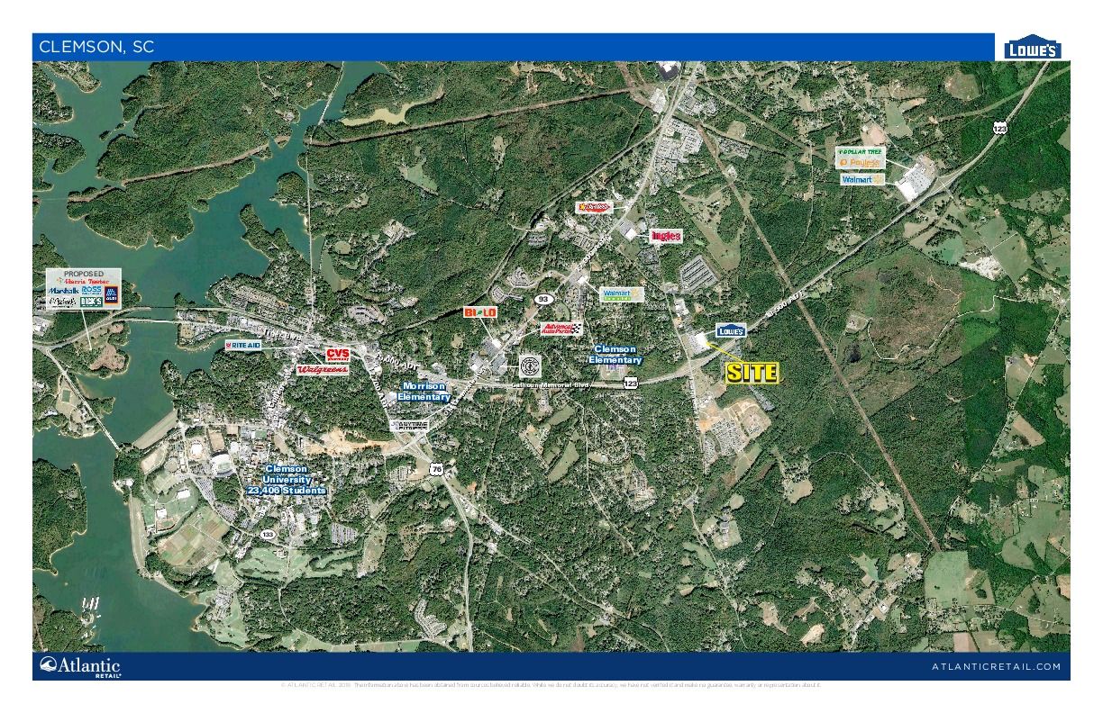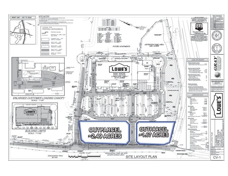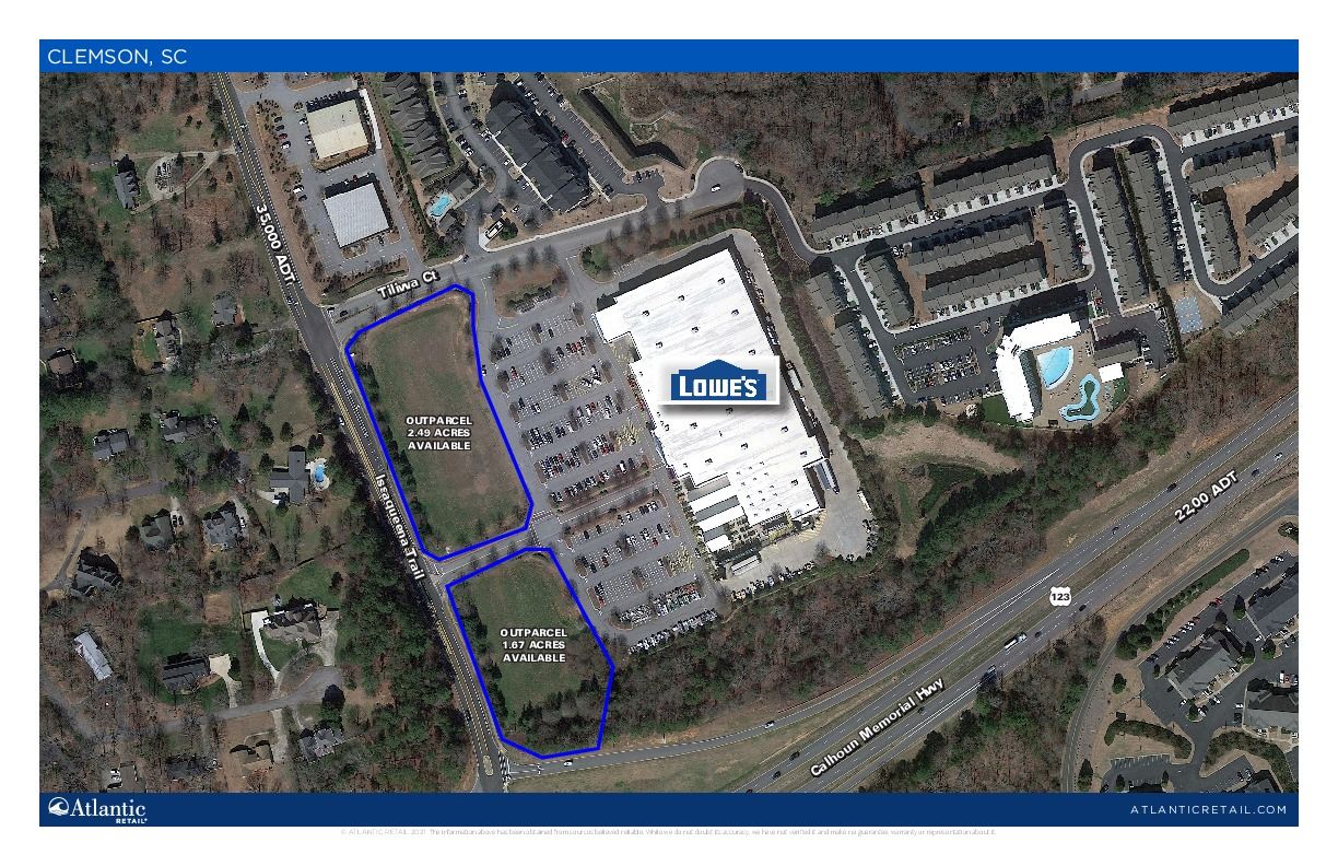 Available are out parcels of commercial land, sized at 1.67 acres and 2.49 acres. The property is located off Calhoun Memorial Highway and Issaqueena Trail in Clemson, South Carolina, with an Average Daily Traffic (ADT) count of 19,700.
