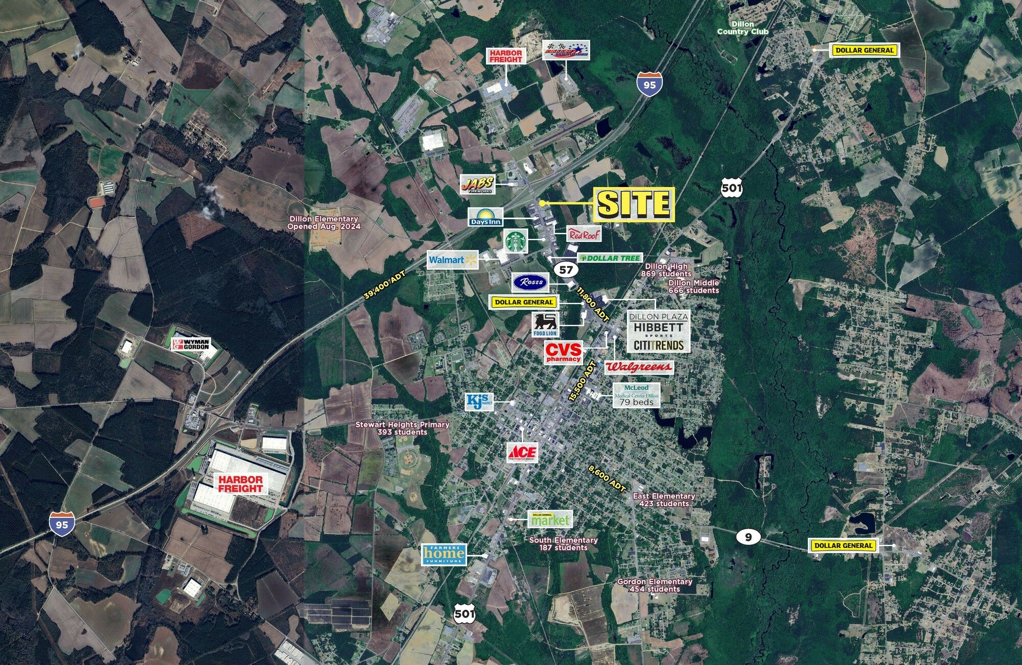 Located in Dillon, South Carolina, this site at 906 Radford Blvd offers a prime opportunity for retail or restaurant use. The property benefits from full access and high visibility from Interstate 95, which sees approximately 40,000 vehicles per day. Positioned as the first parcel off the interstate, it presents a significant opportunity for businesses to out-position quick-service restaurant competition. This location is the only significant interstate exit for approximately 22 miles in either direction. Nearby retailers include Starbucks, Zaxby’s, and Walmart.